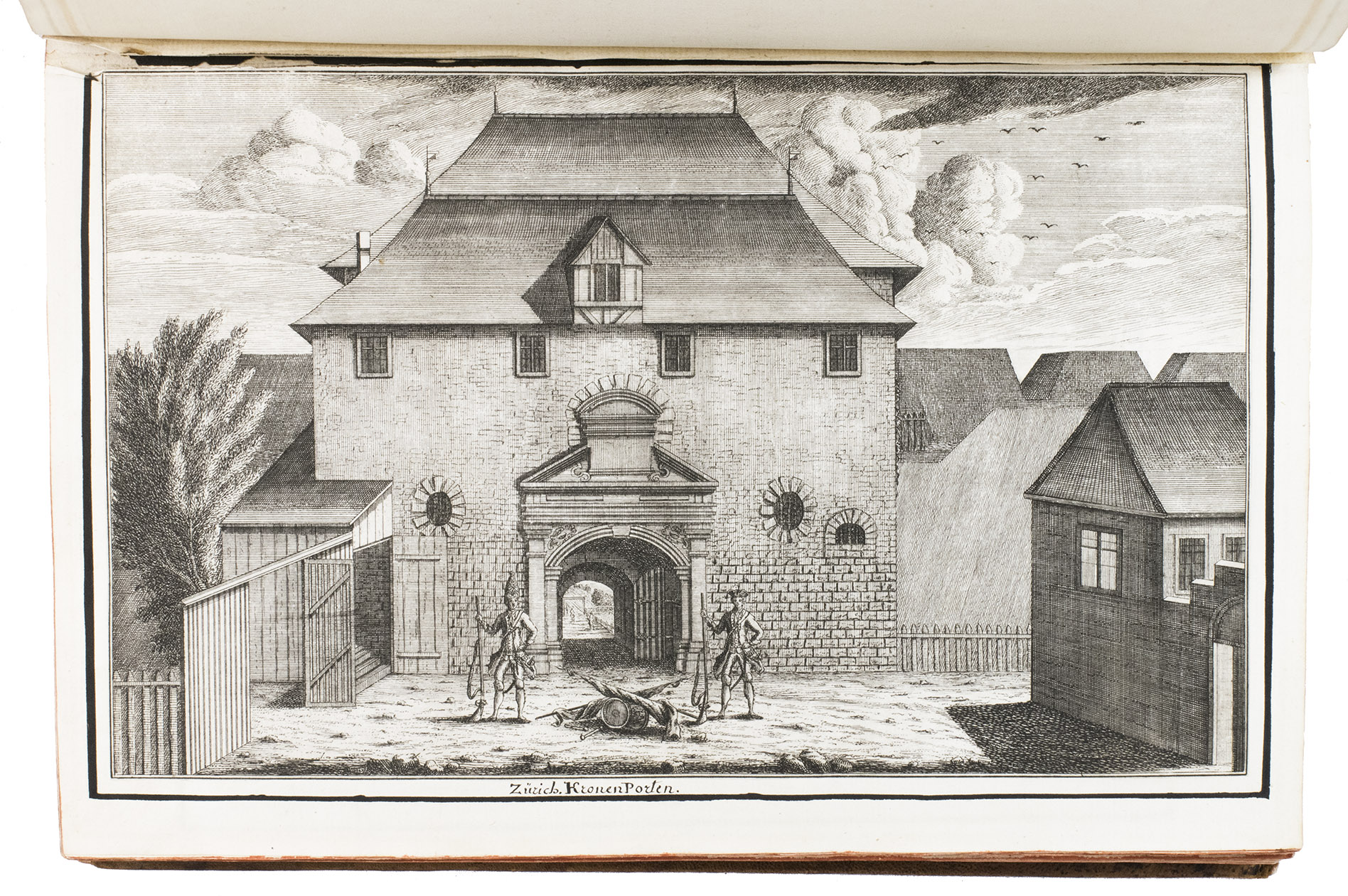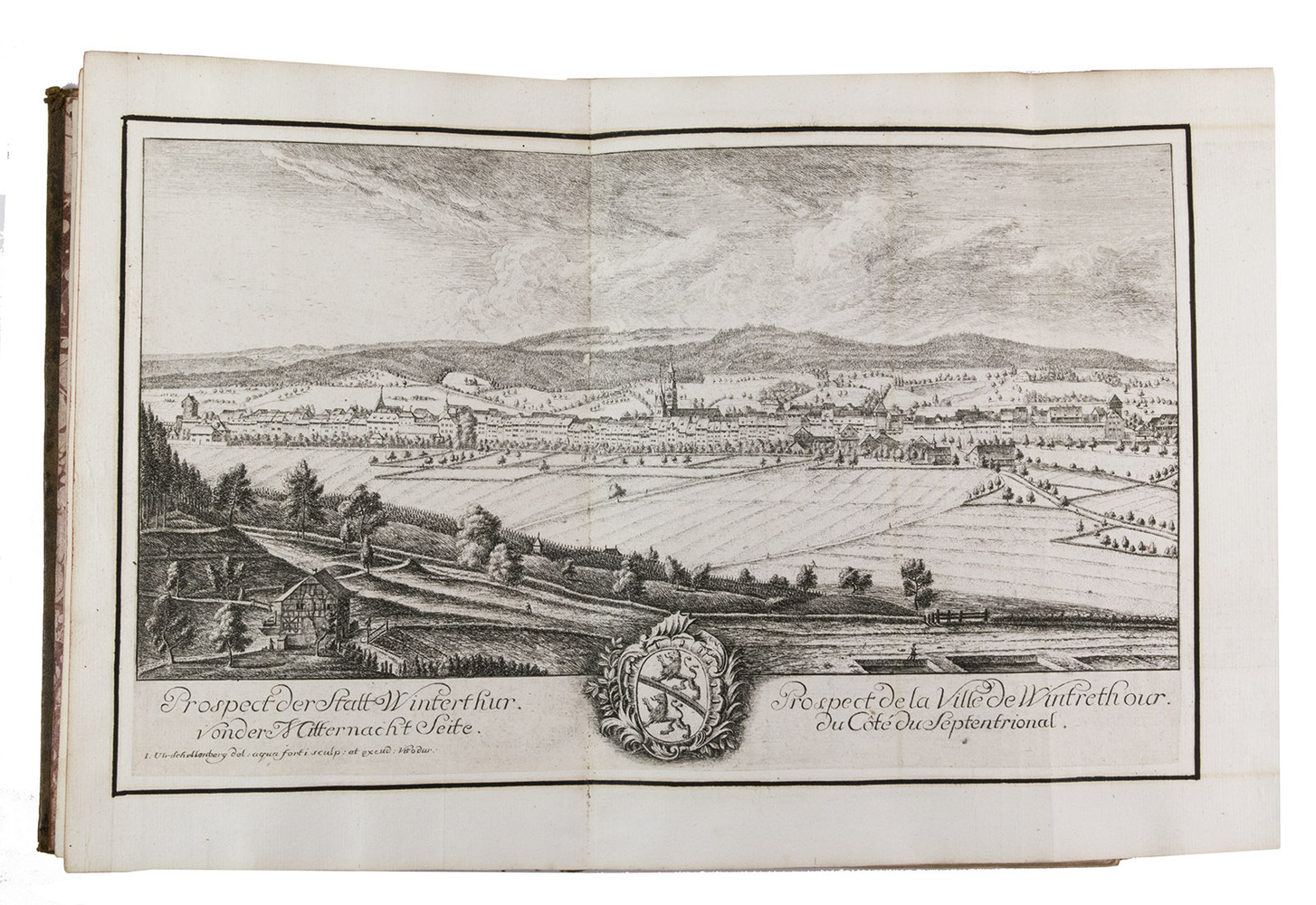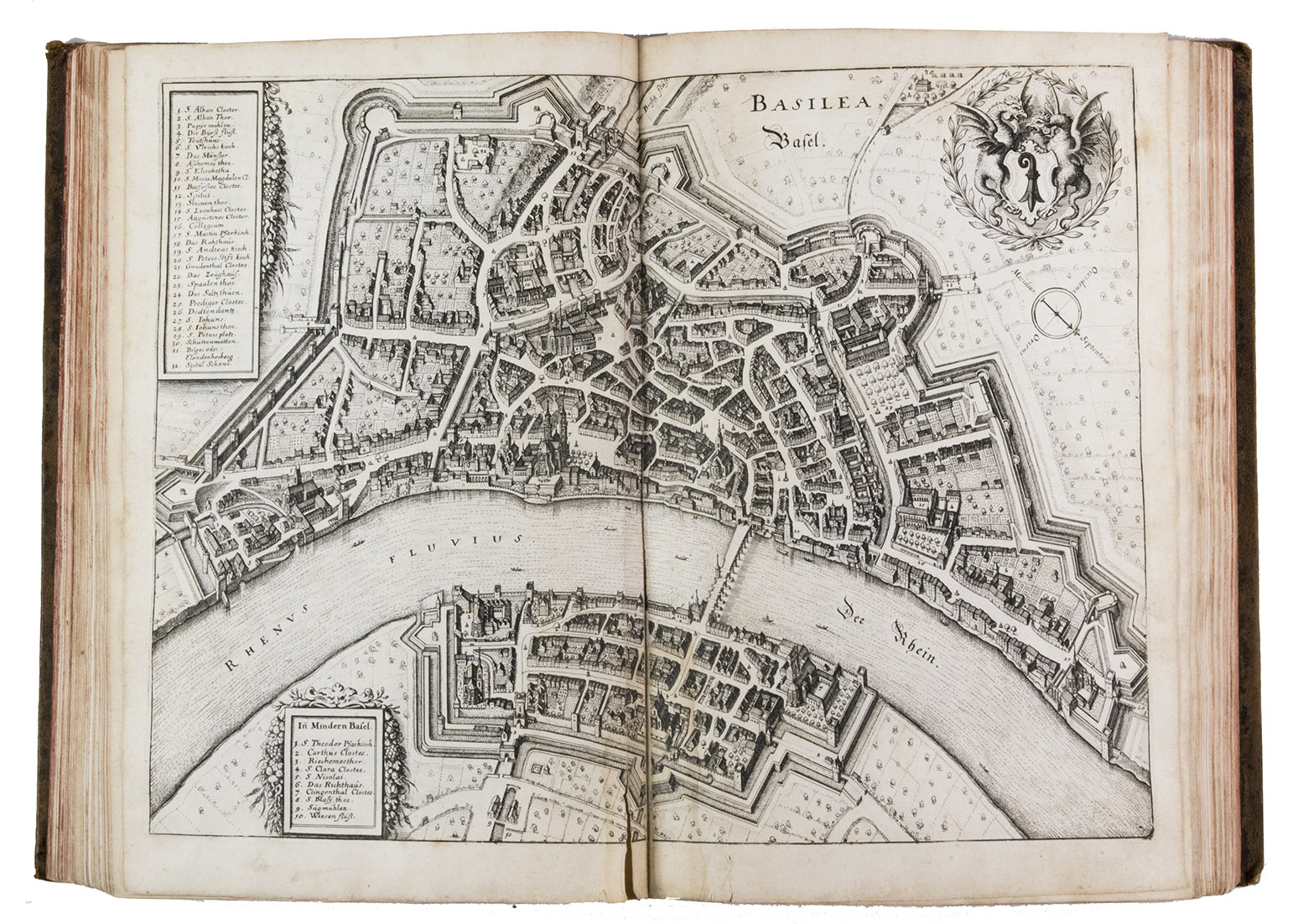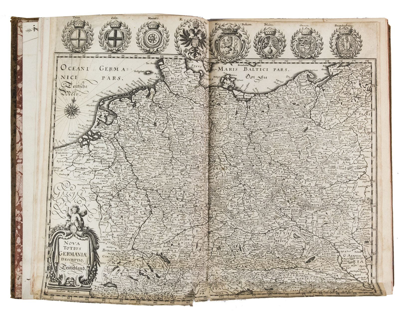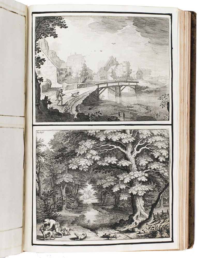 [Frankfurt am Main], Matthäus Merian, 1642. Folio. With richly engraved title-page, 74 (of 76) engraved maps, plans and views on 54 (of 56) plates normally included the 1642 first edition (nearly all double-page) plus 1 large folding plate from the 1653 Anhang, and 67 additional engravings from the 17th and 18th century, including at least 16 by or after Merian. Altogether there are 3 general maps (1 of Germany and surroundings and 2 of Switzerland), 4 detail maps, and numerous city plans and views. Lacking the bird's eye view of Herisau and the second of two views of Neuchâtel. Tanned sheepskin (ca. 1700?), gold-tooled spine. 72, [8] pp. plus engraved plates.