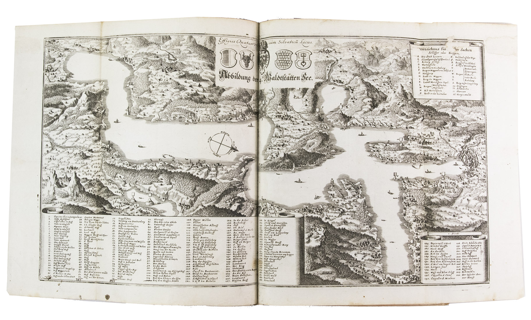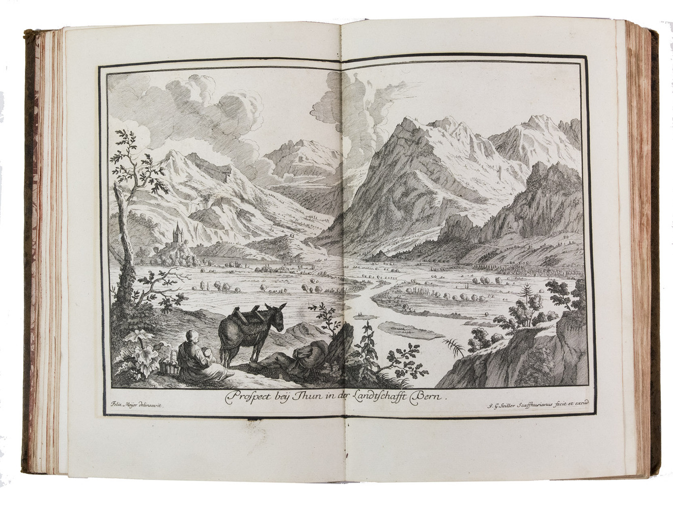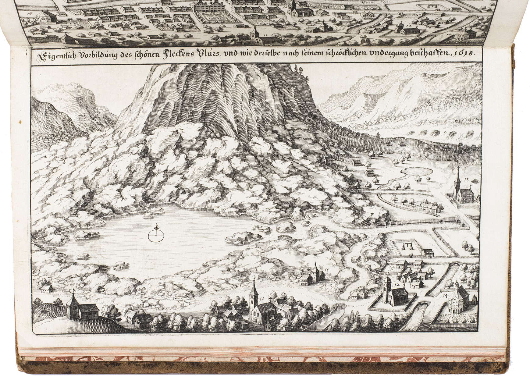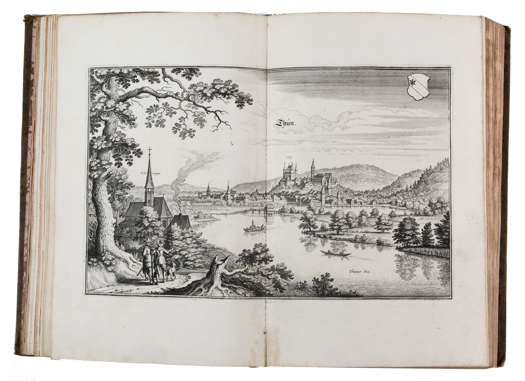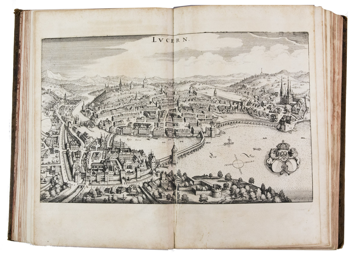 The folding plate from the 1653 Anhang shows the view of Vierwaldstättersee, number 36+ in Wüthrich's list. The 67 extra engravings from various sources, all related to Switzerland, were collected by Alb. Müller, who acquired the book in 1819. At least 16 of these 67 are also by or after Merian. They have been mounted on laid paper and inserted in the appropriate places.