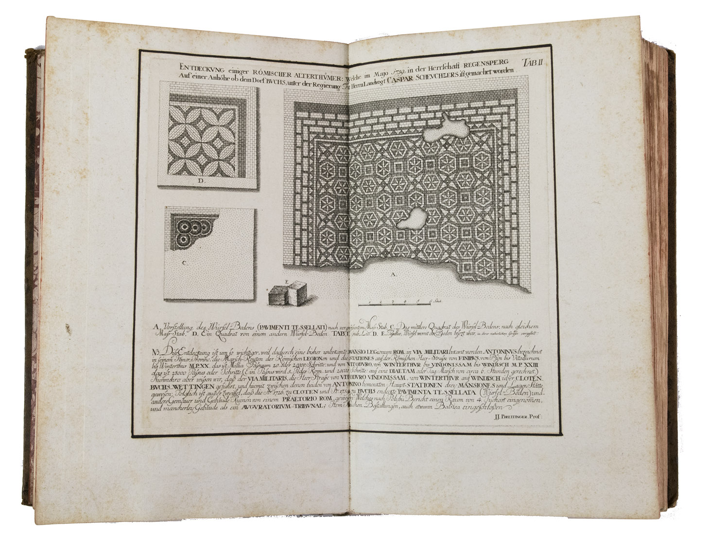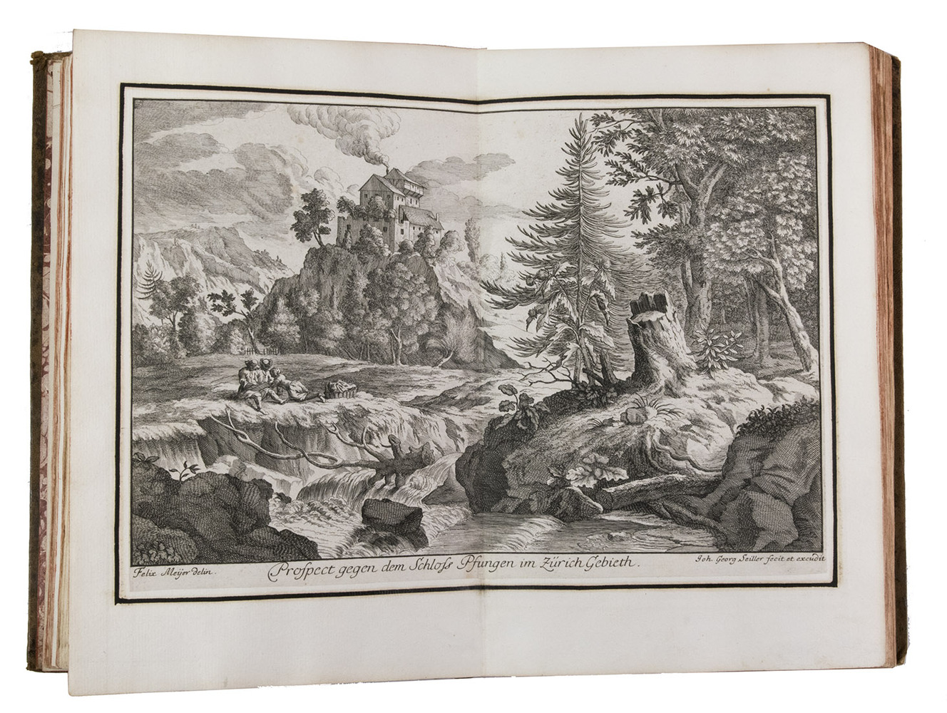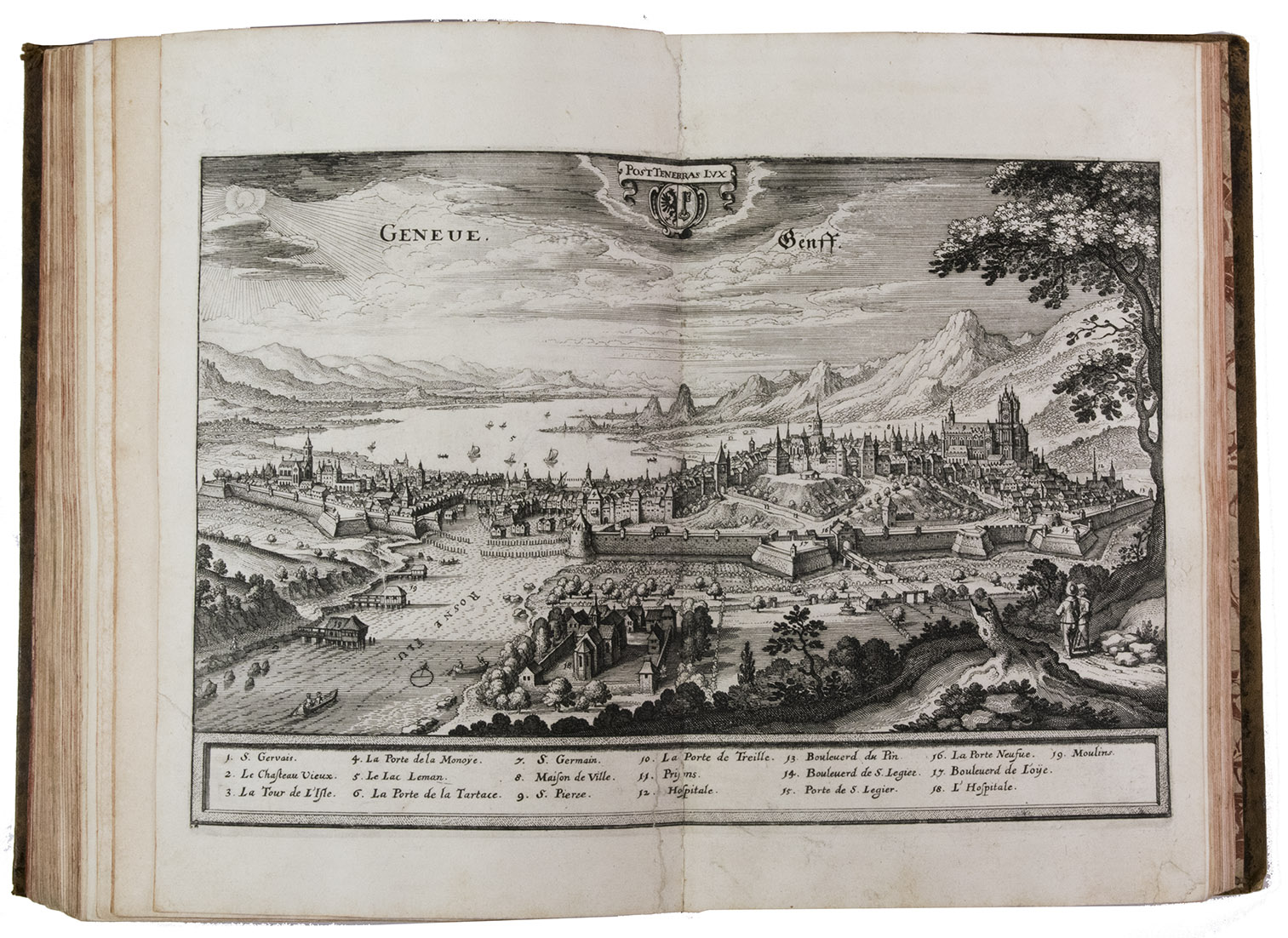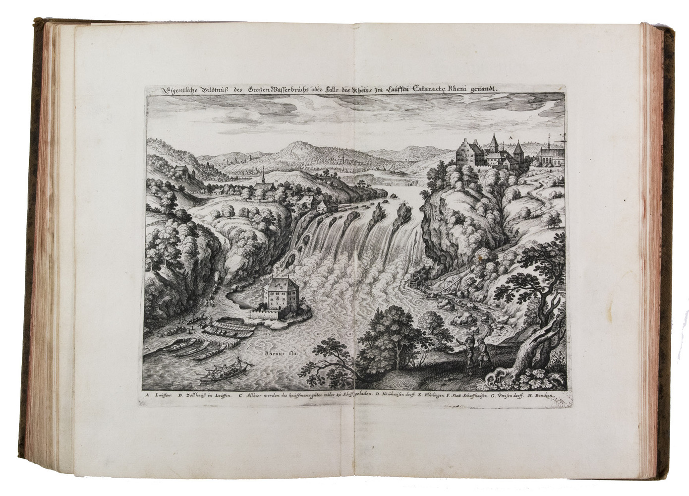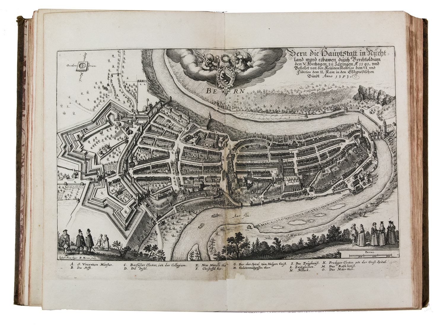 The folding plate from the 1653 Anhang shows the view of Vierwaldstättersee, number 36+ in Wüthrich's list. The 67 extra engravings from various sources, all related to Switzerland, were collected by Alb. Müller, who acquired the book in 1819. At least 16 of these 67 are also by or after Merian. They have been mounted on laid paper and inserted in the appropriate places.