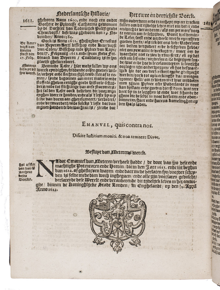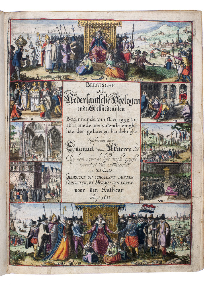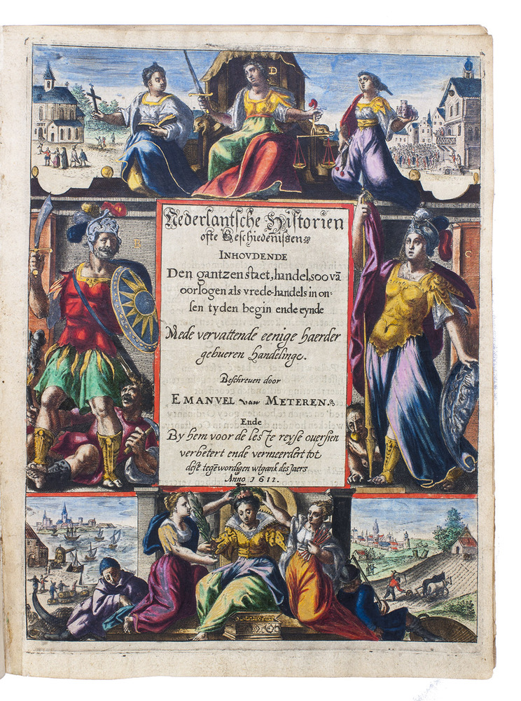 Extremely rare last and most complete issue of the 1611 4to edition (incorporating the author's last additions to early 1612) of a cornerstone of Dutch historiography, covering the history of the Low Countries from 1369 to early 1612, with a strong emphasis on contemporary history, especially the Eighty-Years War for Dutch independence from Habsburg Spain: "What the States Bible was for religion and Cats for literature, Van Meteren was for our historiography for a whole century" (Van der Heyden quoting Brummel). Emanuel van Meteren (1535-1612), a Dutch Reformed eye-witness to many of the events, took great care to uncover the facts and present them as objectively as possible, without polemics, something that brought him the wrath of both the Spanish court and the Dutch States General. He also wrote while the war was raging, leading him to continue revising and especially updating his text from the first authorized edition in 1599 to his death in 1612. This combined with the extremely complicated publishing history of his politically controversial book to generate a wide array of editions and issues that still demand further study.