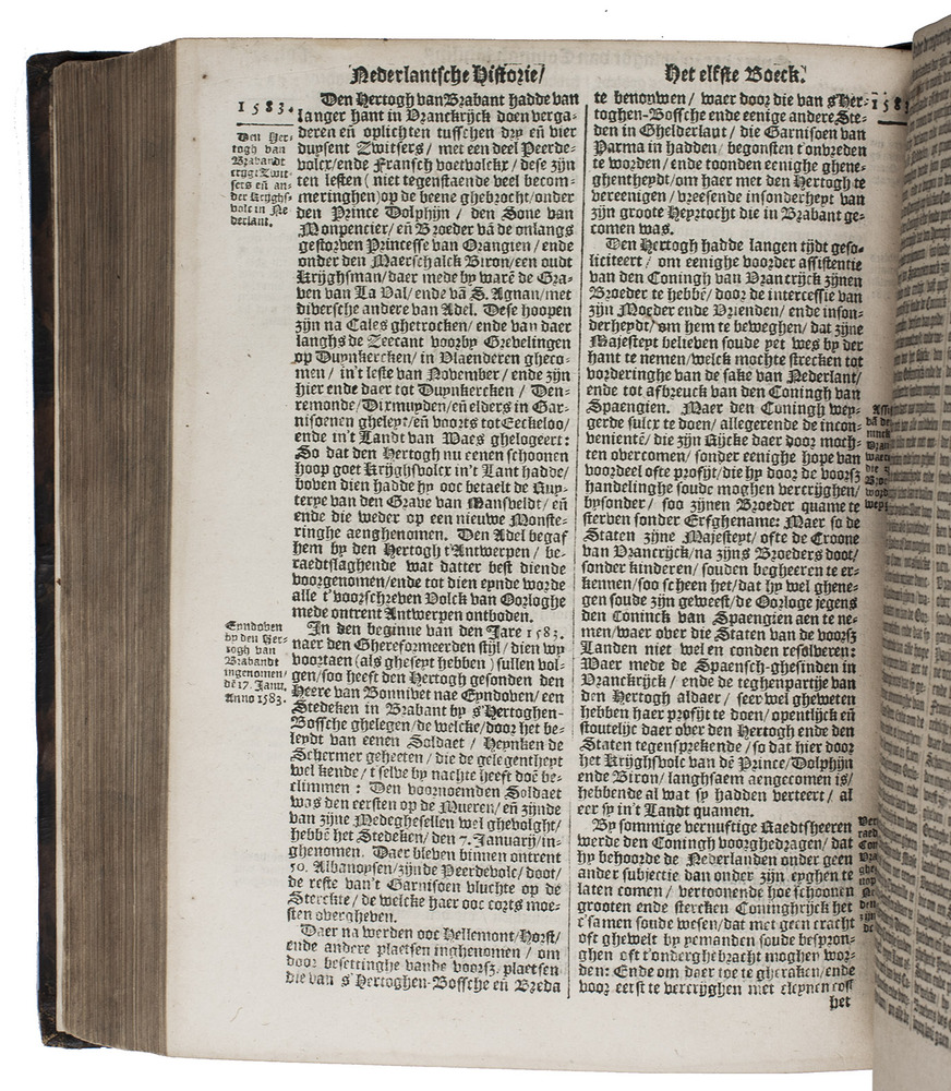 Typographically, the most remarkable feature of the present edition is the introduction of a new style of textura gothic type that was to set the standard for the Republic's texturas, used at this time for most works in the Dutch language. Most of the book is set in the 16th-century Descendiaen textura cut by Hendrick van den Keere in Ghent. But in volume 1, beginning with 4 pages in quire 2A, a new Descendiaen textura appears , clearly modelled on Van den Keere's but with baroque curls added to several of the letters and a few other distinguishing features. The old and new type appear together not only in the same quire or sheet, but even in the same forme. The printing office apparently acquired the new type while the book was in press but continued using the old one as well. The 6-line note of Van Meteren's 1612 death is set in a slightly larger Mediaen size in the new style, also its earliest known use. These new types of the 1610s served as the models for the textura types of Christoffel van Dijck and directly or indirectly for nearly all textura types of the Dutch Republic up to and including those of Fleischman in the 1740s and beyond. While the book's printer certainly had no symbolic significance in mind, it seems poetically appropriate that he set this great work about the birth of the independent Dutch Republic in the first printing type to establish an independent style for the Dutch golden age.