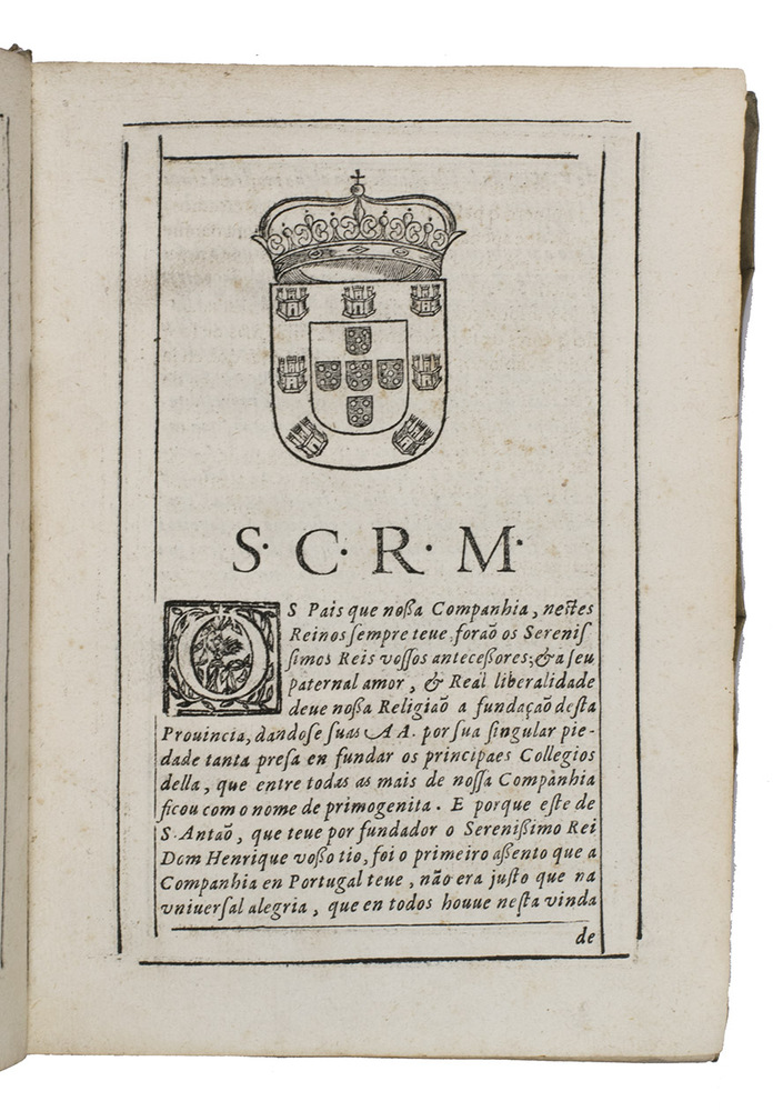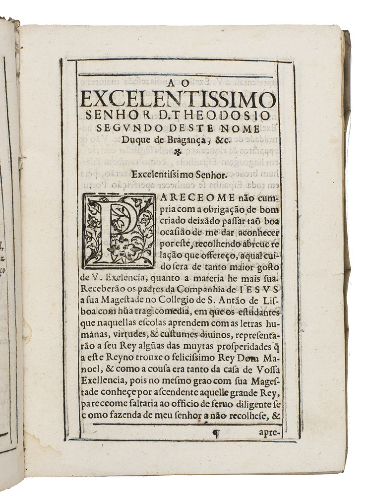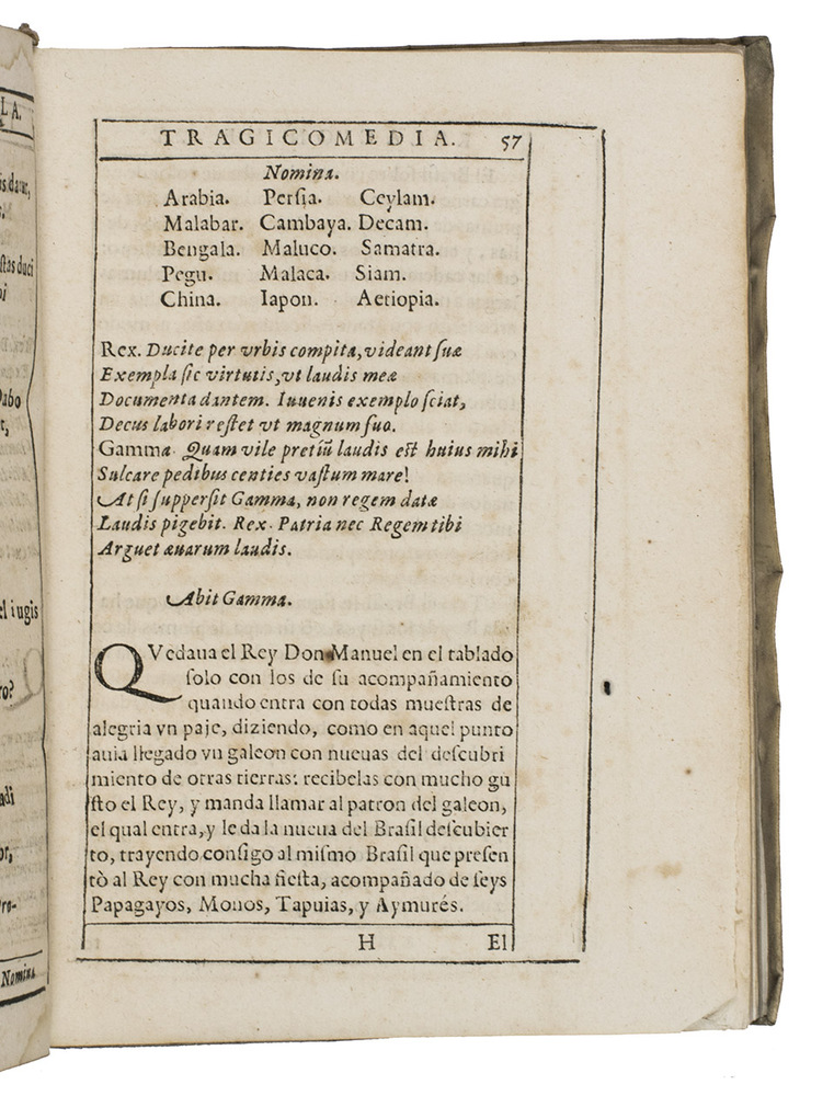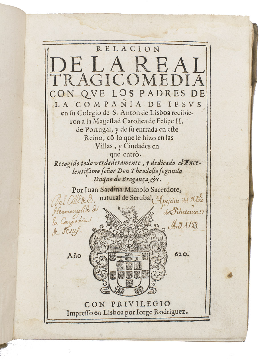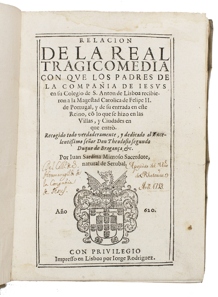 First and only edition of a captivating account of a tragicomedy play, written by João Sardina Mimoso, a priest from Setubal near Lisbon. It is a detailed account in Spanish, Portuguese and Latin, of an early play on the discovery of Brazil by the Portuguese, which was originally written by Antonio de Sousa (ca. 1591?-after 1619), who was a Jesuit. "Included is a section in which a ship captain announces the news of the discovery of Brazil. He has with him Tapuia and Aimore Indians, parrots and monkeys. They all sing a Chorus Brasilicus, in Portuguese and Tupi. Next there is a dialogue between the King (Manuel I of Portugal), who speaks Portuguese, and a monkey who speaks alternately in Portuguese and Tupi." (Borba de Moraes). King Manuel I of Portugal (1469-1521) began the Portuguese colonisation of the Americas and Portuguese India, and oversaw the establishment of a vast trade empire across Africa and Asia. This was made possibly by his sponsorship of numerous renowned Portuguese explorers and navigators, including Vasco da Gama, Pedro Álvares Cabral, and Afonso de Albuquerque.