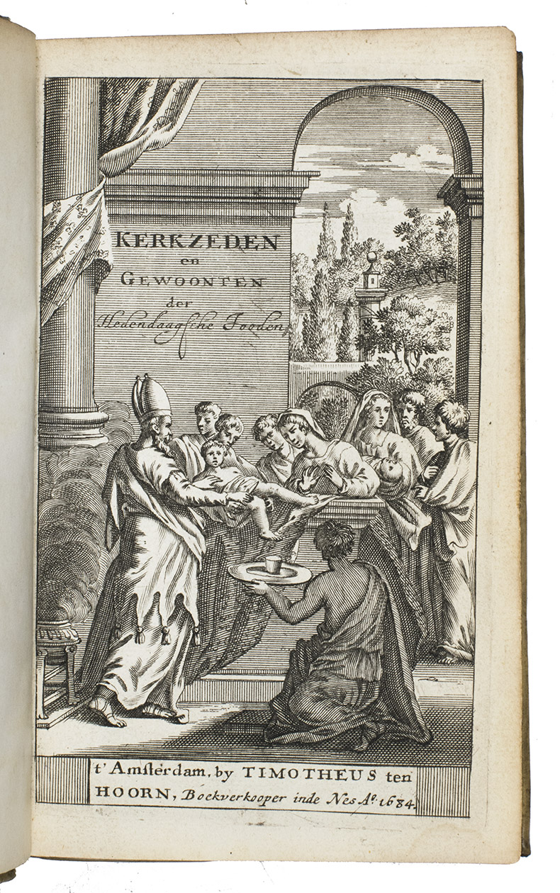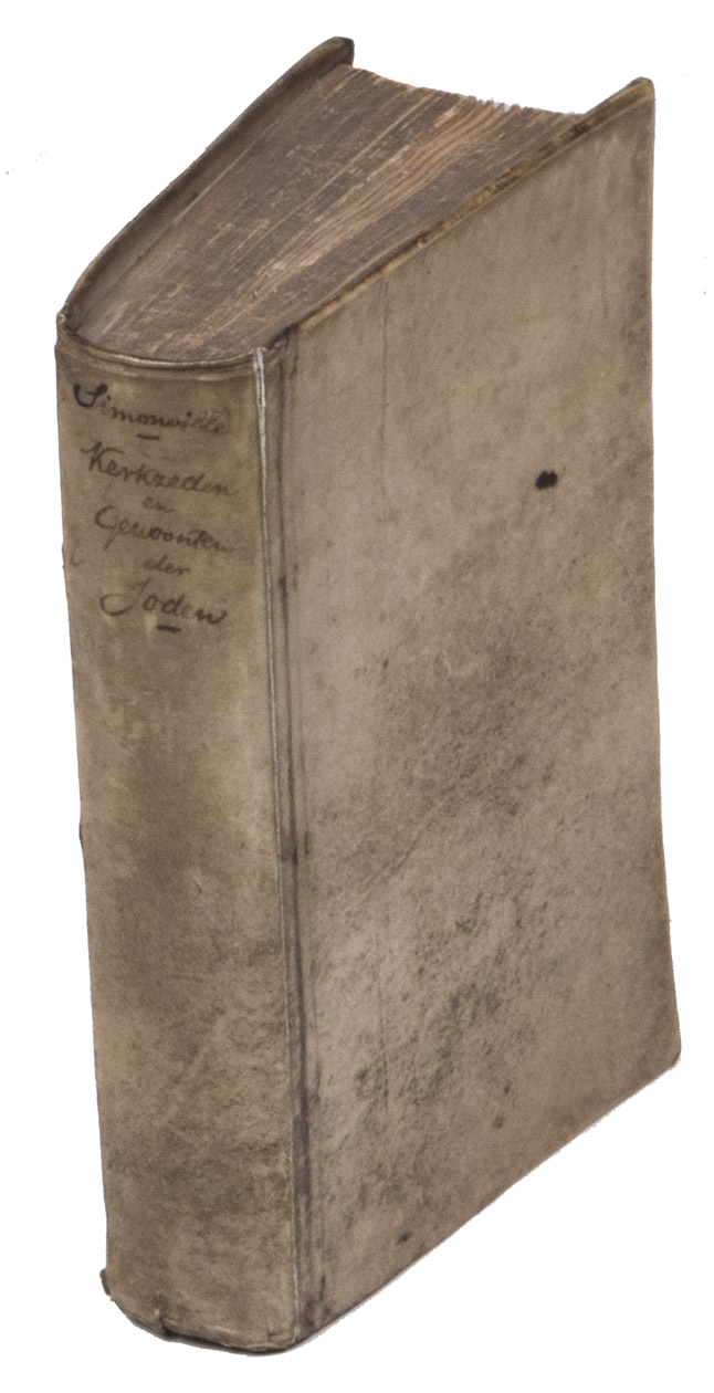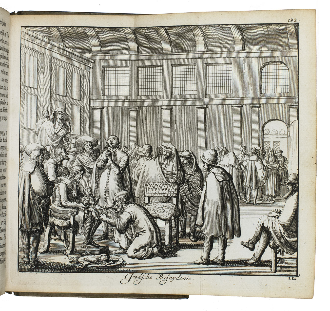 Including: Richard SIMON; Abraham GODART (transl.). Vergelyking der Joodsche ceremonien of kerk-zeeden. ...2 works in 1 volume, issued as 1. 8vo. With an engraved frontispiece, dated 1684, of a circumcision and 4 folding engraved plates. Also with woodcut vignettes on the title pages and woodcut initials. Contemporary vellum, manuscript title on spine. [64], 200, [10]; 201 [=203], [4] pp.