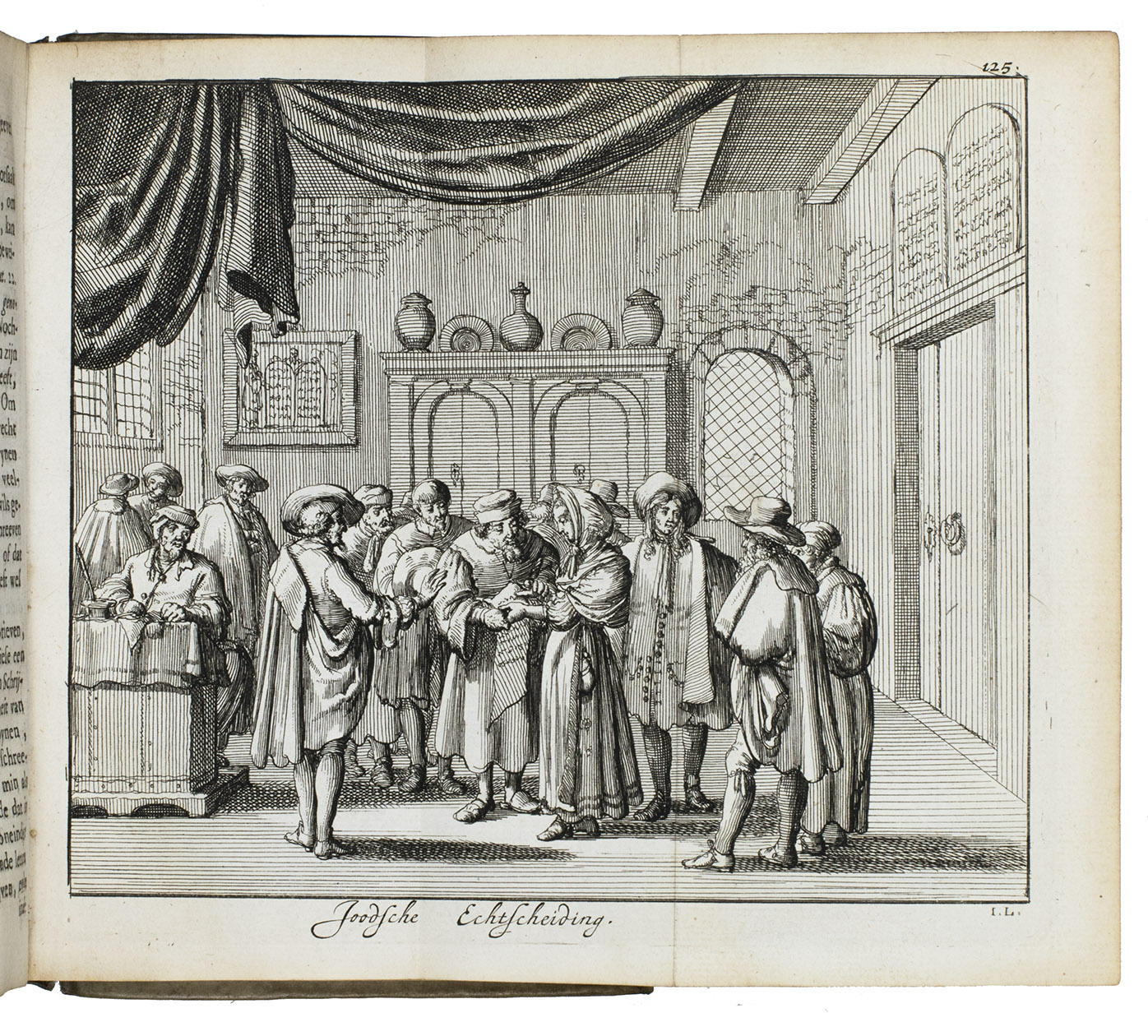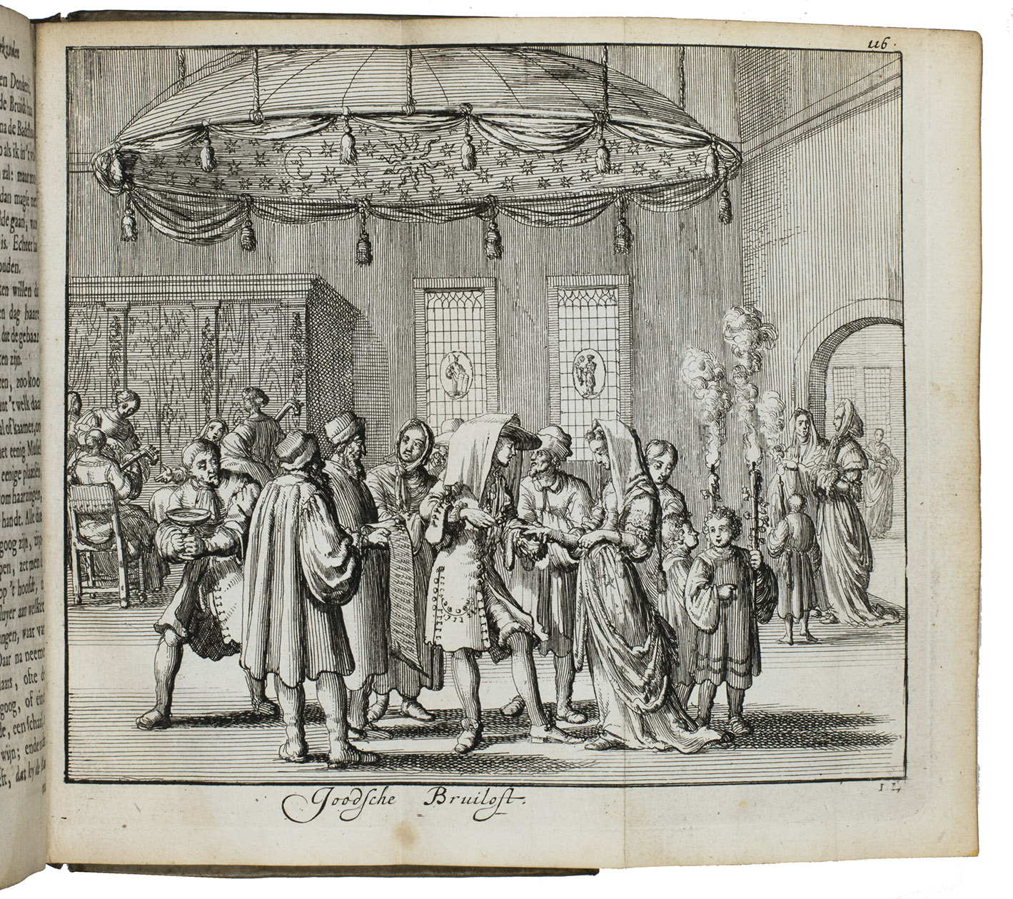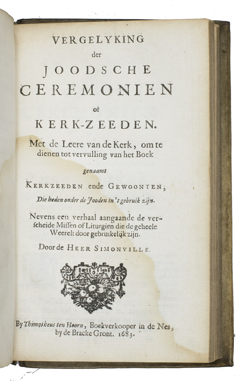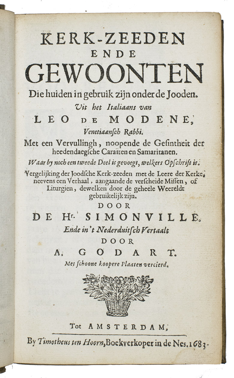 First edition of the Dutch translation of Léon de Modenes Historia degli riti hebraici (1637). The translation was made by the minor Utrecht poet Abraham Godart (fl. 1666-1683) after the French translation which had appeared in 1682 in The Hague (Céremonies et Coustumes ... parmi les Juifs, The Hague, Adriaan Moetjens, 1682) and which was made by Richard Simon (1638-1712), a French priest, member of the Oratorians, who was an influential biblical critic, orientalist and controversialist - Simon was early at odds with the Port-Royalists and Antoine Arnauld himself - using many pseudonyms such as here the pseudonym Simon Ville.