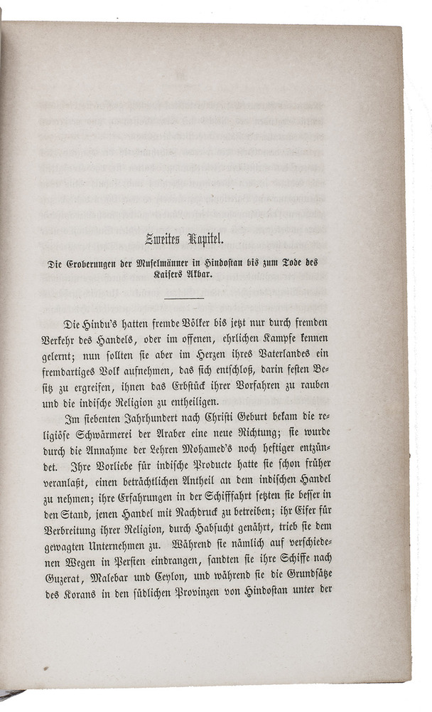 Second edition of a history of the colonial activities of the British East India Company, the Dutch East India Company (VOC) and the Portuguese in the East Indies, written by Philipp van Mökern, a merchant who lived in India for fifty years. The work is divided into two parts, with a total of 32 chapters. Van Mökern starts with a history of India, it's inhabitants, religion, art and science post Alexander the Great. Another chapter is devoted to various Muslim conquests in India and surrounding areas, the spread of Islam, and some of the first emperors of the Mughal Empire. The majority of the chapters deal with the Indian trade, the role of the Portuguese, the British and the Dutch in the East Indies, the shifts in power, the relations with the colonists and the native inhabitants, etc. Chapter 14 is devoted to the lives of Muslims in India in the early 19th century. Some chapters in the second part describe Mysore under Tipu Sahib (1750-1799) and the Anglo-Mysore wars.