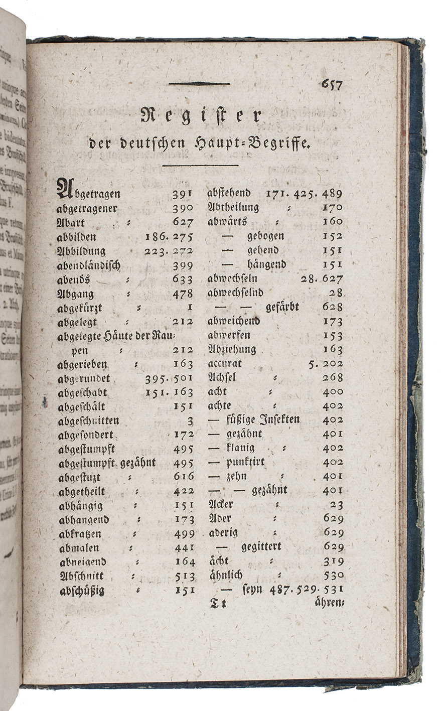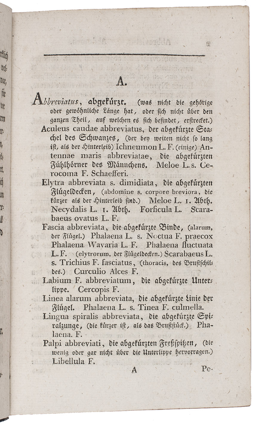First edition of an entomological dictionary, compiled by Christian Heinrich Möller. It lists the Latin nomenclature of numerous words commonly used when describing insects, followed by their German translations. The book opens with an introduction and closes with a register.