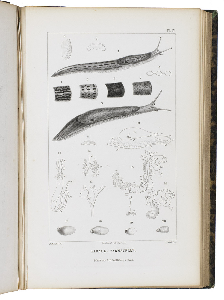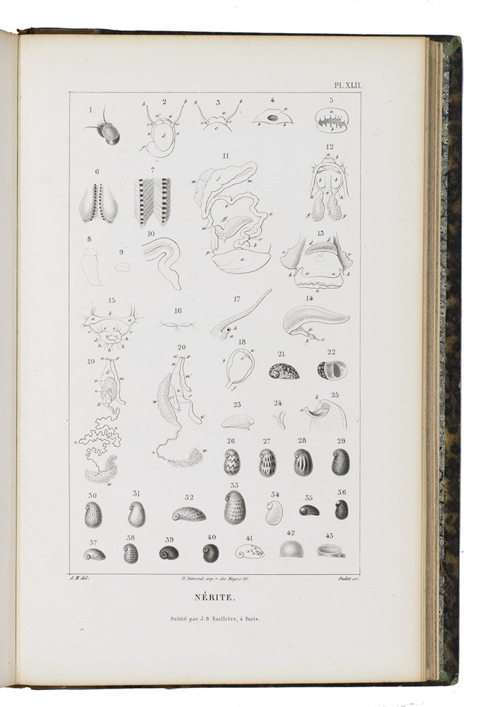 The two main volumes present all known families and species of molluscs in France at the time of writing. Moquin-Tandon provides a detailed description of each sort, their shapes, physical attributes and habitats. The atlas volume depicts shells and living animals as well as their radulae, genitals, sensory organs and nervous systems. Each plate depicts one type of mollusc and its various subspecies. Alfred Moquin-Tandons Histoire naturelle des mollusques ... de France set the standard for the description as well as the depiction of molluscs due to his taxonomic accuracy and the level of detail in the plates. The 54 uncoloured plates were printed by Rémond using his fine and detailed printing technology.