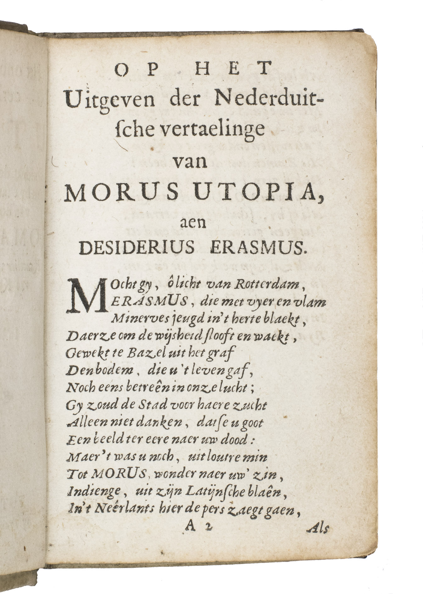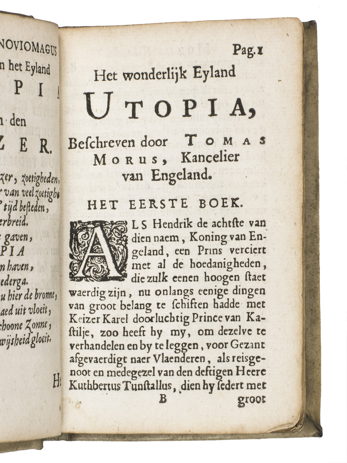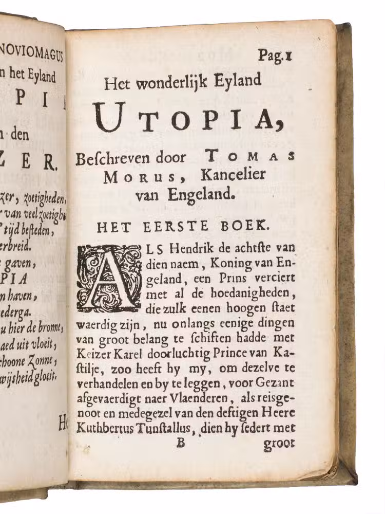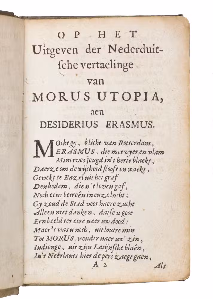 Utopia, written by Thomas More (1478-1535), is closely connected to the Low Countries. Not only is it partly situated there, but the first edition, written in Latin, was also published there in 1516. Nevertheless, the first Dutch translation only appeared in 1553. It was reprinted - in different Protestant and Catholic versions - until Van Hoogstraten made his translation. It was only then that the work truly started to capture the Dutch imagination. The work itself sets out an ideal political society. It was "a tract for the times, to rub in the lesson of Erasmus; it inveighs against the new statesmanship of all-powerful autocracy and the new economics of large enclosures and the destruction of the old common-field agriculture, just as it pleads for religious tolerance and universal education" (PMM).