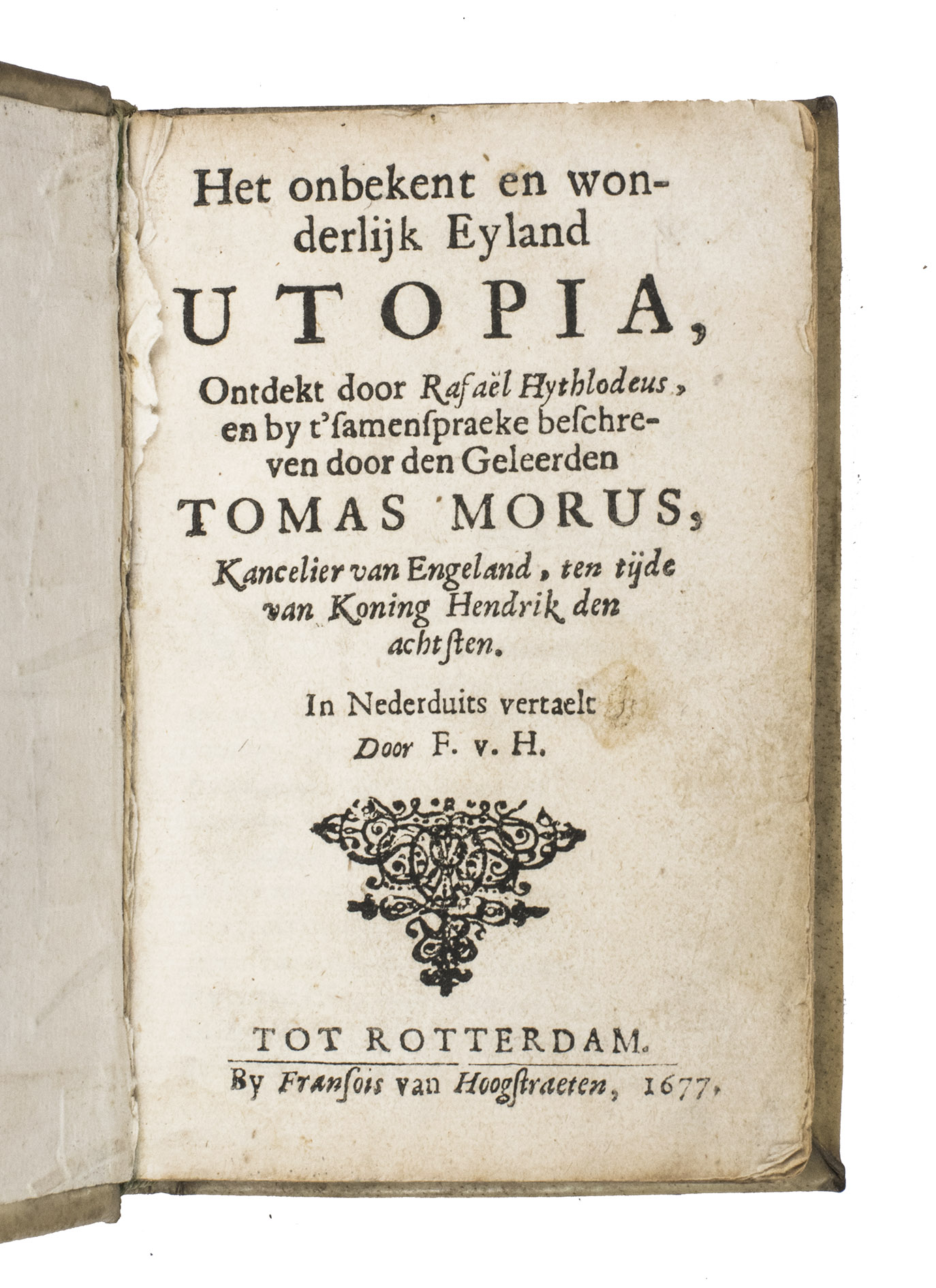 The vellum is somewhat soiled, with traces of paraffin wax on the back. Lacking the first free endpaper, the free endpaper in the back is somewhat creased and torn. Otherwise in good condition. Buisman 1665; STCN 840093349 (9 copies); Waller 1237; cf. Bunge, W. van., "Het onbekent en wonderlijk Eyland: Frans van Hoogstratens Translation of Utopia (1677)", in: The Oxford handbook of Thomas More's Utopia , 2023, pp. 295-306; Printing and the mind of man 47.
