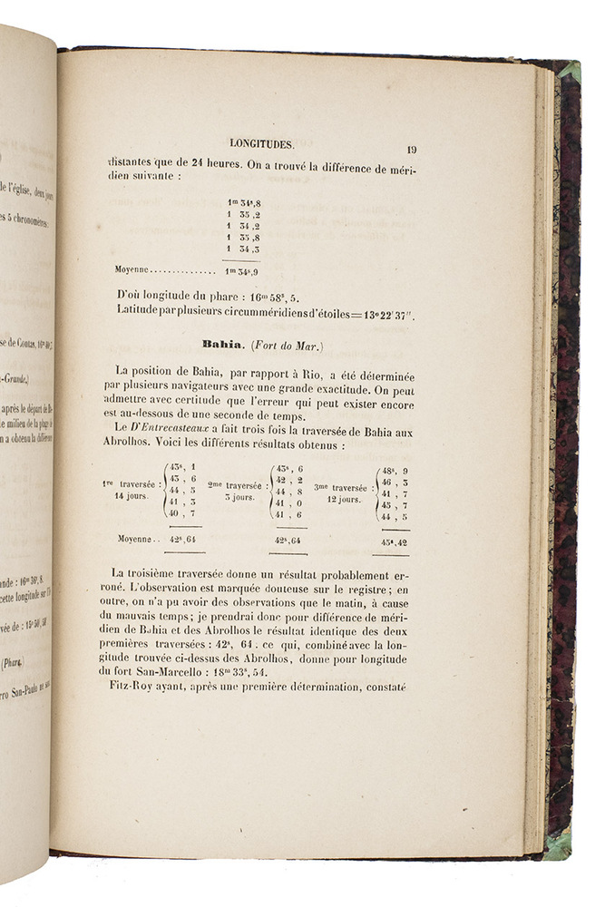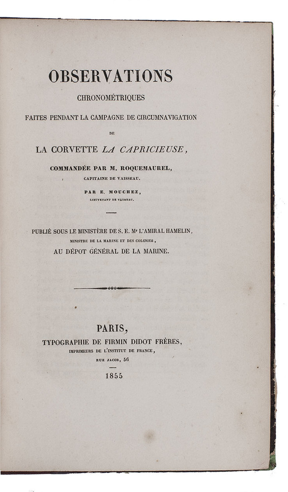 First edition of an important treatise on chronometry by Ernest Barthélémy Mouchez, who sailed as French astronomer, geographer and naval officer in the Capricieuse commanded by Roquemaurel. In his work he tried to improve surveying technique and he promoted the use of stationary observational instruments by the navy. The work contains extensive technical and methodological information on chronometry and the use of chronometric instruments, followed by observations made during the Capricieuse's circumnavigation with detailed notes on the Pacific (Marquesas Islands, Tahiti), Cochinchina, the Sunda Islands, and the coasts of China and Korea. Bound with two other valuable essays resulting from scientific expeditions along the coast of South America, notably Brazil, with the object to map the region more precisely. The second work for example discusses the longitudes of principal points along the Brazilian coast which would be used for a new map of the coastal line of Brazil, among others Paranagua, Cabo Frio, Ilhéus, Camamu, Morro de São Paulo, Bahia, Fernando de Noronha and Céara. It was extracted from Annales hydrographiques, 1863.