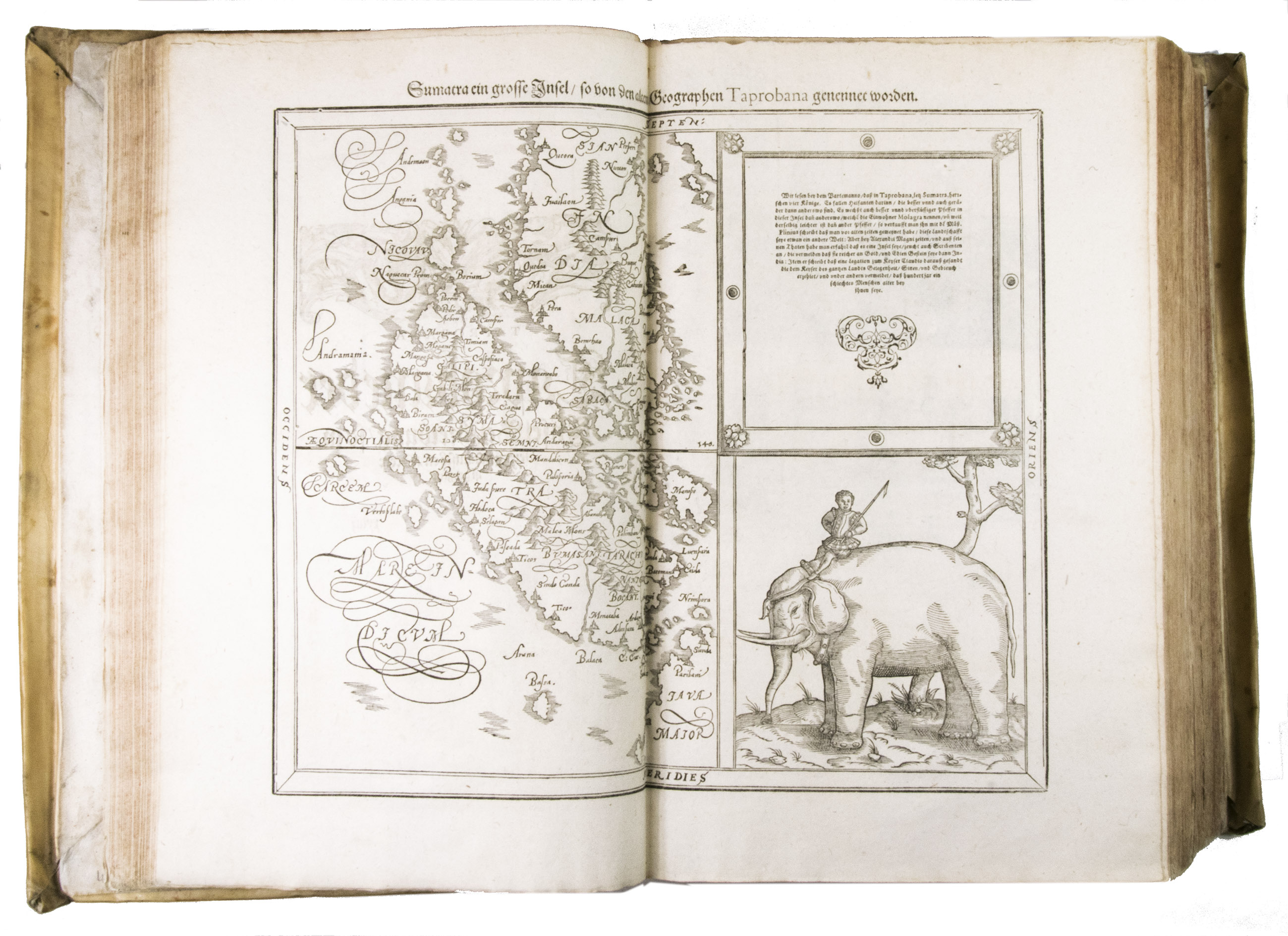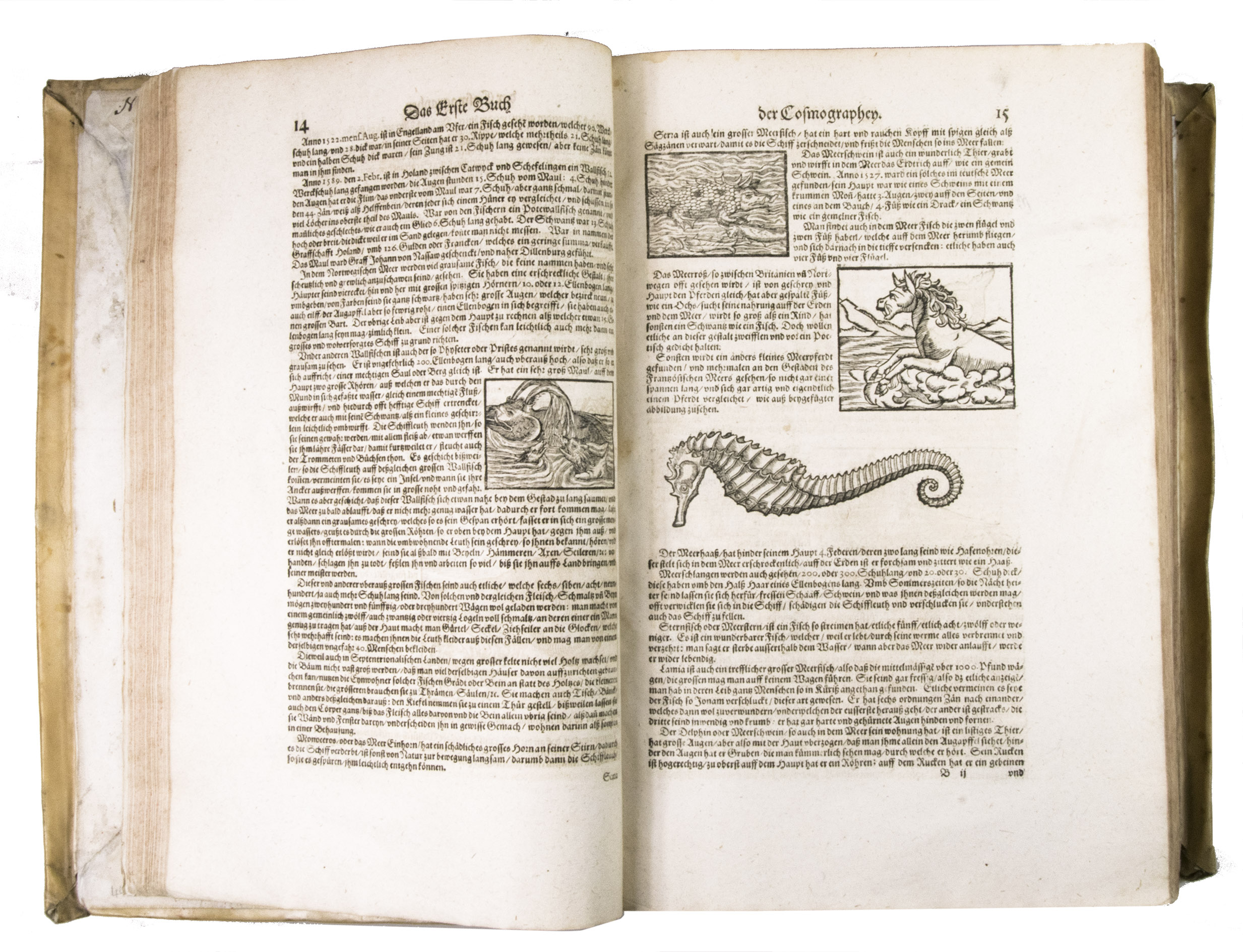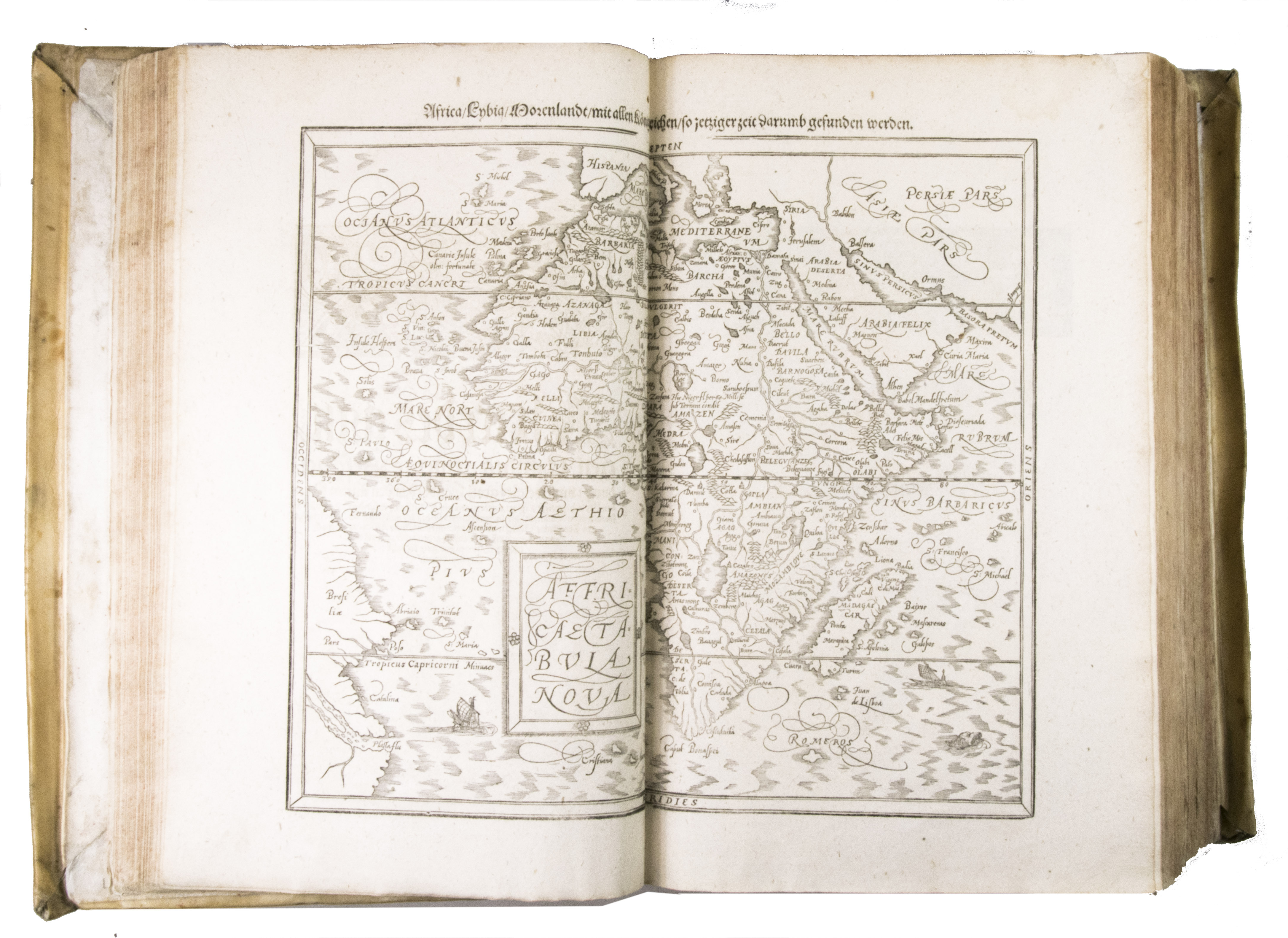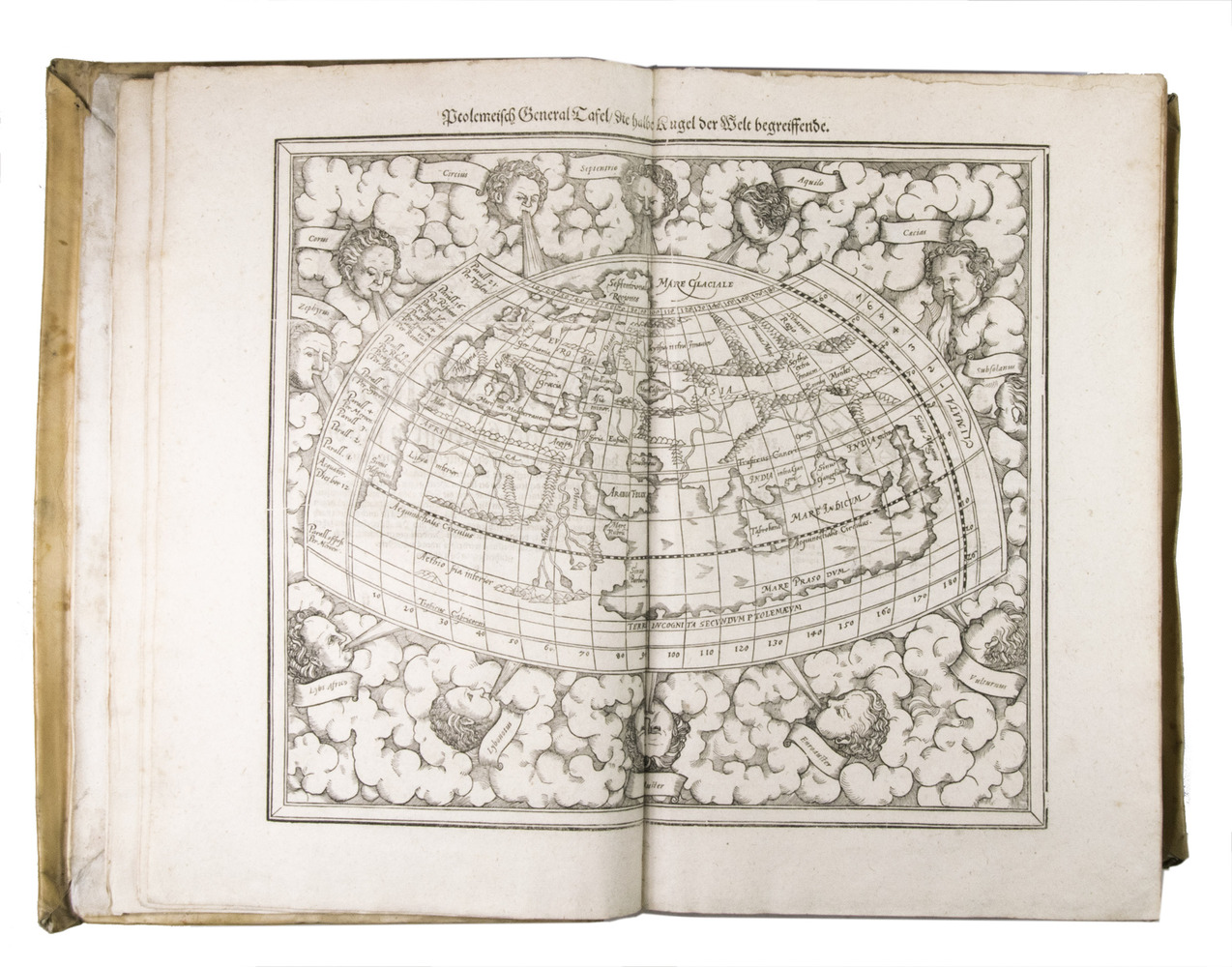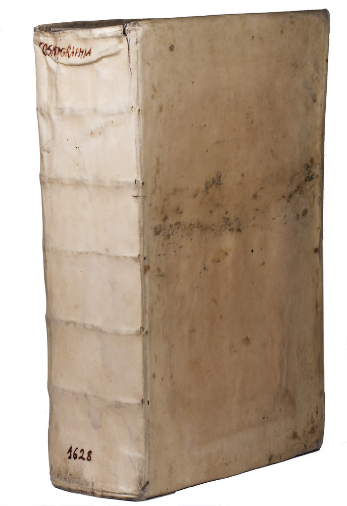 Basel, heirs of Sebastian Henricpetri, 1628. Folio (38 x 24.5 cm). With engraved title-page, letterpress title-page printed in red and black with woodcut portrait of Münster on the back, 26 numbered double-page woodcut maps on inserted bifolia, 72 double-page woodcut maps, plans and views on integral leaves, and about 1500 woodcut illustrations in the text (including repeats) showing maps, plans, views, plants, animals, monsters, etc. Contemporary vellum. [24], “1752” [=1748] , [12] pp.
