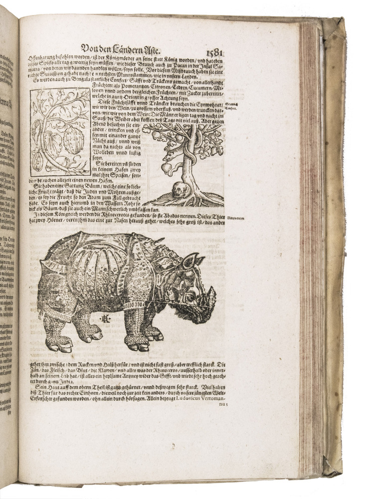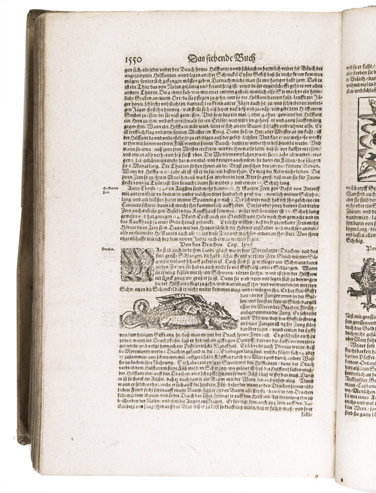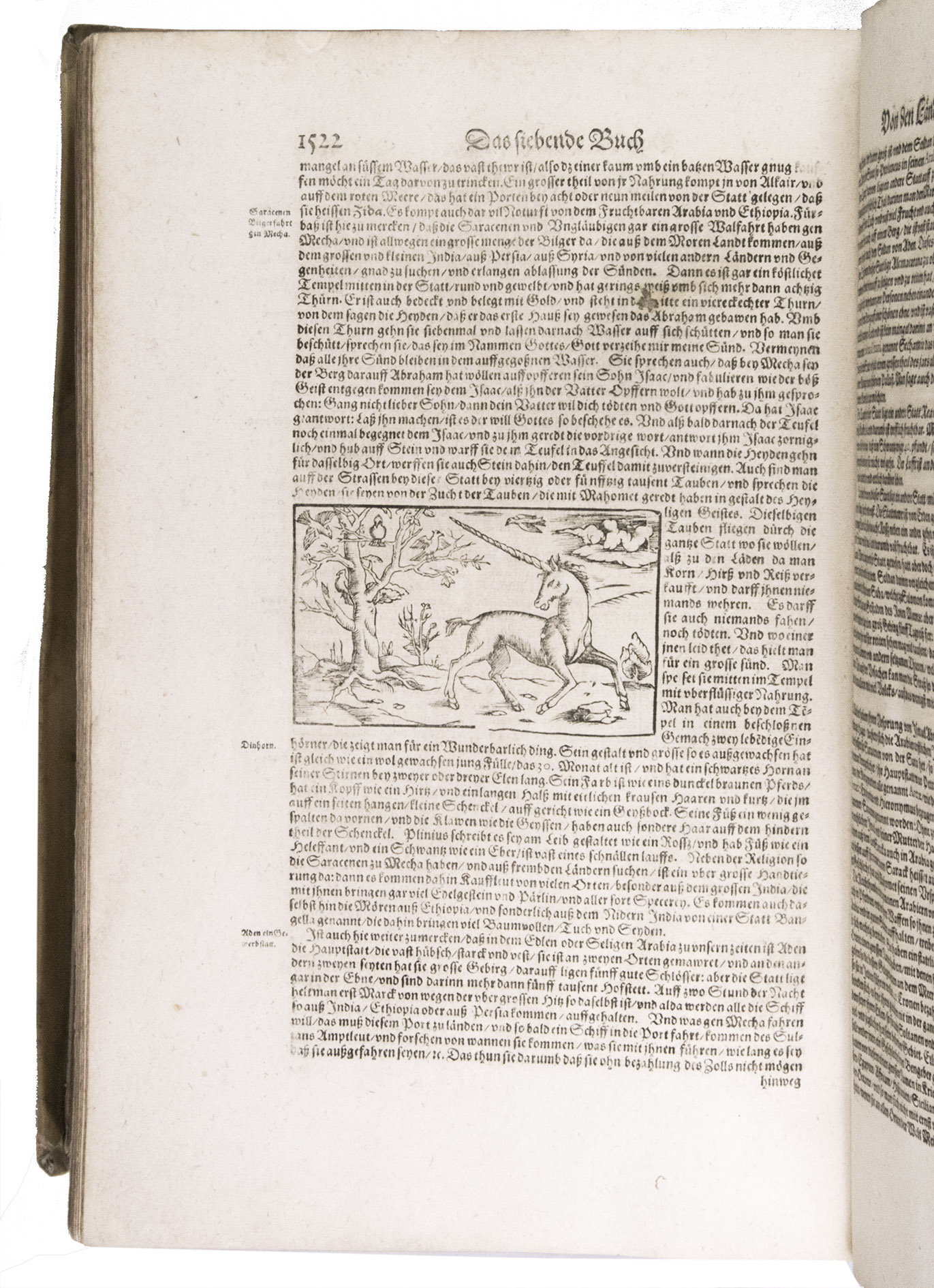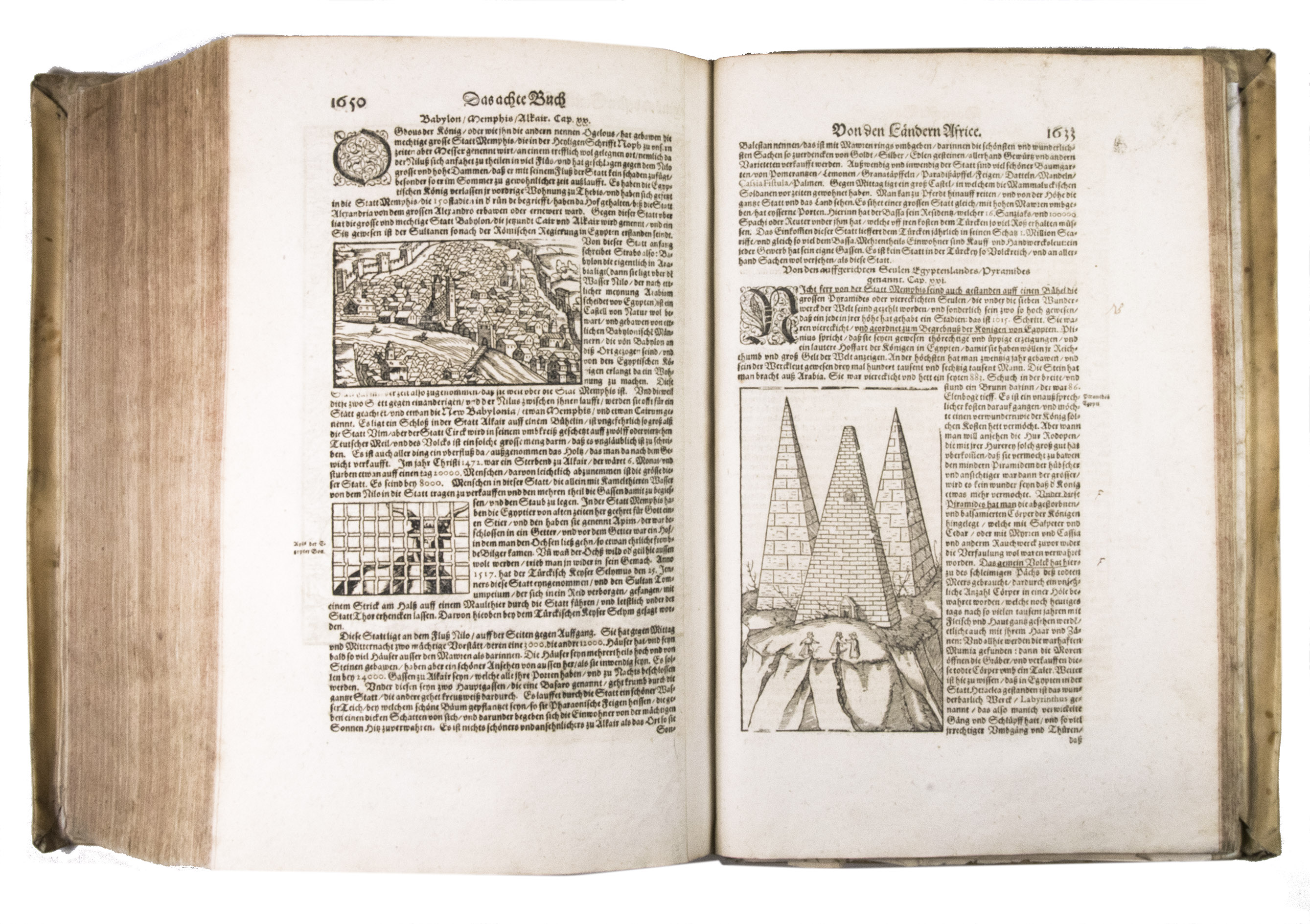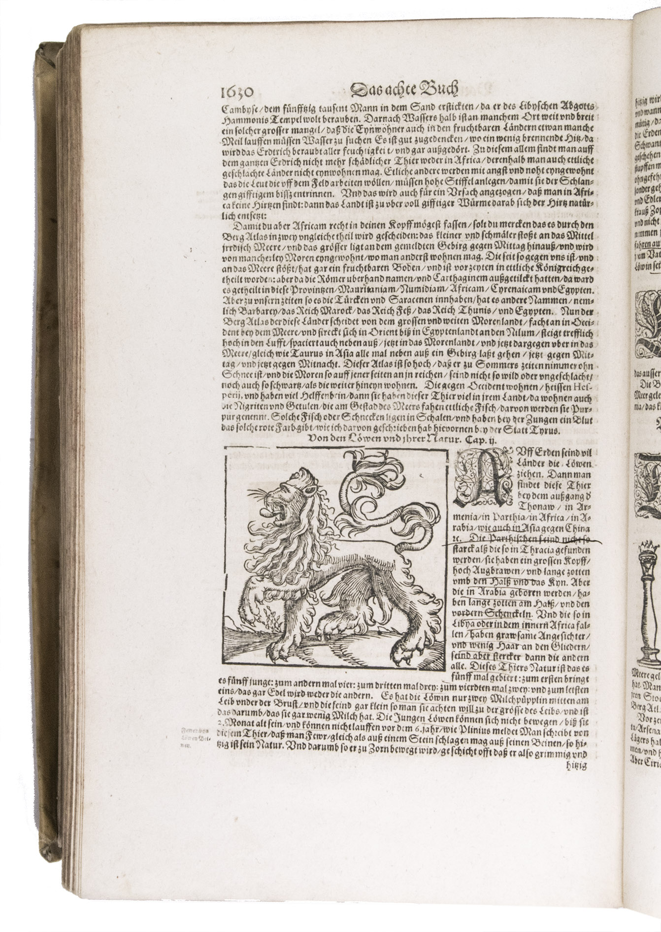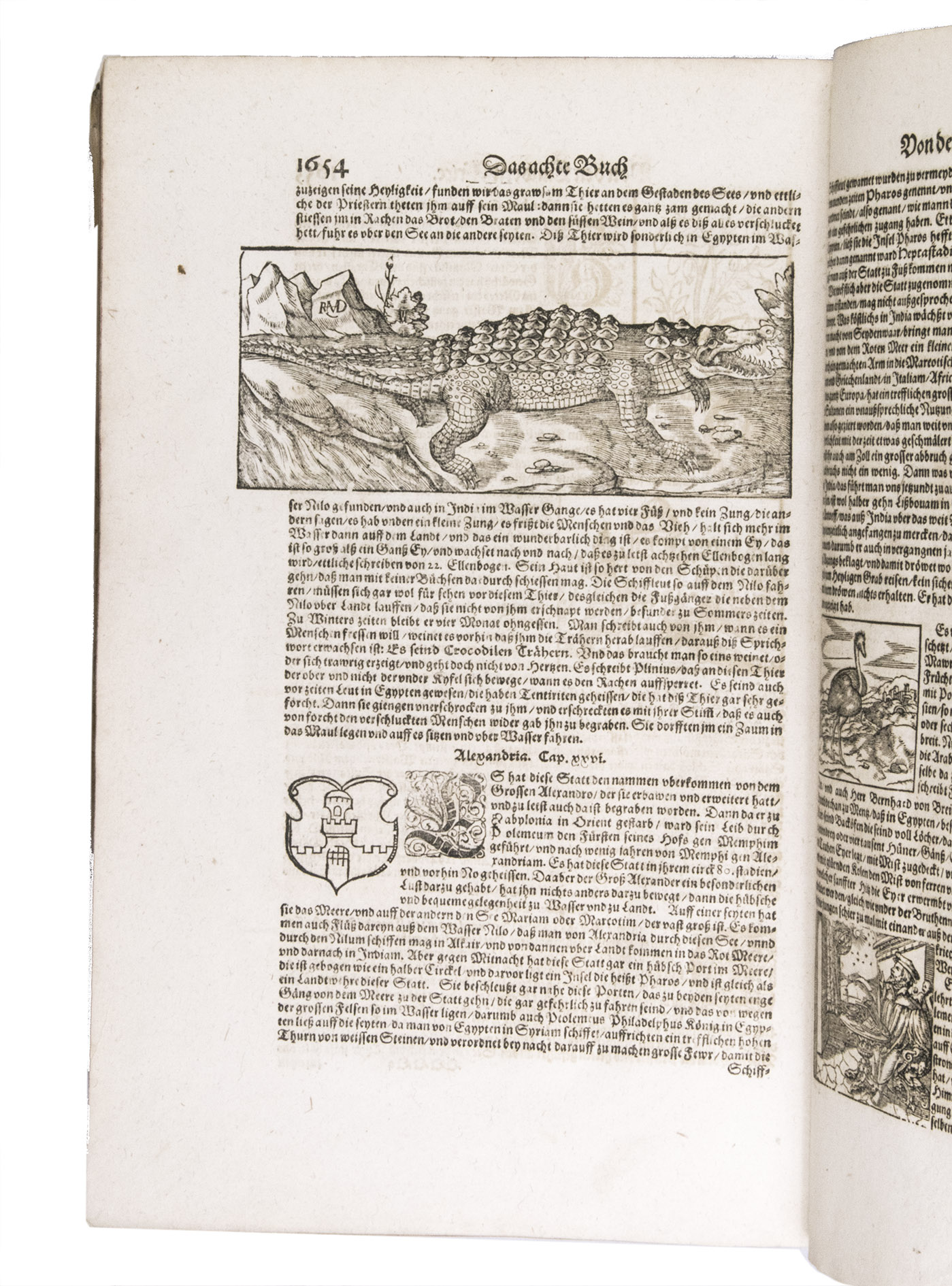 Basel, heirs of Sebastian Henricpetri, 1628. Folio (38 x 24.5 cm). With engraved title-page, letterpress title-page printed in red and black with woodcut portrait of Münster on the back, 26 numbered double-page woodcut maps on inserted bifolia, 72 double-page woodcut maps, plans and views on integral leaves, and about 1500 woodcut illustrations in the text (including repeats) showing maps, plans, views, plants, animals, monsters, etc. Contemporary vellum. [24], “1752” [=1748] , [12] pp.