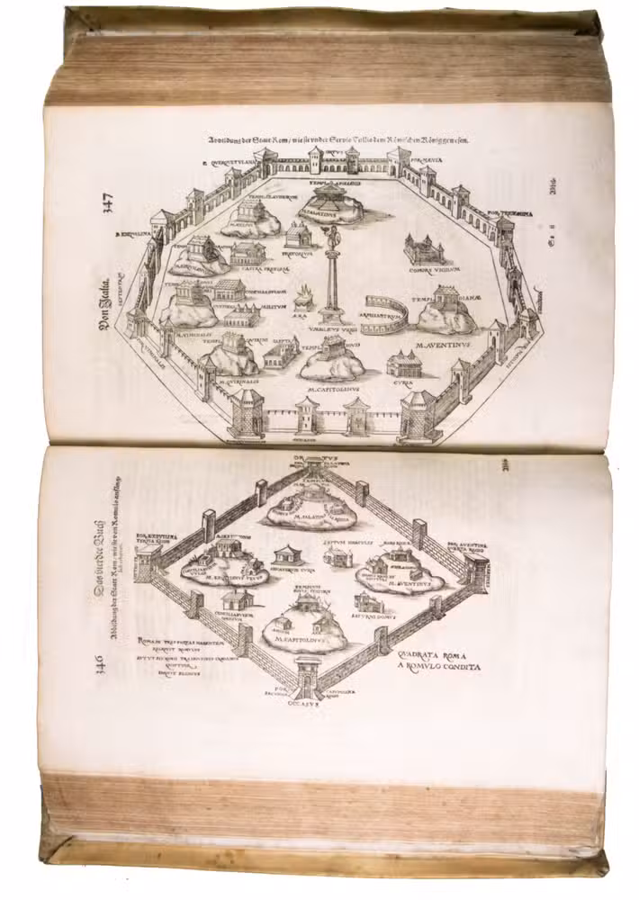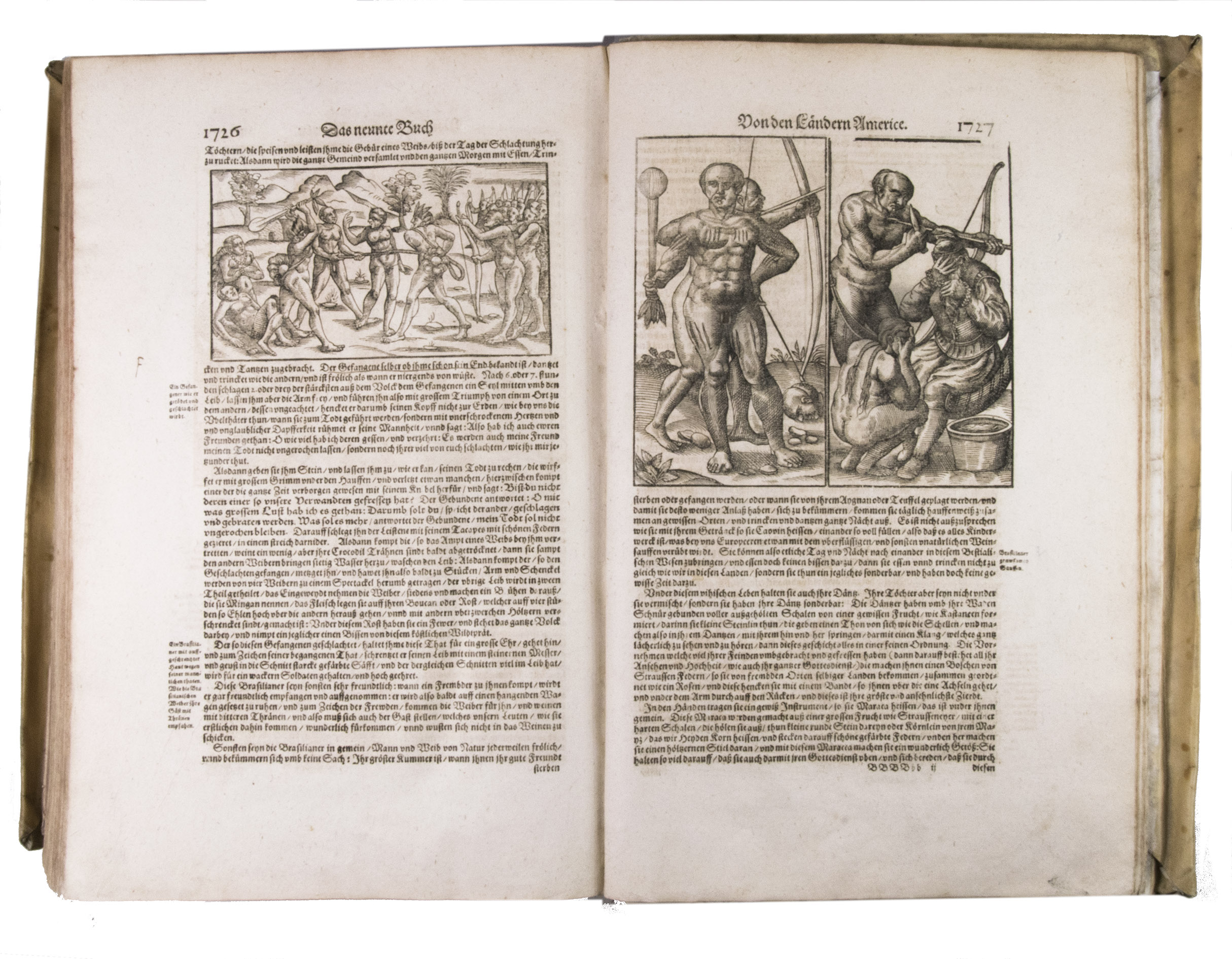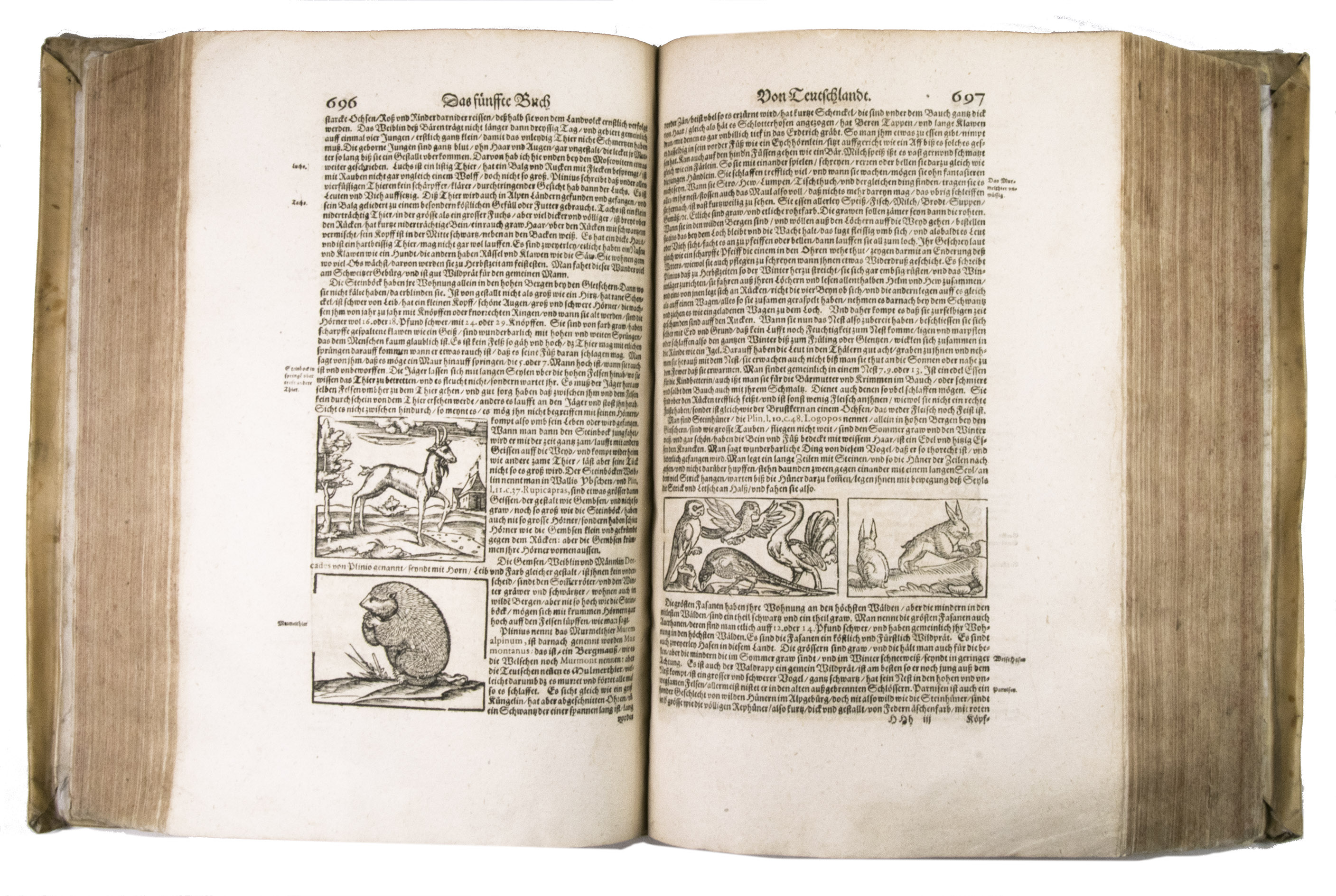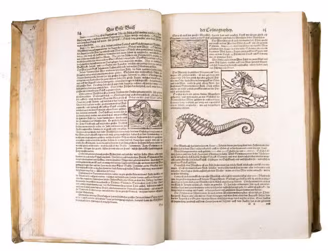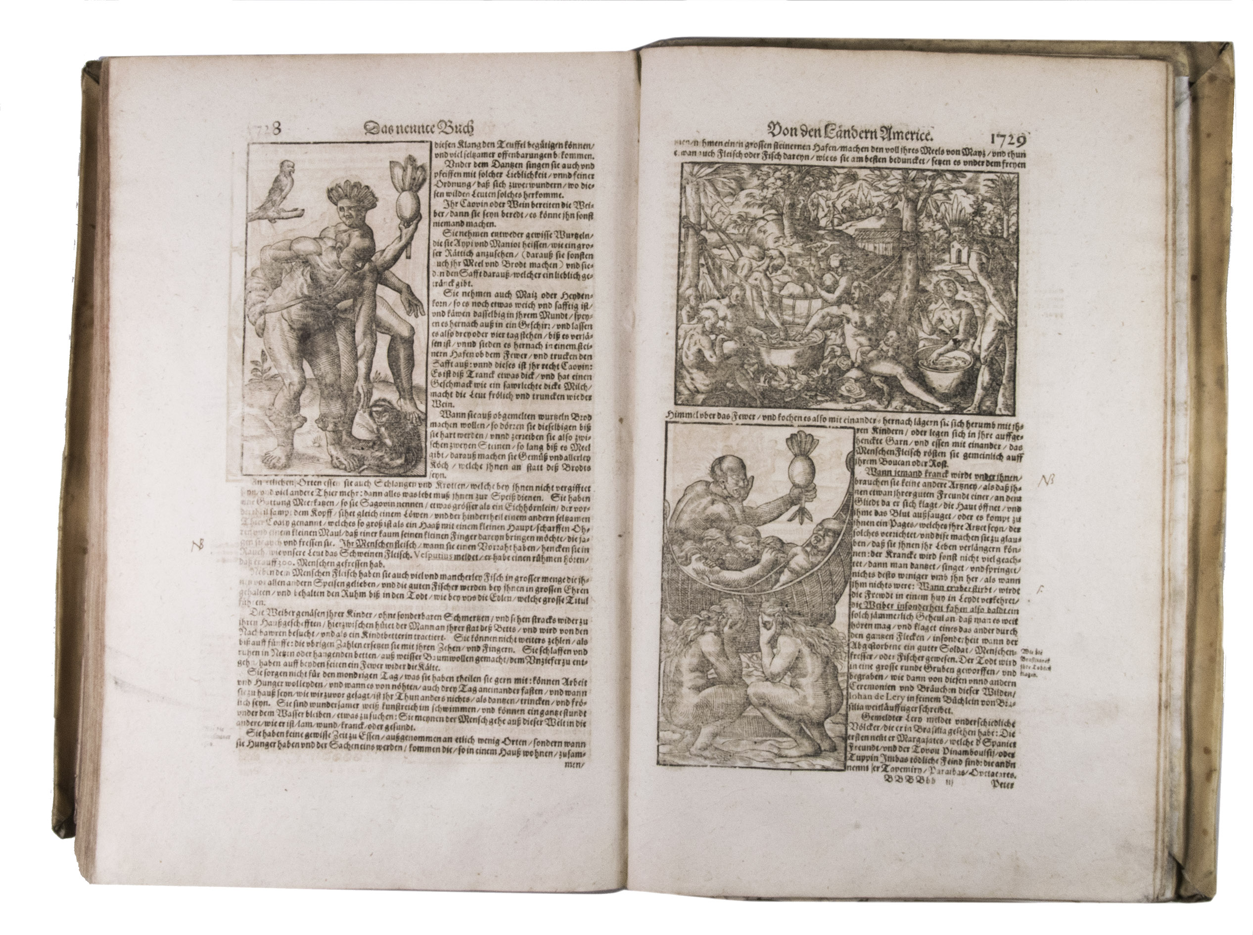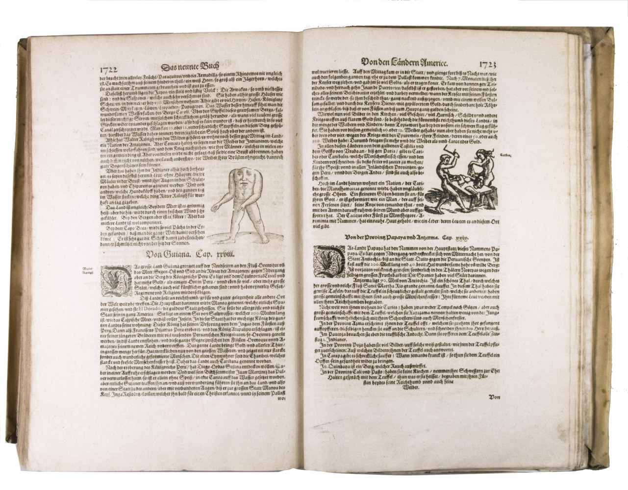 Basel, heirs of Sebastian Henricpetri, 1628. Folio (38 x 24.5 cm). With engraved title-page, letterpress title-page printed in red and black with woodcut portrait of Münster on the back, 26 numbered double-page woodcut maps on inserted bifolia, 72 double-page woodcut maps, plans and views on integral leaves, and about 1500 woodcut illustrations in the text (including repeats) showing maps, plans, views, plants, animals, monsters, etc. Contemporary vellum. [24], “1752” [=1748] , [12] pp.