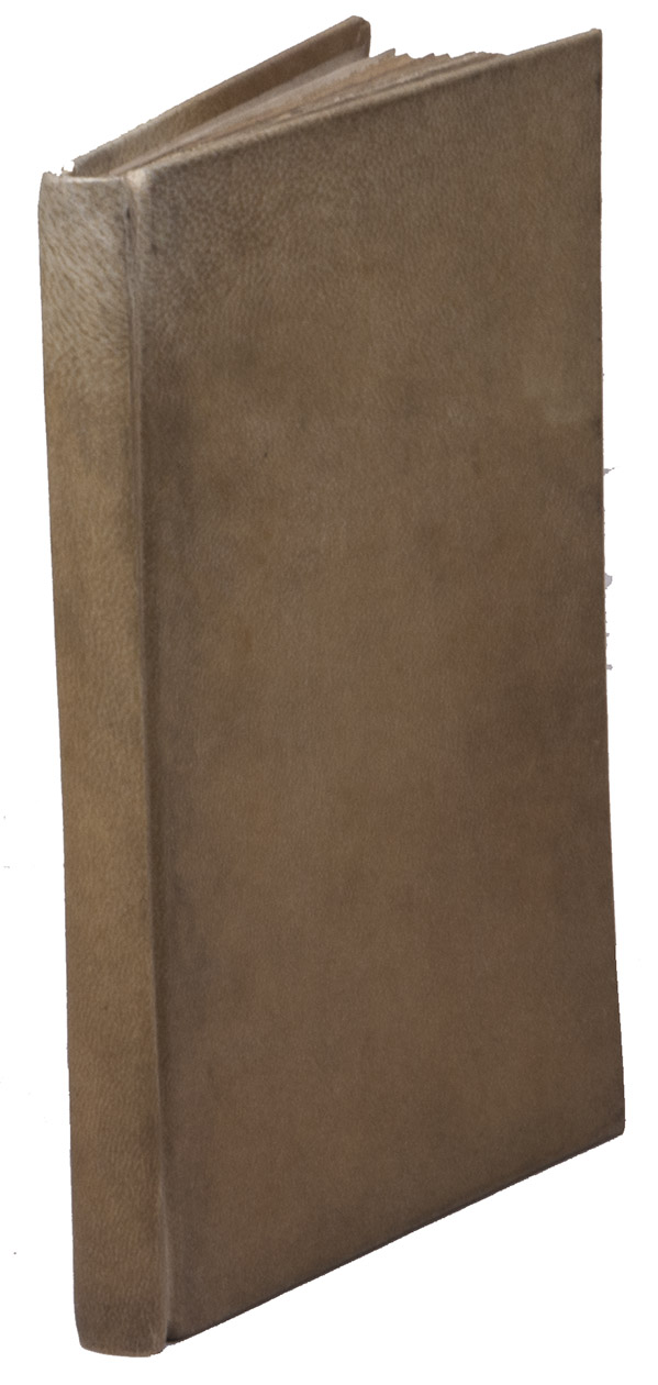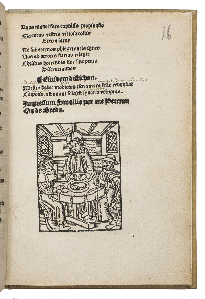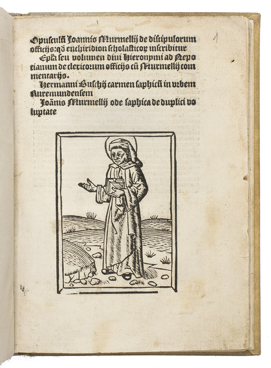 Zwolle, Pieter van Os, ca. 1505. 4to. Woodcut title page illustration of Saint Jerome (88 x 66 mm), woodcut colophon illustration (73 x 55 mm). Later sheepskin parchment, wove paper pastedowns and late 18th-century endleaves (laid paper, watermarked 1783). [52] pp.