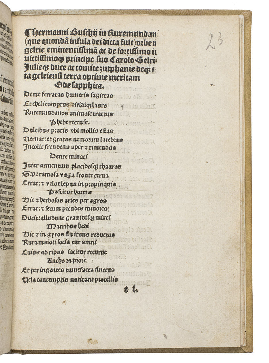 Only six copies are known to survive of this outstanding post-incunable. This is the first edition, printed in Zwolle by Peter van Oss, one of the first printers in Zwolle, active between 1479 and 1510. Murmellius was born in Roermond and received his education at Deventer and the University of Cologne. Following his studies in the humanities he was appointed as assistant headmaster of the cathedral school in Münster, followed by stints as rector at the St Ludgerus School in Münster and eventually rector of the grammar school in Alkmaar. It was in Münster that he began his educational reform, replacing mediaeval schoolbooks with contemporary humanistic works, an effort that characterised the rest of his life. Murmellius wrote about 50 works in the course of his life.
