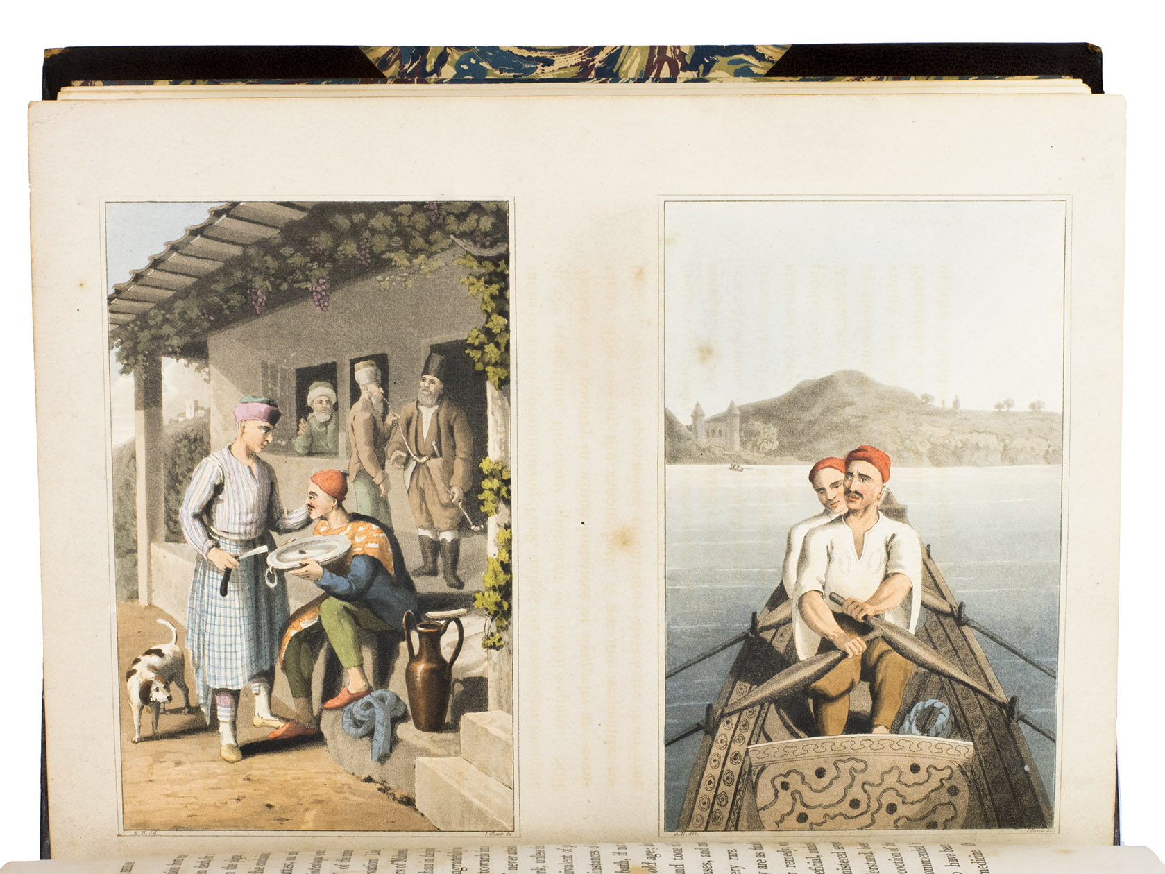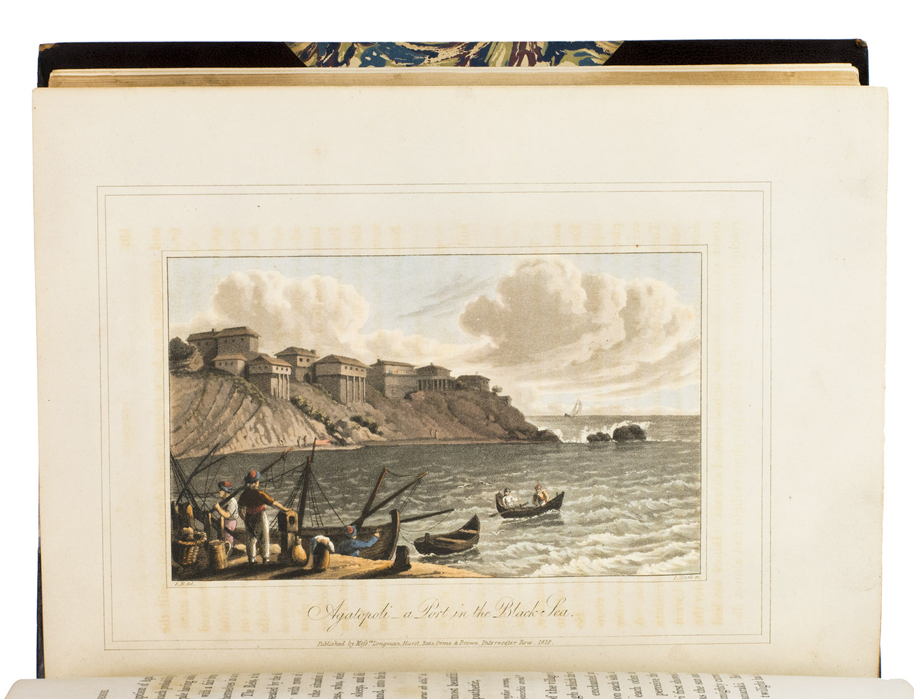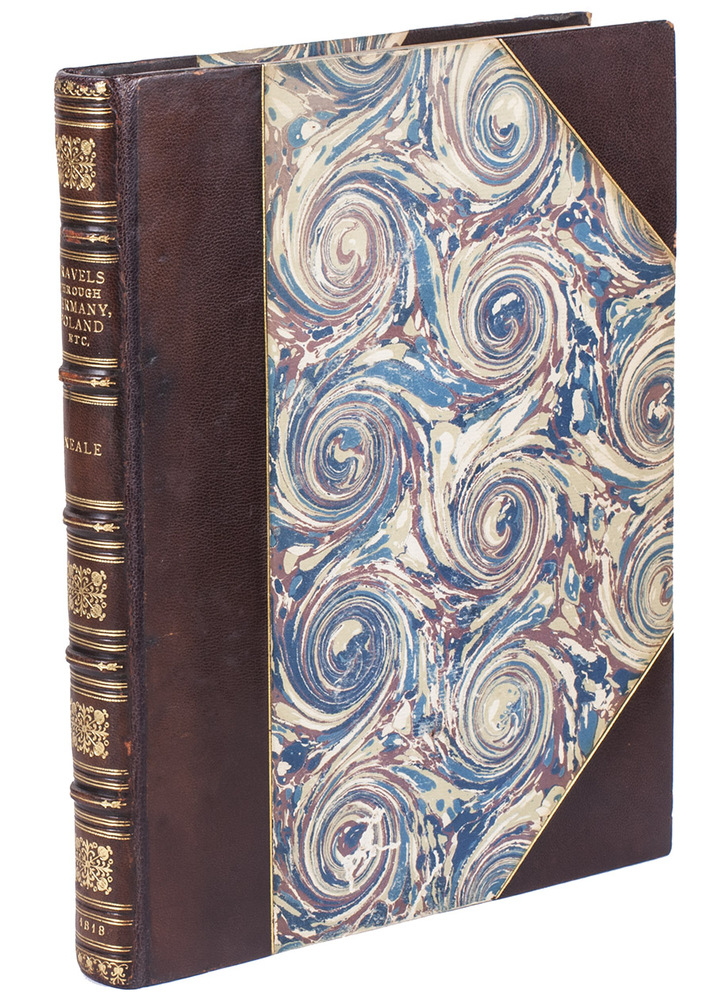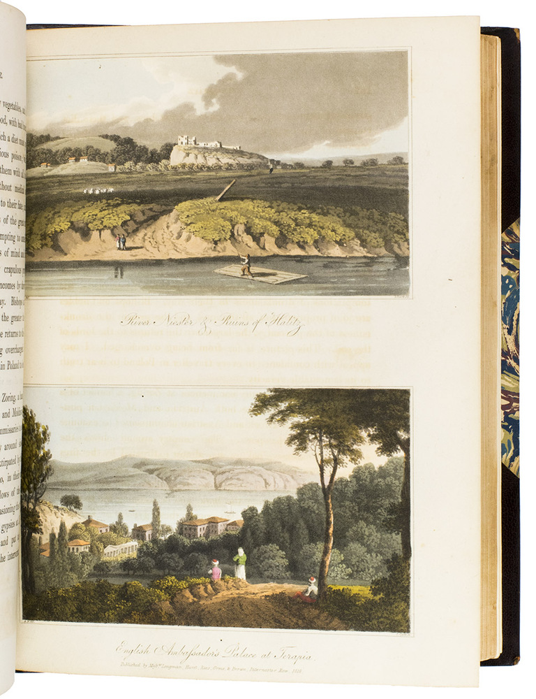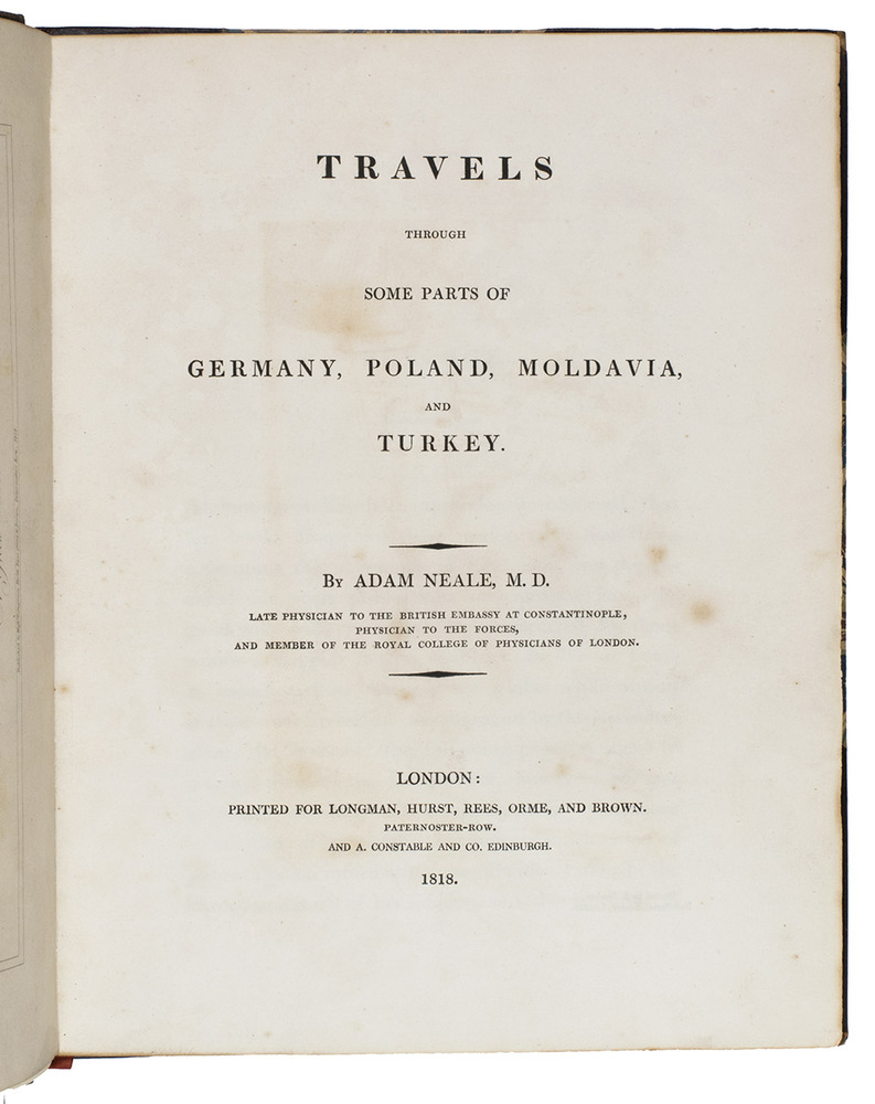 First and only edition of a vividly written account of a voyage through Germany, Poland, Moldavia and the Ottoman Empire, beautifully illustrated with fifteen coloured aquatints after the designs of the author. Adam Neale (ca. 1780-1832) of Scottish descent, was an army physician and writer. His first work, Letters from Portugal and Spain (1809), was a description of the events he experienced with the British forces under Sir John Moore and Sir Arthur Wellesley during the terrible campaigns of Napoleon in Spain and Portugal. Neale subsequently visited Germany, Poland, Moldavia and the Ottoman Empire, ending up in Constantinople to take up his position as physician to the British embassy. The present work contains his autobiographical account of these travels from July 1805 to March 1806, partly through regions which had suffered, and were still suffering, the horrors and barbarism of the Napoleonic wars. The battle of Austerlitz had just taken place in December 1805. Neale added also many statistical data on the population, number of inhabitants, rulers, etc.
