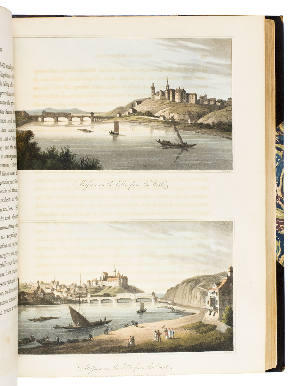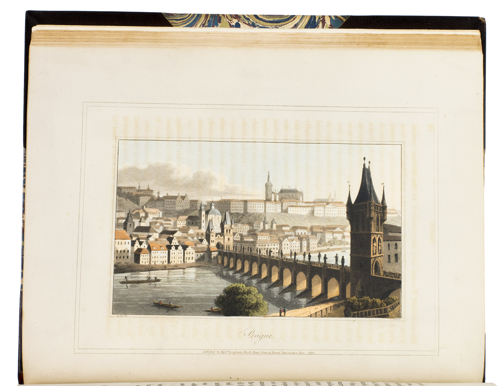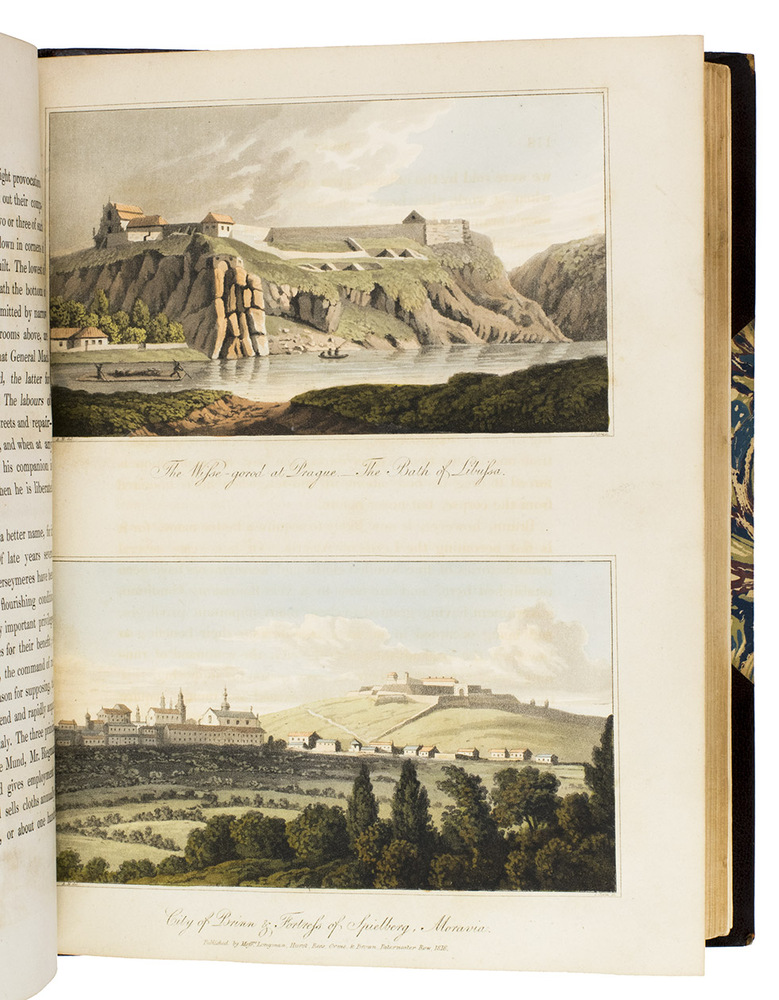 First and only edition of a vividly written account of a voyage through Germany, Poland, Moldavia and the Ottoman Empire, beautifully illustrated with fifteen coloured aquatints after the designs of the author. Adam Neale (ca. 1780-1832) of Scottish descent, was an army physician and writer. His first work, Letters from Portugal and Spain (1809), was a description of the events he experienced with the British forces under Sir John Moore and Sir Arthur Wellesley during the terrible campaigns of Napoleon in Spain and Portugal. Neale subsequently visited Germany, Poland, Moldavia and the Ottoman Empire, ending up in Constantinople to take up his position as physician to the British embassy. The present work contains his autobiographical account of these travels from July 1805 to March 1806, partly through regions which had suffered, and were still suffering, the horrors and barbarism of the Napoleonic wars. The battle of Austerlitz had just taken place in December 1805. Neale added also many statistical data on the population, number of inhabitants, rulers, etc.