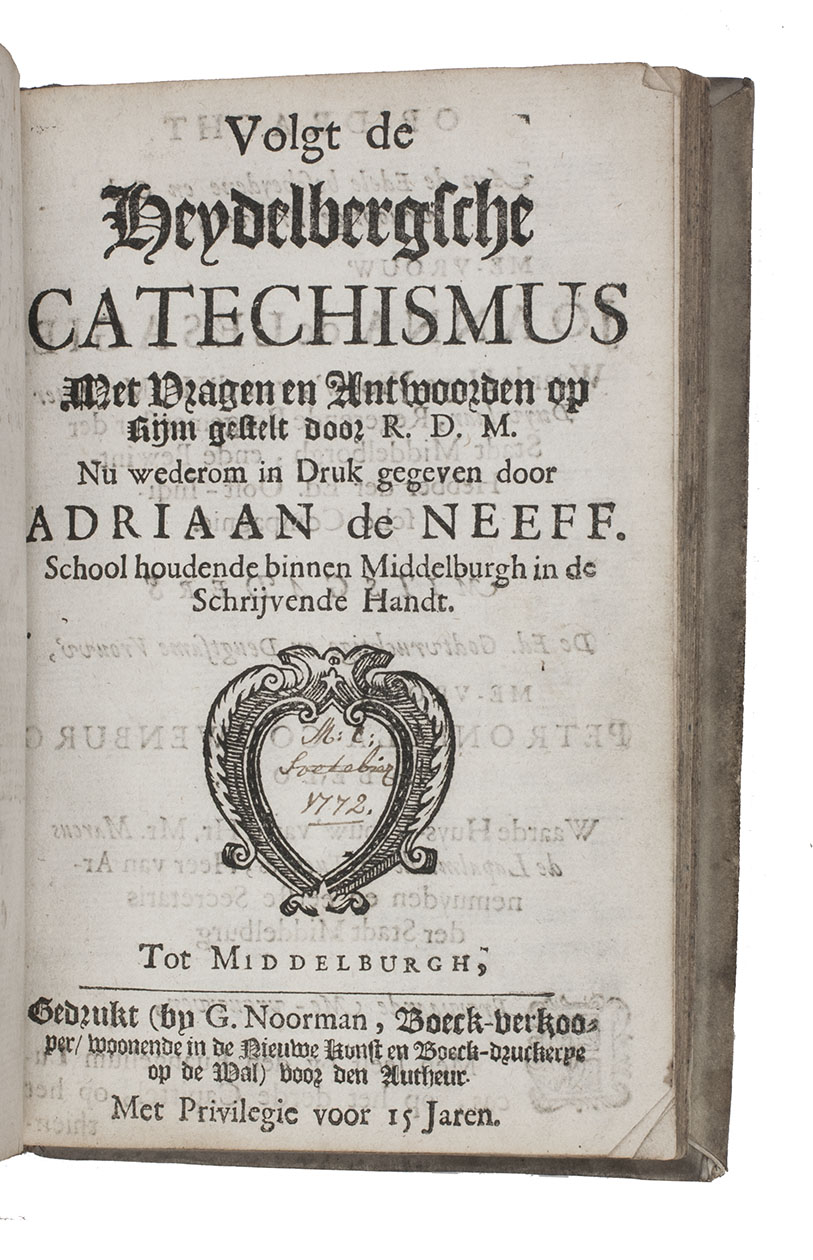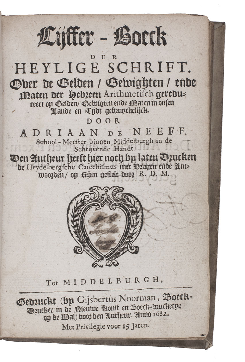 Popular schoolbook by a schoolteacher at Middelburg, teaching children arithmetic at the hand of the numbers quoted in the Bible. All the numbers of biblical amounts of money, measures or weights, were taught to be converted into contemporary Dutch amounts of money, measures or weights. At the end of the present work the Heidelberg catechism is added, with the questions and answers put to rhyme to facilitate the learning by heart for the younger children.