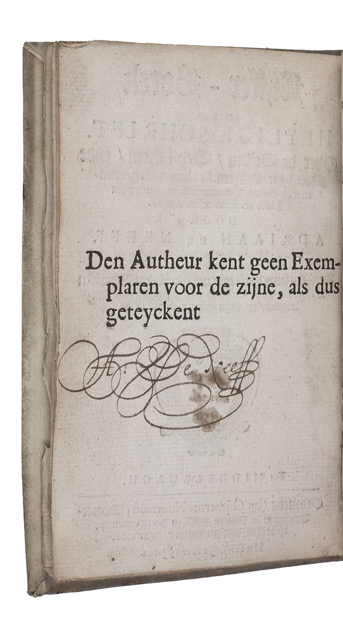 Middelburgh, Gijsbertus Noorman, 1682. Small 8vo. 2 parts in 1 volume. With woodcut vignette on 2 titles, and at the end of the second work, showing identical blank escutcheons. Contemporary vellum. [14], 63, [1 blank]; [4], 75, [5] pp.
