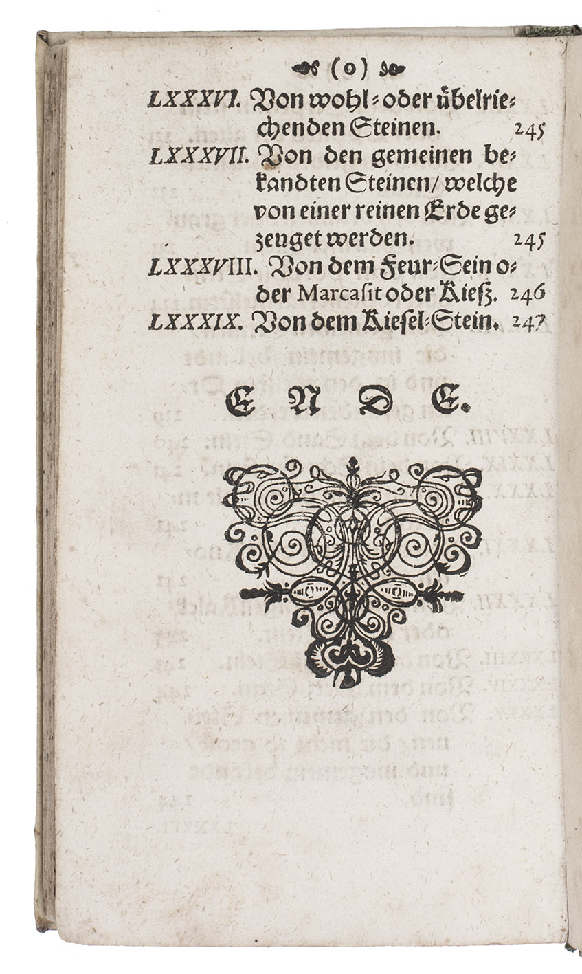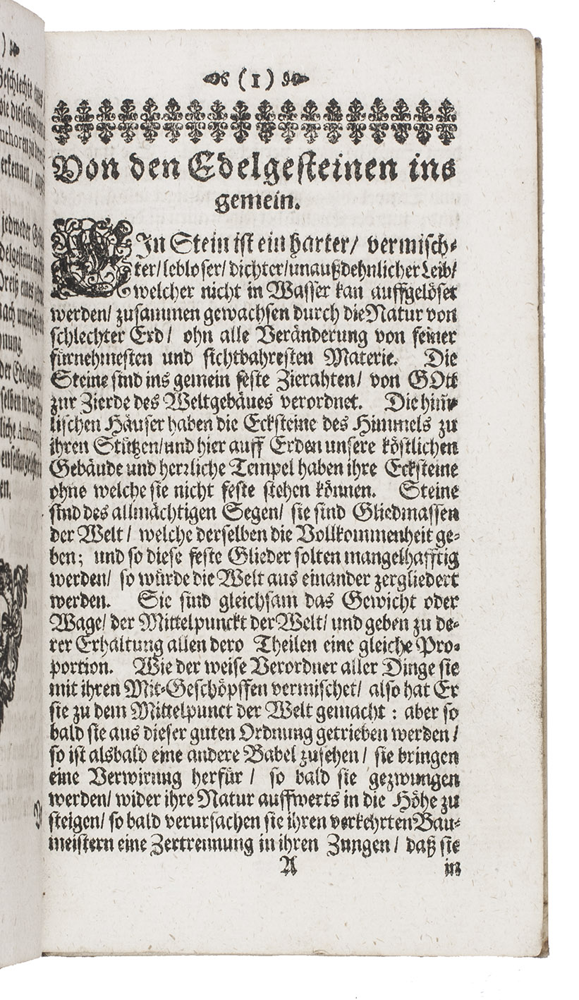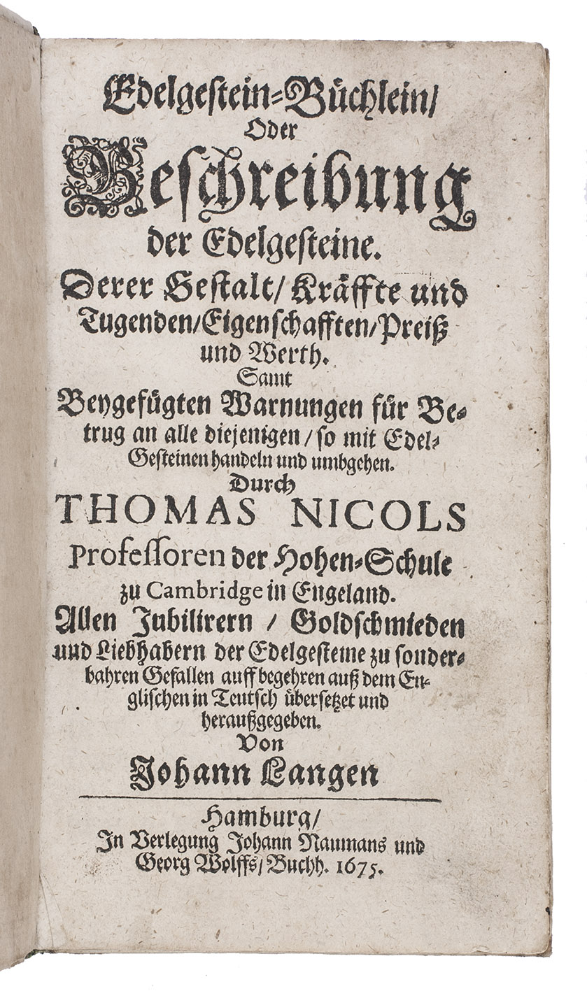 First edition of the German translation of A lapidary, first published in English in 1652 and compiled by Thomas Nicols: ''the first independent gemological book by a British author ... based firmly upon Boetius de Boodt'' (Sinkankas). Nicols lists all the true gems, but also covers fossils, coral, pearls, amber, etc. For each he discusses the forms, appearance, properties (diligently but somewhat sceptically reporting magical, mystical and medical claims), origins, classification, uses, prices, engraving on gems, etc. Nicols makes an intelligent synthesis of the earlier literature, as well as original contributions primarily in practical aspects related to jewellery, such as enhancing stones with reflective foils or dyestuffs, hardening softer stones, and the related subjects of falsification and adulteration.