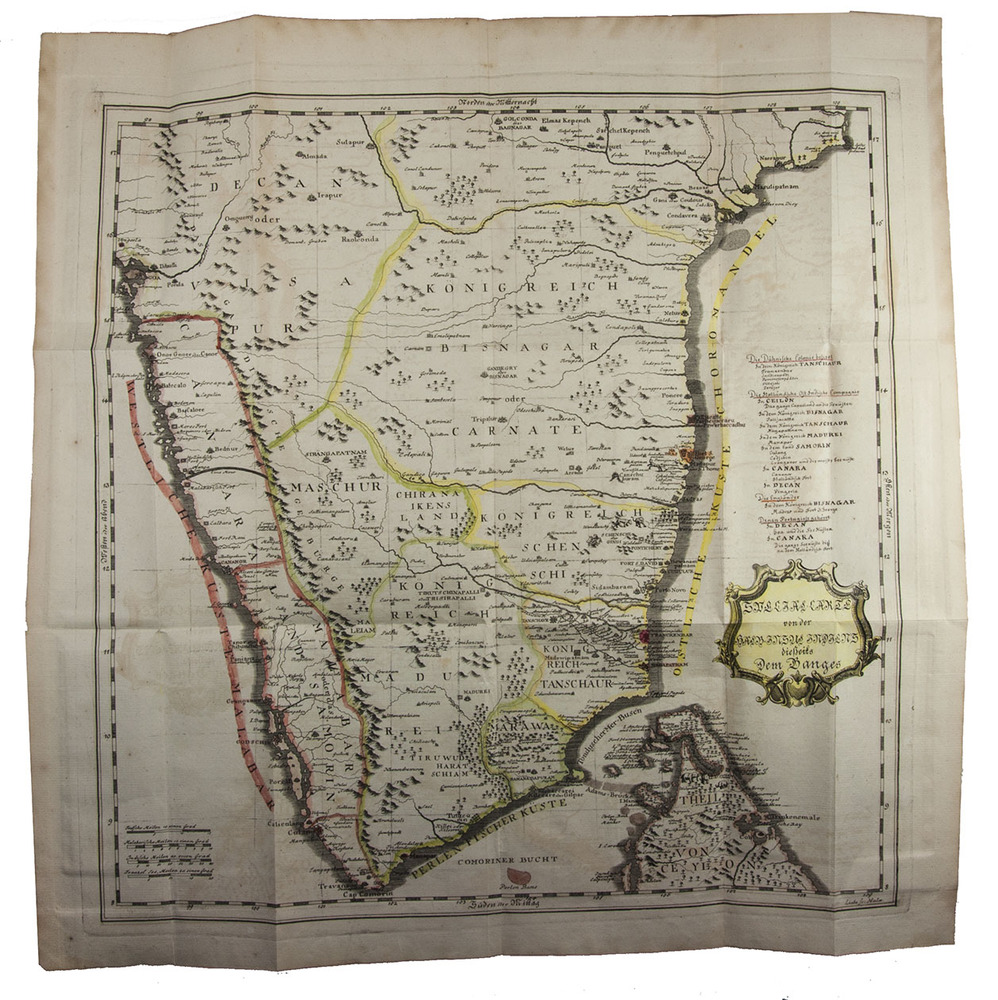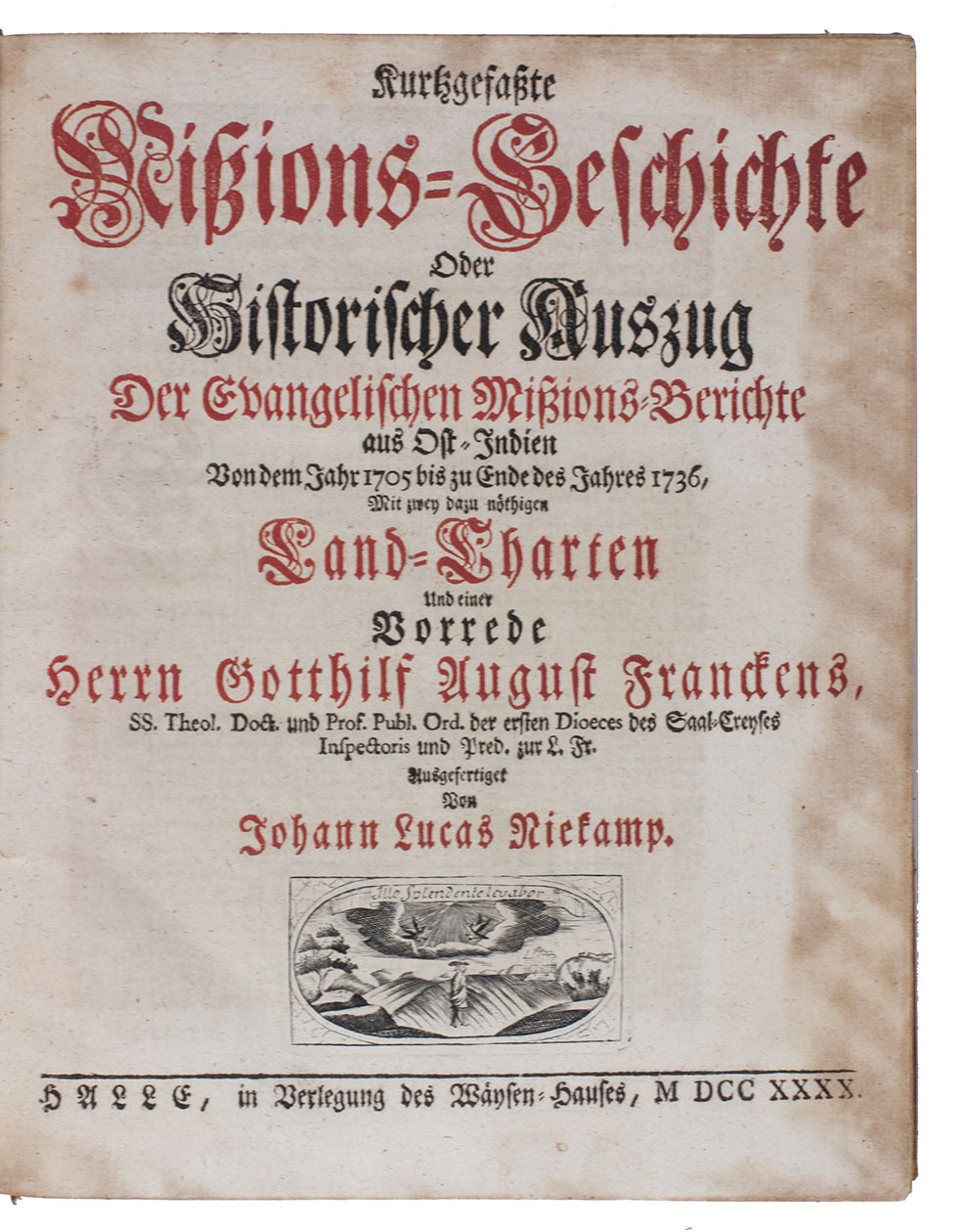 First and only edition in the original German of an account of the Dänisch-Hallesche mission on the Carnatic coast in southeast India, from the beginning in 1705 to 1736. The Dänisch-Hallesche mission was the first Protestant mission and many resulting reports were published in the magazine Hallesche Berichte. Niekamp digested its first 44 chapters and organized them in two main parts: the first dealing with geography, inhabitants, languages etc. and the second treating the mission itself in chronological order; this if followed by a comprehensive index. The work contains a preface by Gotthilf August Francke, the son of the August Hermann Francke, who was one of the driving forces in the creation of the mission.