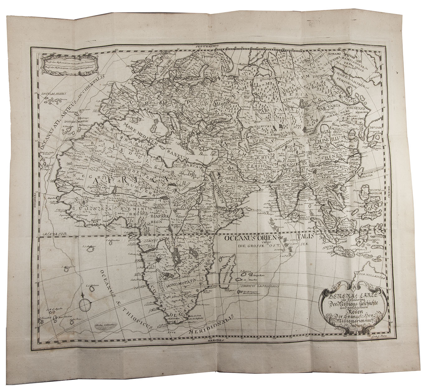 Halle, Waisenhaus, 1740. 4to. With 2 engraved folding maps (the second crudely highlighted in colour by a later hand). Contemporary tanned sheepskin. [22], 506, [54] pp.