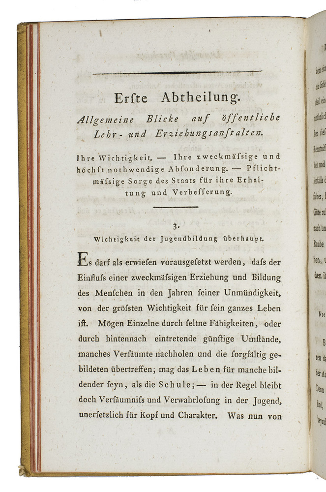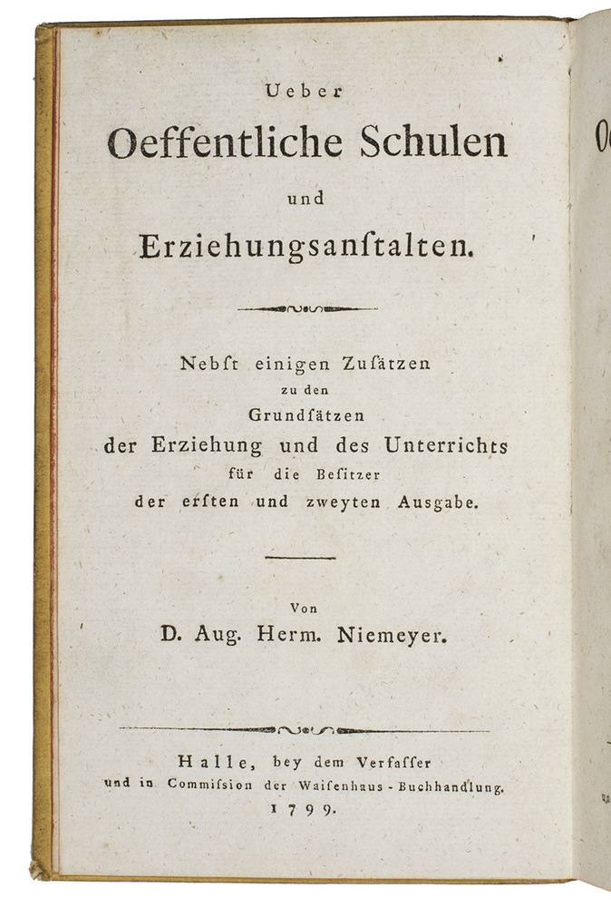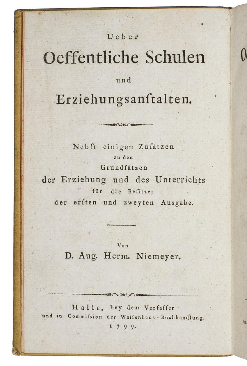 First edition of a German plan of education, with the additions for the second and third editions of Grundsätzen der Erziehung und des Unterrichts bound in at the end and the extra title-page for these additions facing the main title-page. The book proposes an overall plan and program for the organisation of public schools in Prussia and in the whole of Germany; not only for general education in primary schools and for professional education in agrarian, technical, industrial, commercial and art schools, in schools for girls, etc., but also for education in military academies, universities and for special education in orphanages, schools for the blind, deaf-mute children, etc.