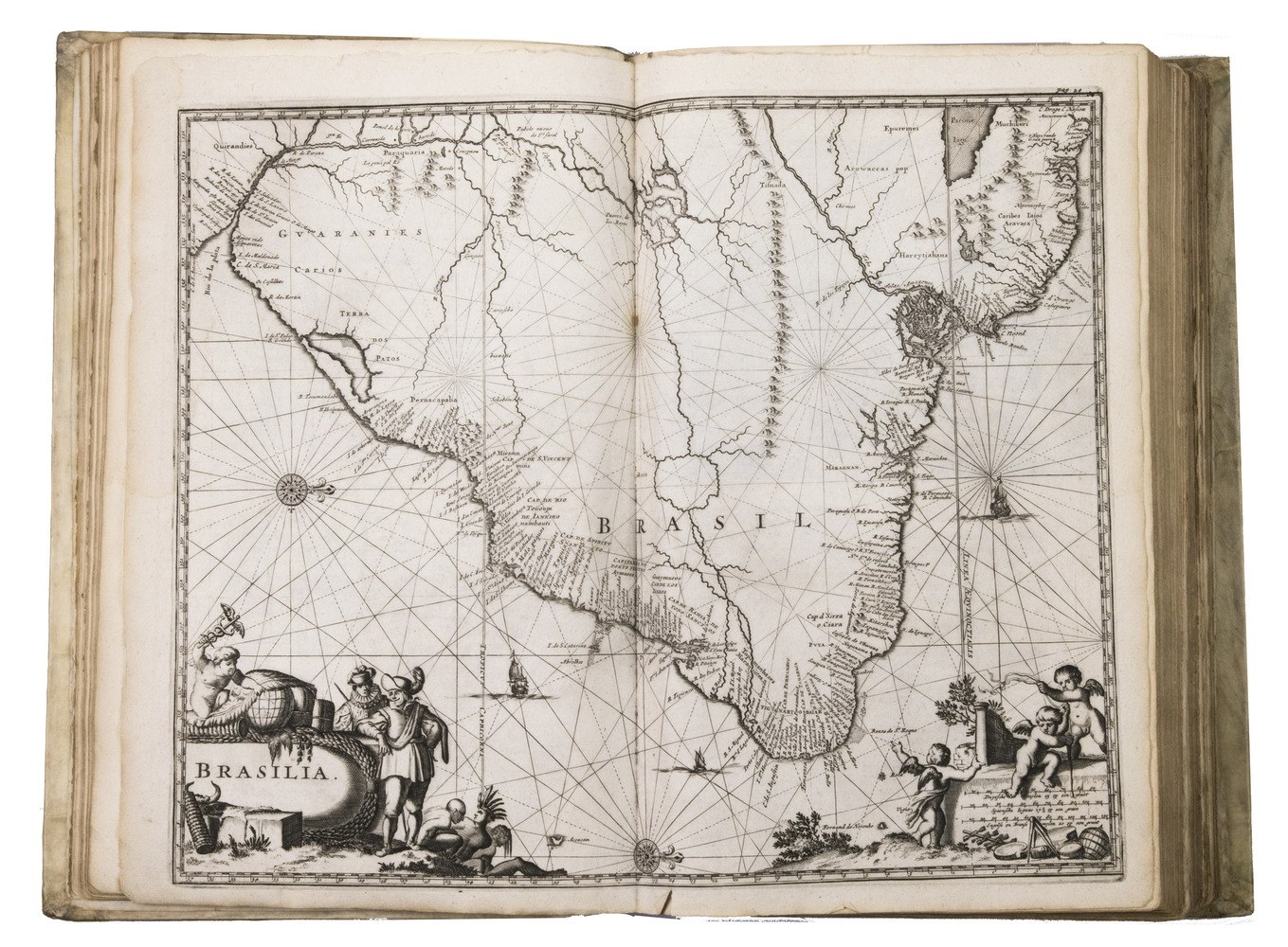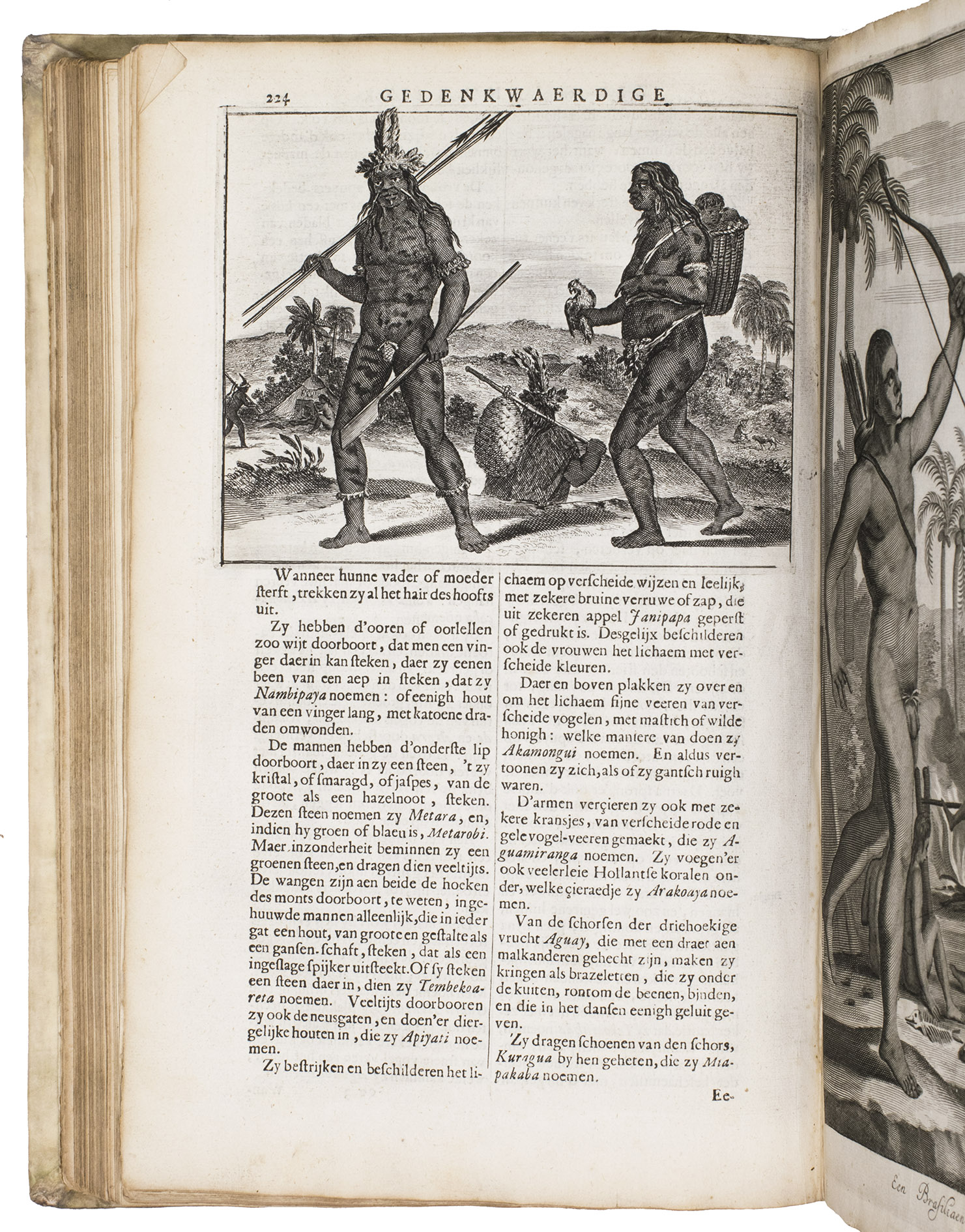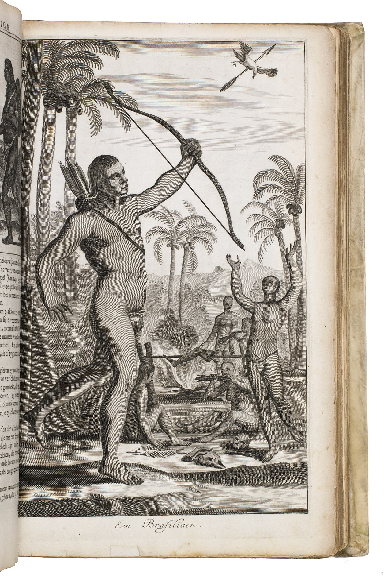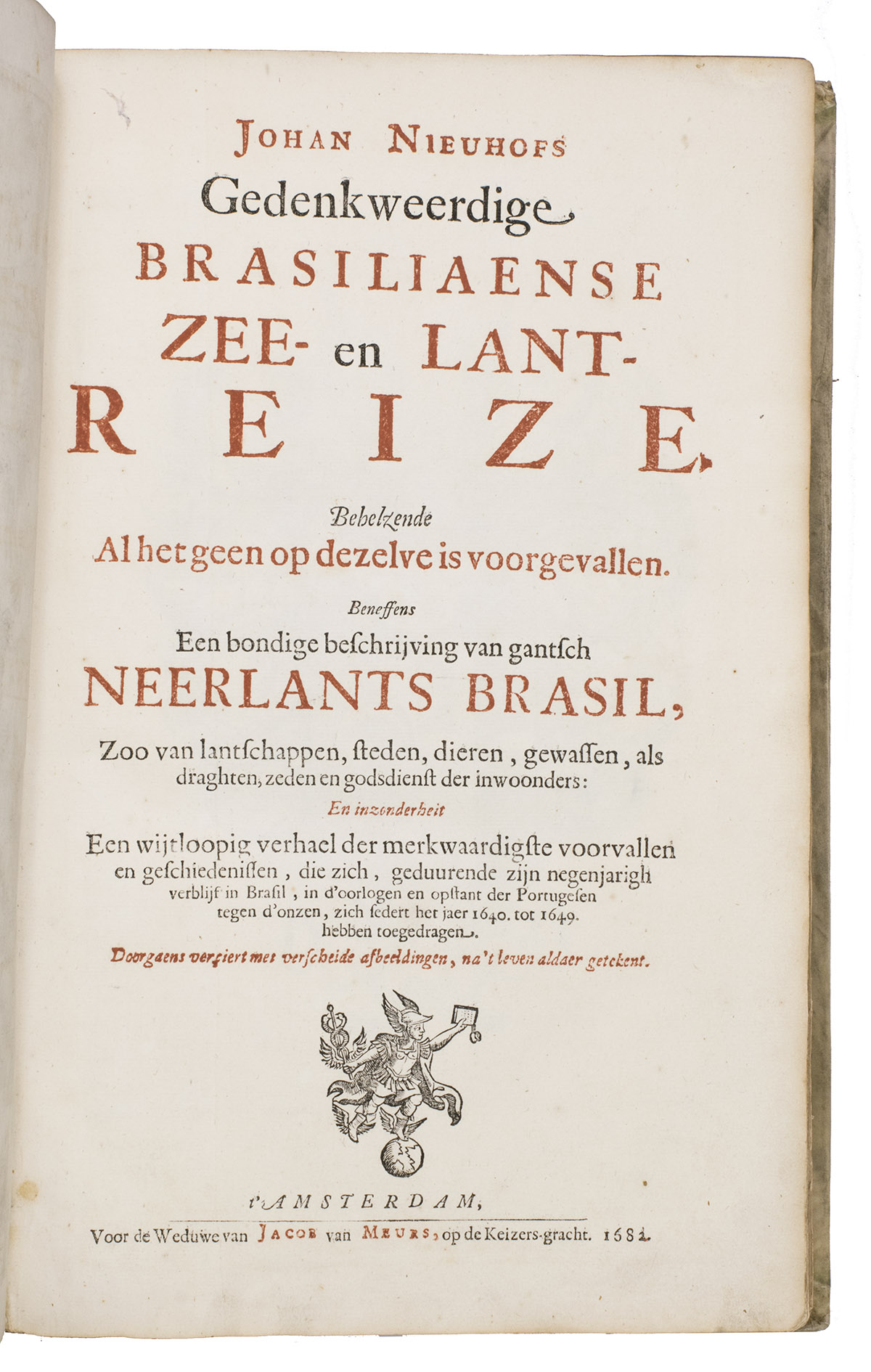 First edition of a splendidly illustrated 17th-century account of Brazil and of the East Indies, describing the author's voyages in those regions and describing their topography, flora, fauna, cities, clothing, customs and religion, with a 5-page account of his travels in Africa at the end. Part one covers Brazil (including parts of the West Indies) and part two the East Indies. Nieuhof gives his own graphic eyewitness account of the 1646 siege of Recife, and his account of Brazil in the years 1644-1647 "is very valuable indeed, being richly documented from the original sources and reproducing much of the official correspondence between the local Dutch and Portuguese authorities" (Boxer). The double-page plates include four maps, ten views of buildings and other sights in Batavia (now Jakarta, Indonesia), several other town views, five plates showing numerous species of fish, and four of plants. The full-page and half-page engravings show a wide variety of animals and plants, natives of various trades and social standings, showing their clothing (or lack thereof) and activities. The introduction, by the author's brother, provides a good deal of biographical information. The preliminaries also include poems by the author himself, and by J. de Lingelbach, P. Ketting, Jacob Steendam and Zacharias Kaheingh.