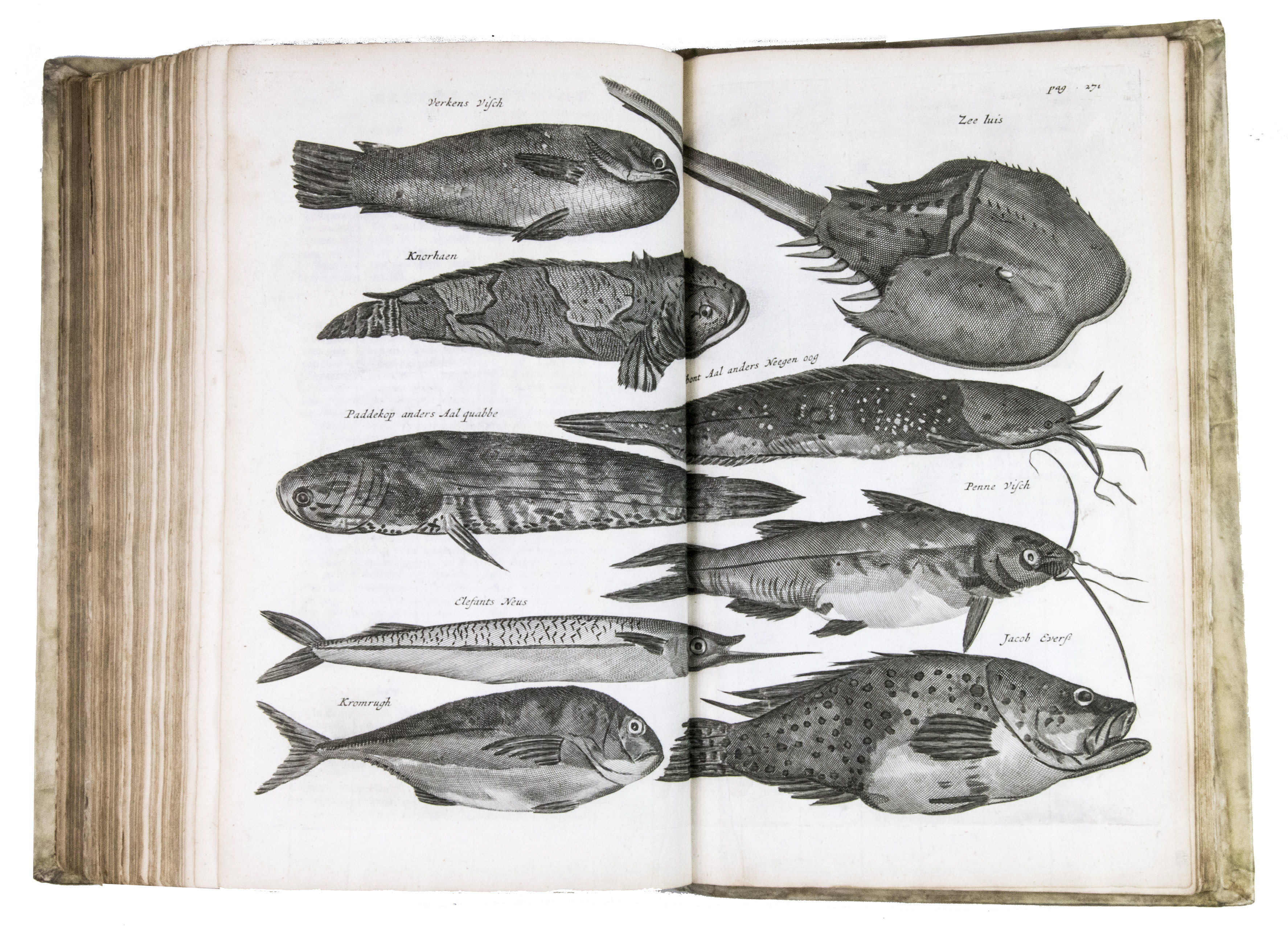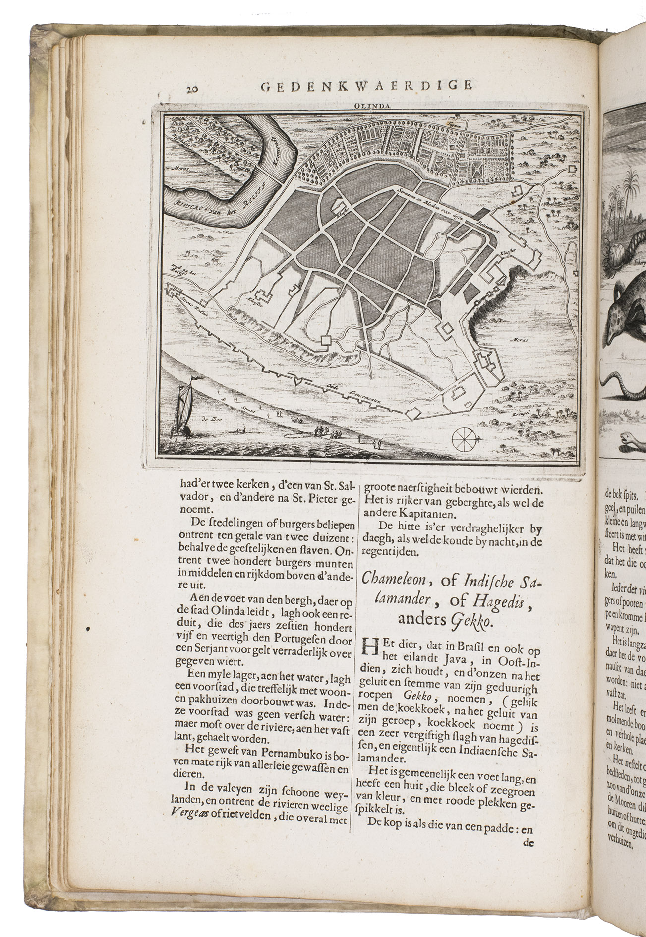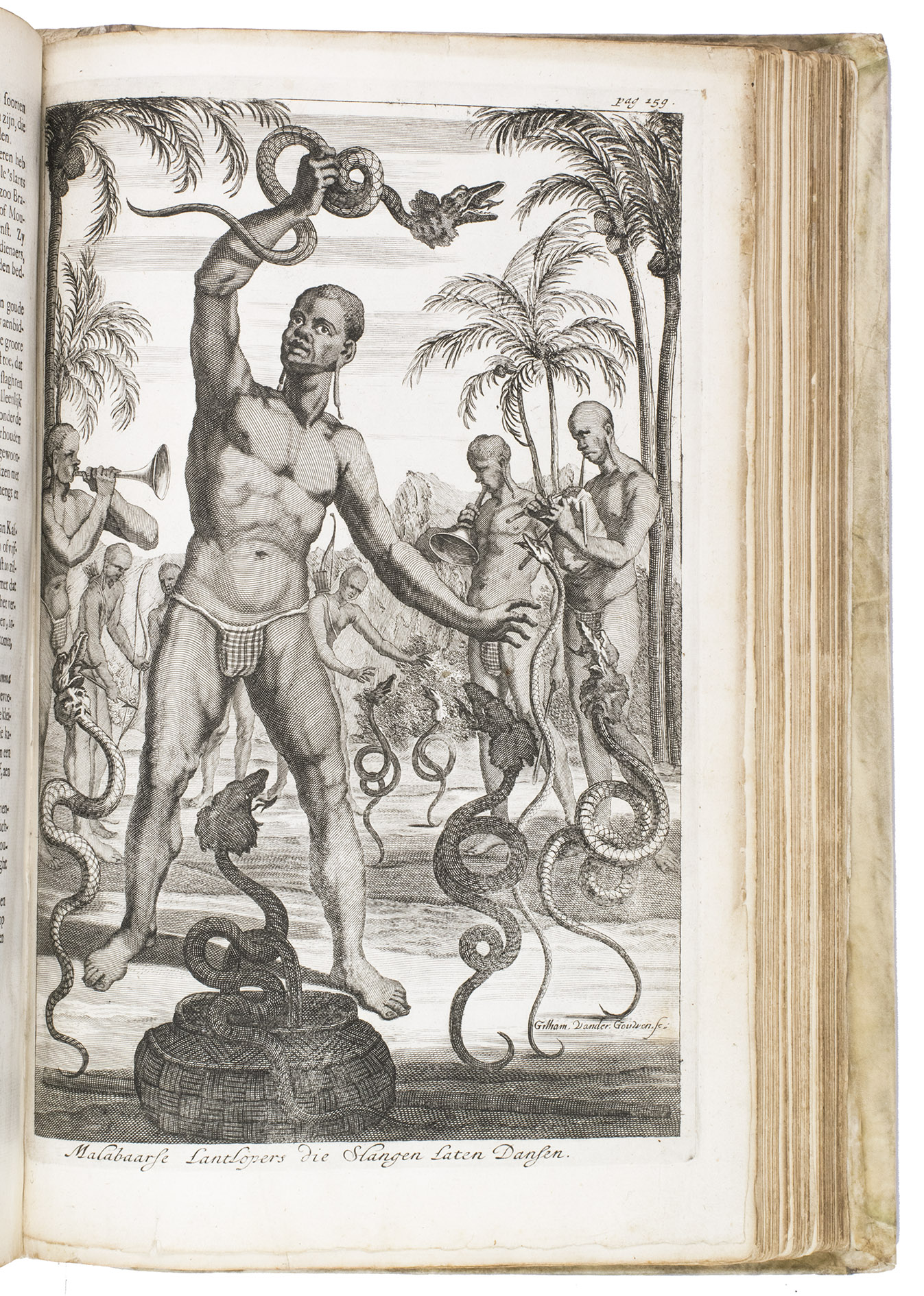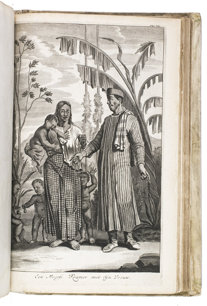 First edition of a splendidly illustrated 17th-century account of Brazil and of the East Indies, describing the author's voyages in those regions and describing their topography, flora, fauna, cities, clothing, customs and religion, with a 5-page account of his travels in Africa at the end. Part one covers Brazil (including parts of the West Indies) and part two the East Indies. Nieuhof gives his own graphic eyewitness account of the 1646 siege of Recife, and his account of Brazil in the years 1644-1647 "is very valuable indeed, being richly documented from the original sources and reproducing much of the official correspondence between the local Dutch and Portuguese authorities" (Boxer). The double-page plates include four maps, ten views of buildings and other sights in Batavia (now Jakarta, Indonesia), several other town views, five plates showing numerous species of fish, and four of plants. The full-page and half-page engravings show a wide variety of animals and plants, natives of various trades and social standings, showing their clothing (or lack thereof) and activities. The introduction, by the author's brother, provides a good deal of biographical information. The preliminaries also include poems by the author himself, and by J. de Lingelbach, P. Ketting, Jacob Steendam and Zacharias Kaheingh.