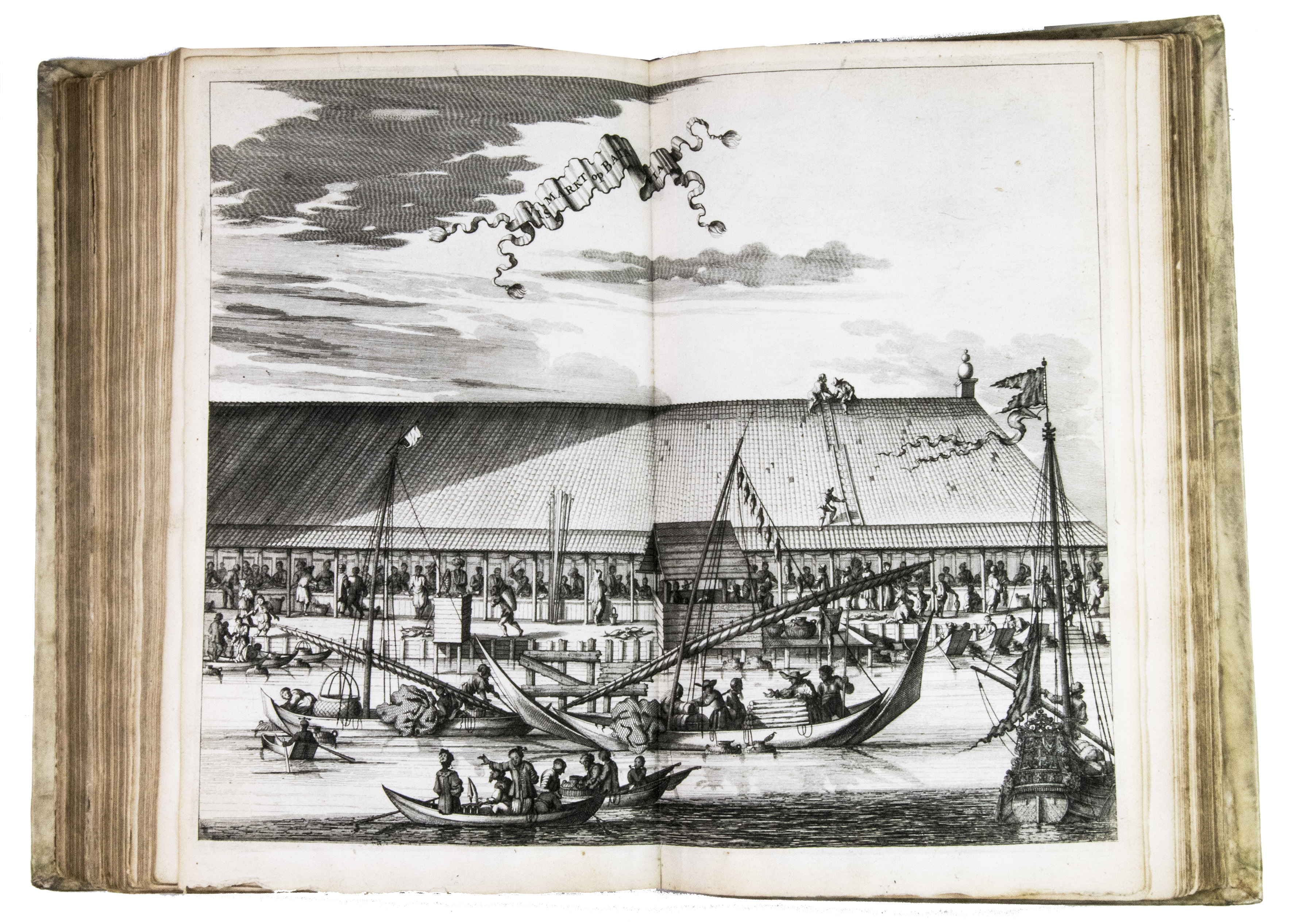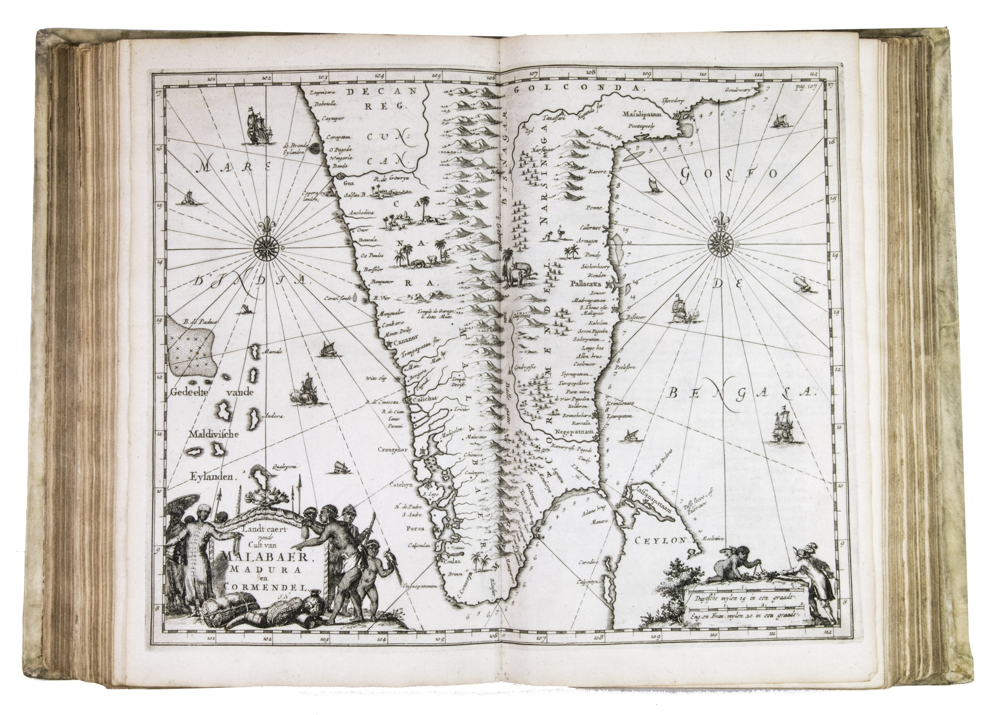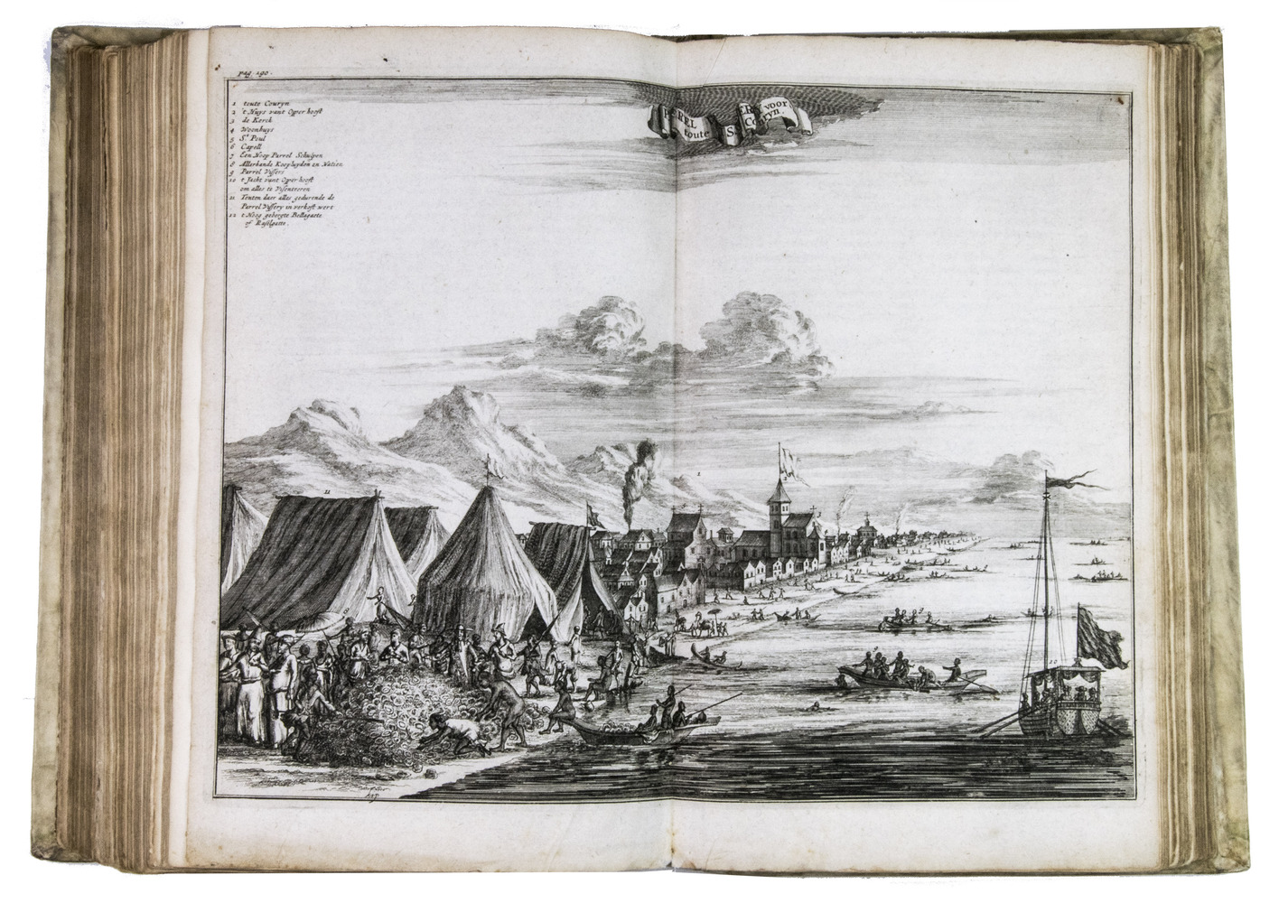 Amsterdam, widow of Jacob van Meurs, 1682. 2 works in 1 volume. Folio. With an engraved general title page, 2 typographical title pages for the two works with Van Meurs' woodcut vignette, the first printed in red and black. Ad 1 with a full-page engraved coat of arms of the dedicatee Nicolaas Witsen, a full-page engraved portrait of the author, and 14 engraved plates (1 double-page map, 2 double-page plates, 2 full-page, and 9 half-page in the text). Further with 6 woodcut decorated initials. Ad 2 with 69 engraved plates (3 double-page maps, 26 double-page plates, 16 full-page plates, and 16 half-page plates in the text), 6 woodcut decorated initials, and 1 woodcut tailpiece. Contemporary blind-tooled vellum, manuscript title on the spine. [4 blank], [12], "240" [=246], [2]; [4], "308" [=310], [4], [4 blank] pp.