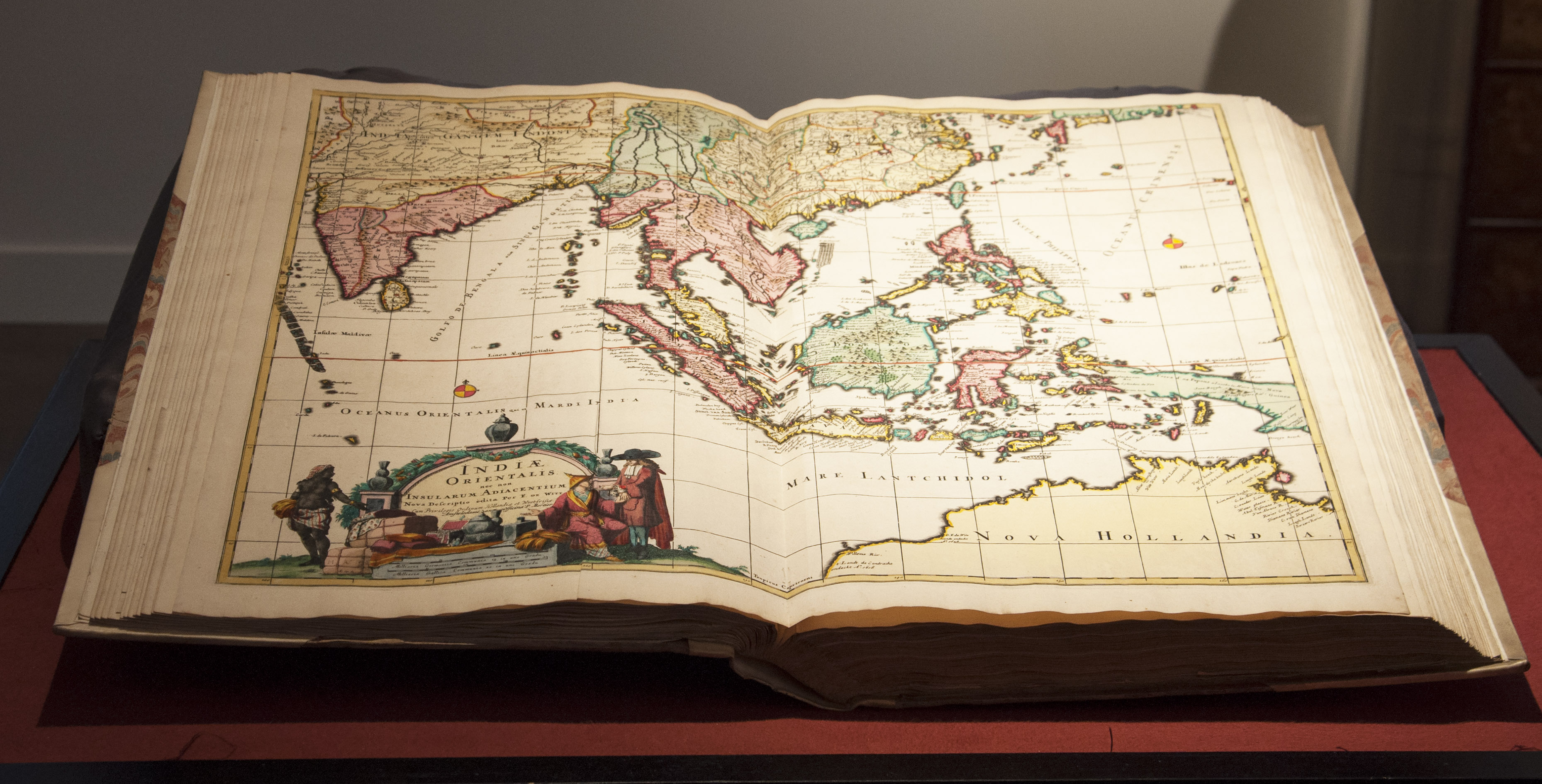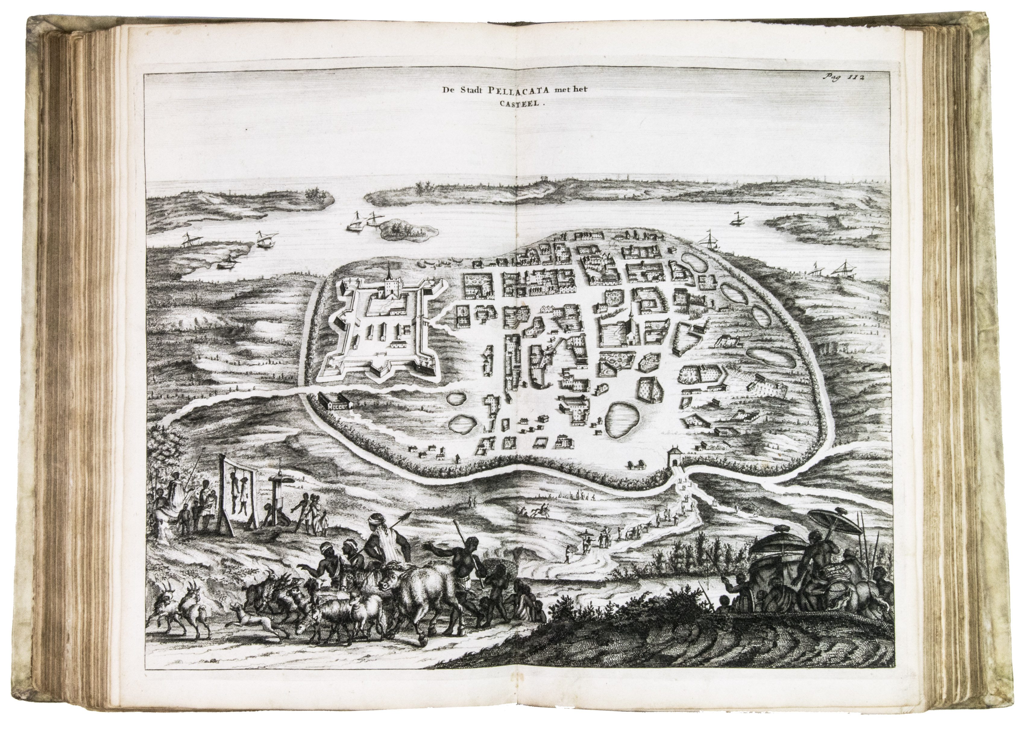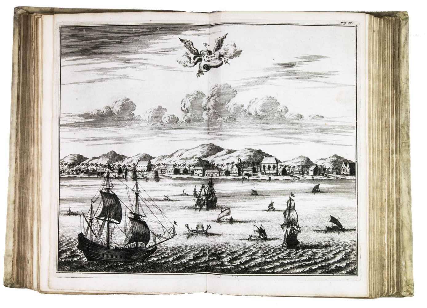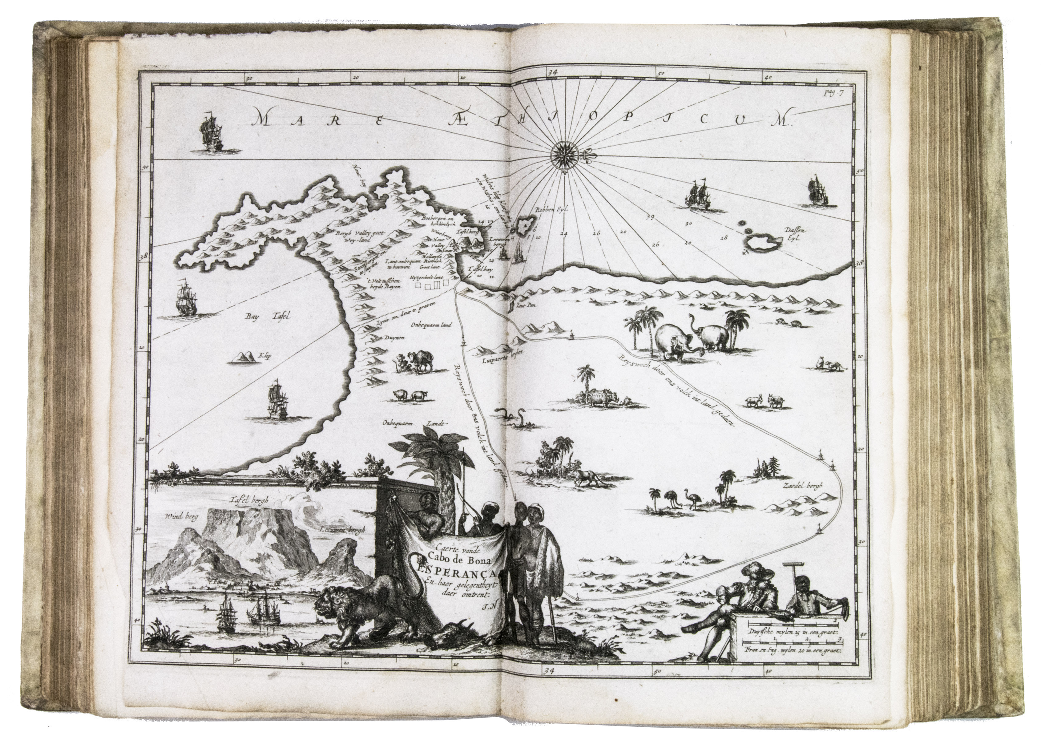 Amsterdam, widow of Jacob van Meurs, 1682. 2 works in 1 volume. Folio. With an engraved general title page, 2 typographical title pages for the two works with Van Meurs' woodcut vignette, the first printed in red and black. Ad 1 with a full-page engraved coat of arms of the dedicatee Nicolaas Witsen, a full-page engraved portrait of the author, and 14 engraved plates (1 double-page map, 2 double-page plates, 2 full-page, and 9 half-page in the text). Further with 6 woodcut decorated initials. Ad 2 with 69 engraved plates (3 double-page maps, 26 double-page plates, 16 full-page plates, and 16 half-page plates in the text), 6 woodcut decorated initials, and 1 woodcut tailpiece. Contemporary blind-tooled vellum, manuscript title on the spine. [4 blank], [12], "240" [=246], [2]; [4], "308" [=310], [4], [4 blank] pp.
