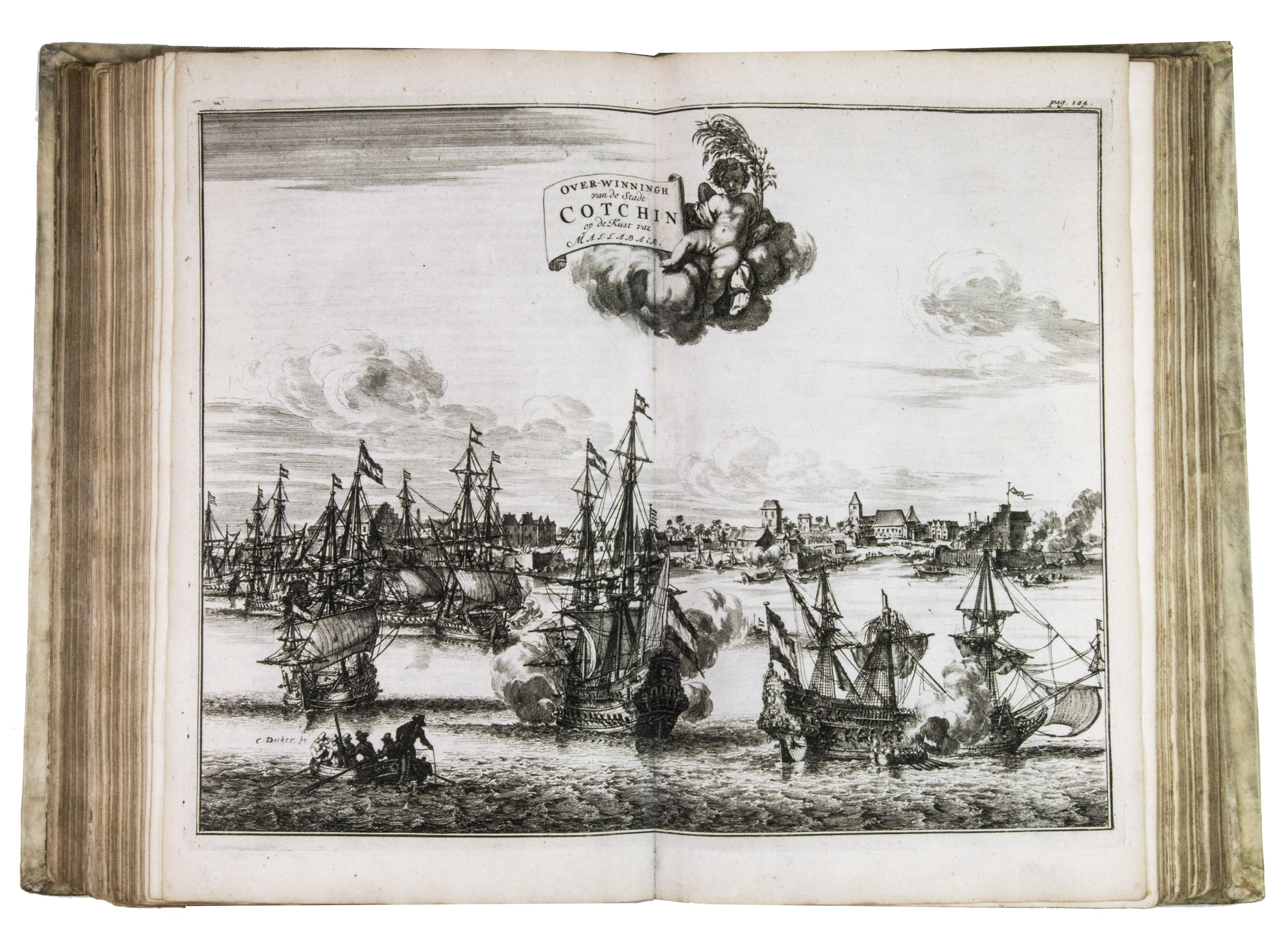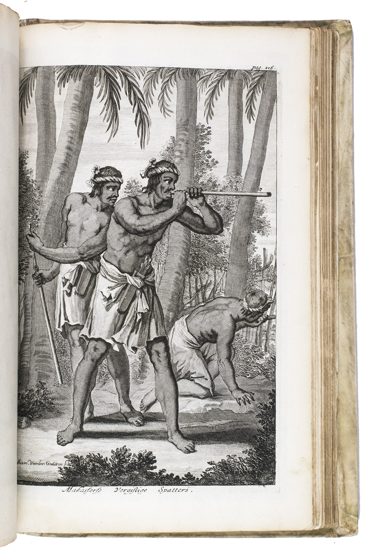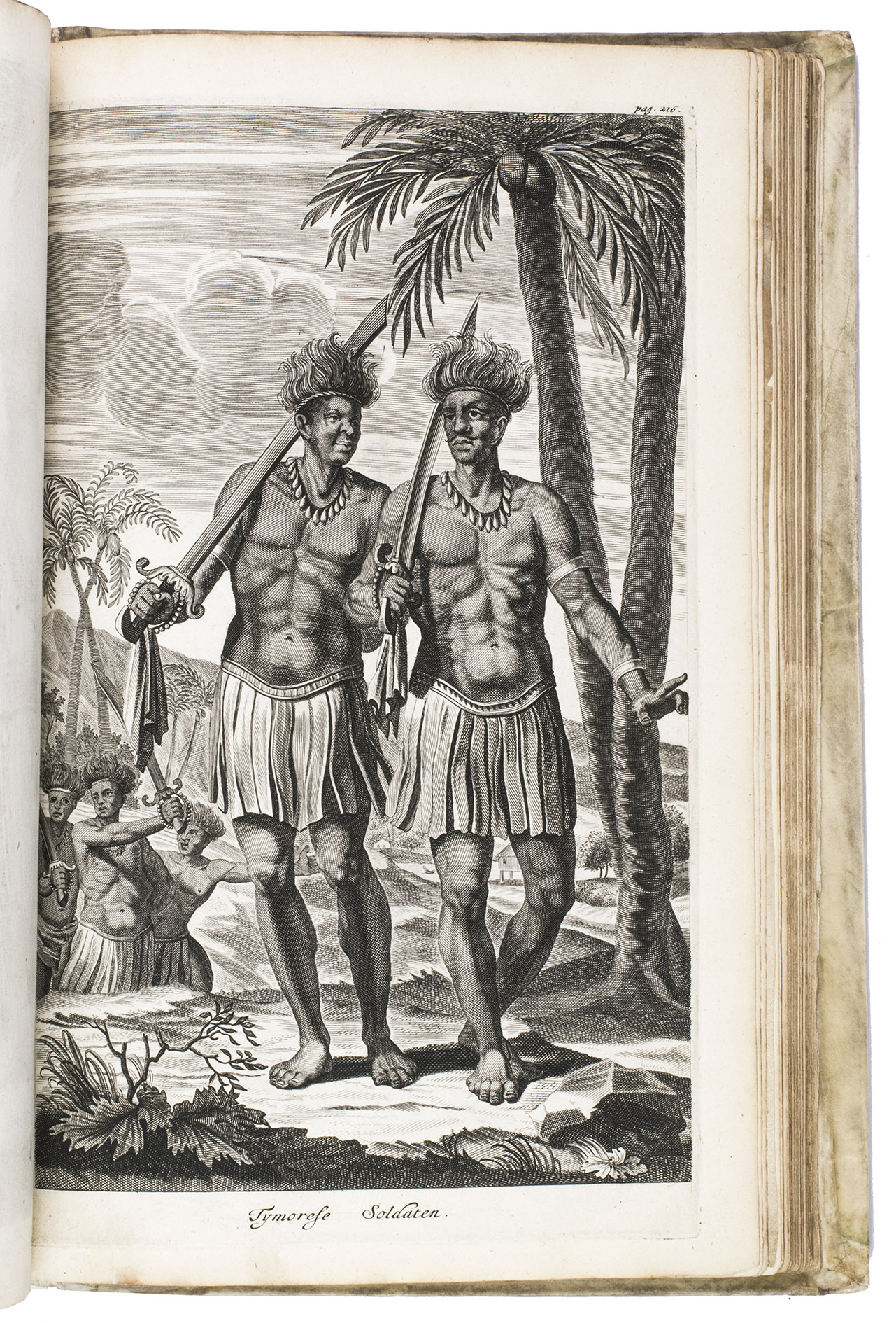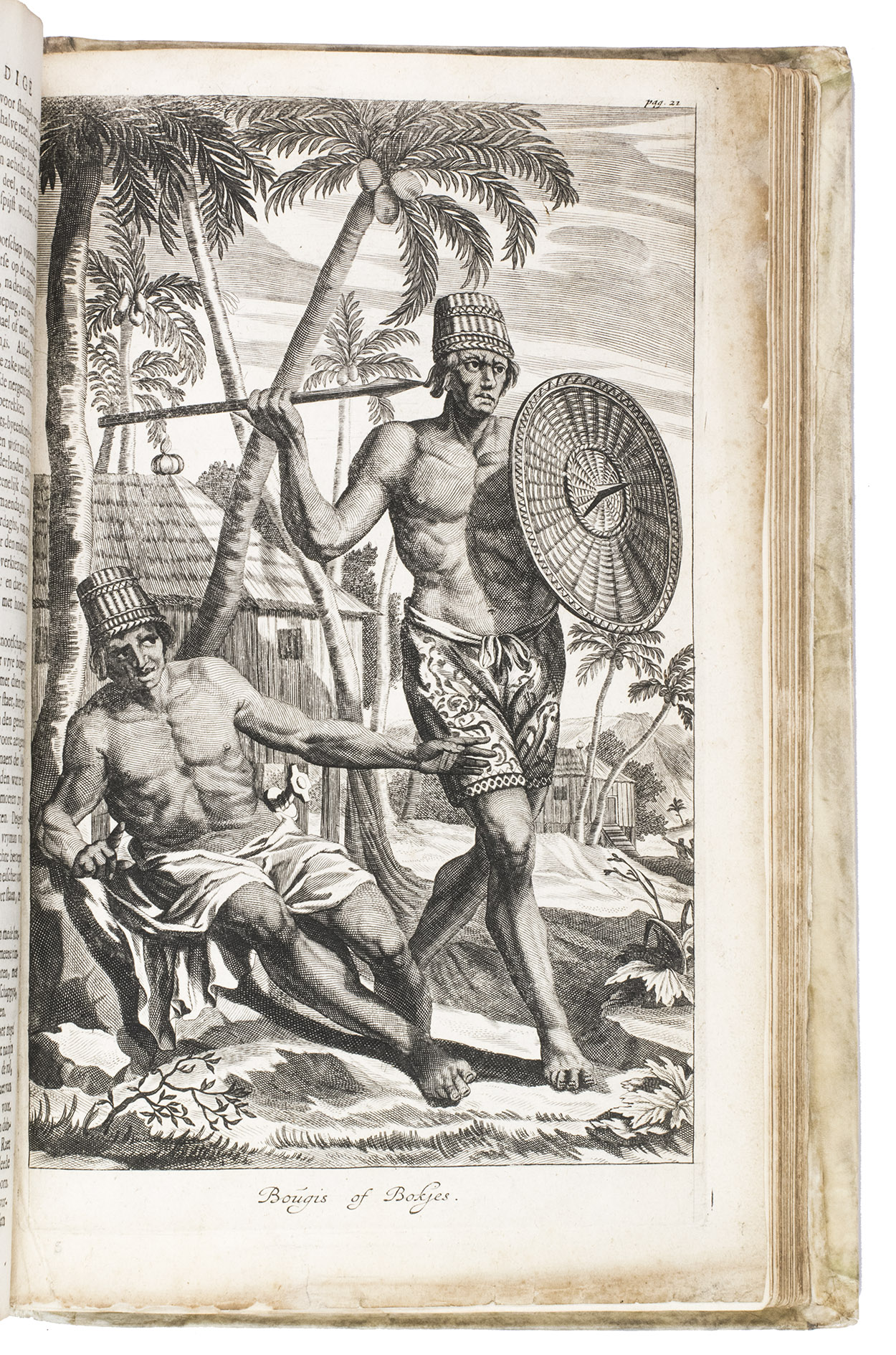 The binding has been professionally restored, the vellum is creased and somewhat stained, the edges of the boards are very slightly scuffed. The leaves are slightly browned around the edges, the full-page illustration on page 145 of volume 2 comes from another copy and has been added later, the full-page illustration on page 219 has a different title than what it should have according to the "aanwijzing voor den boekbinder" and shows 2 Bougis men, instead of a man and a woman. Otherwise in good condition. Ad 1: Alden & Landis 682/126; Borba de Moraes p. 614 (gives publication year as 1681); Boxer, Dutch in Brazil, pp. 294-295; Brasilien Bibl. Robert Bosch, 145; JCB, p. 104; Lipperheide 1627; Rodrigues 1770; STCN 843094494; USTC 1818211; Ad 2: Alden & Landis 682/124; JCB, p. 105; Landwehr VOC 282; Lipperheide 1472; STCN 8430946356; USTC 1818210; cf. both works together: Nissen, ZBI 2975; Sabin 55278; STCN 843094311; Tiele, Bibl. 799; USTC 1818212; for Nieuhof: NNBW VIII, cols. 1216-1217.