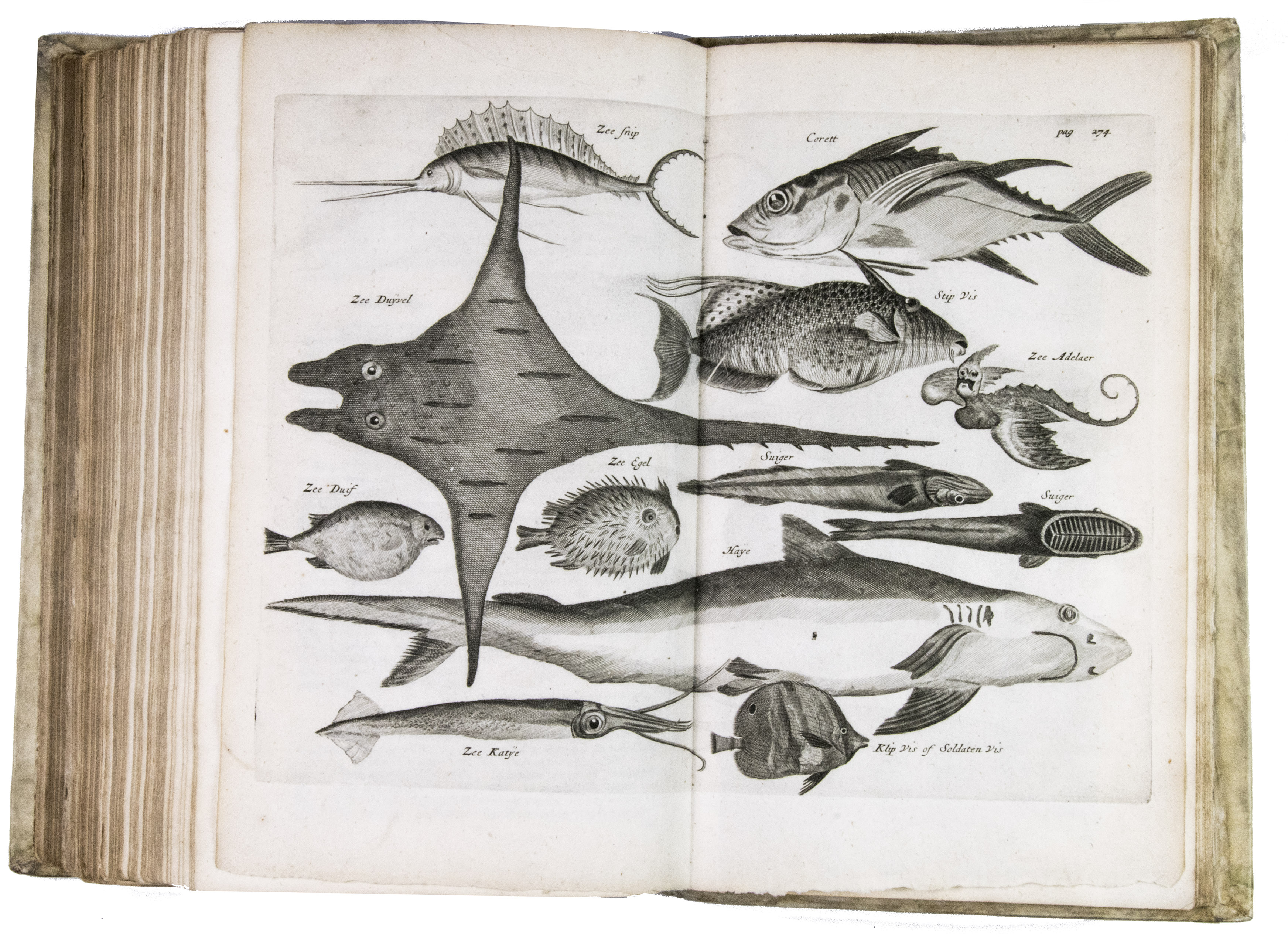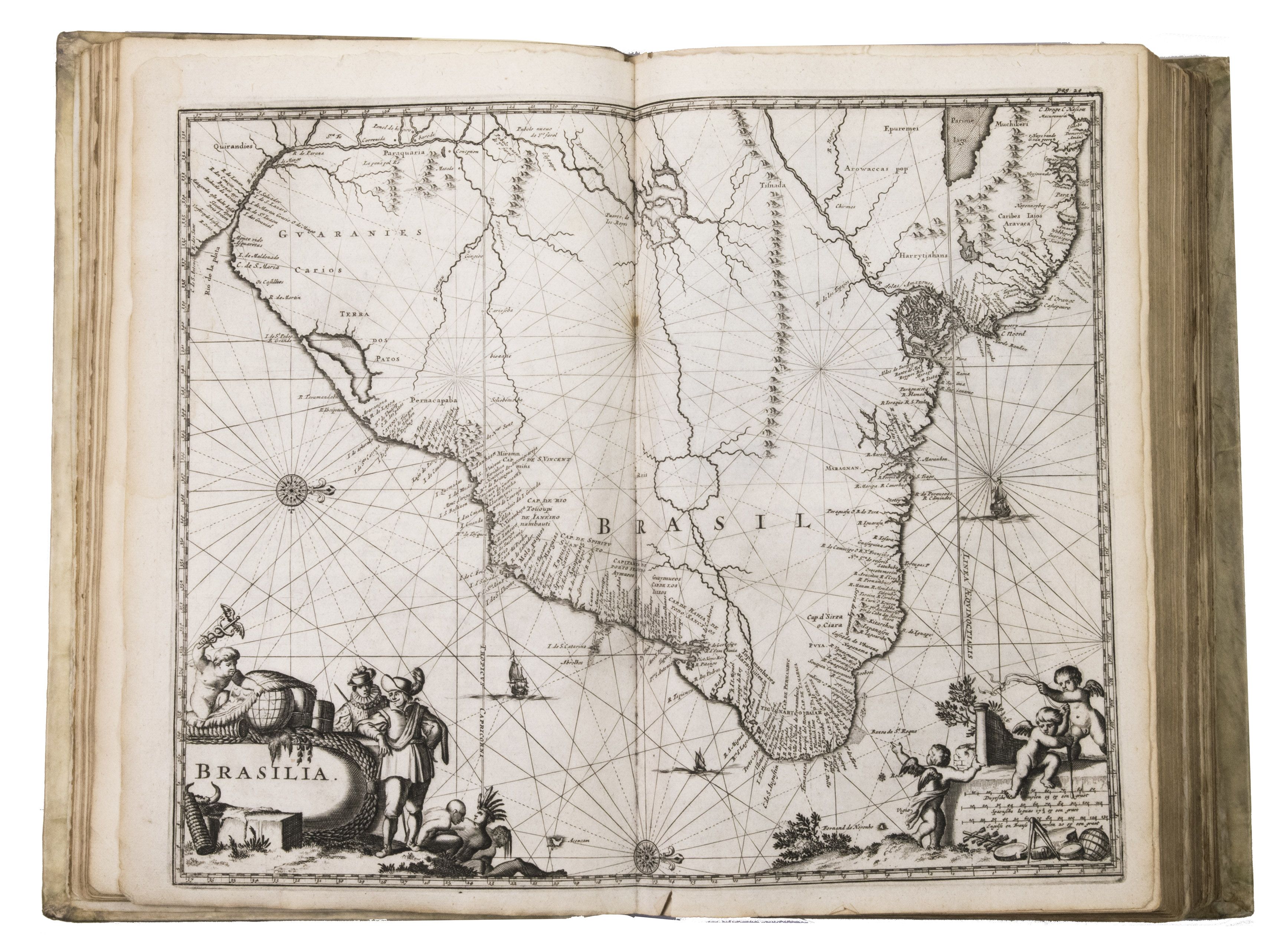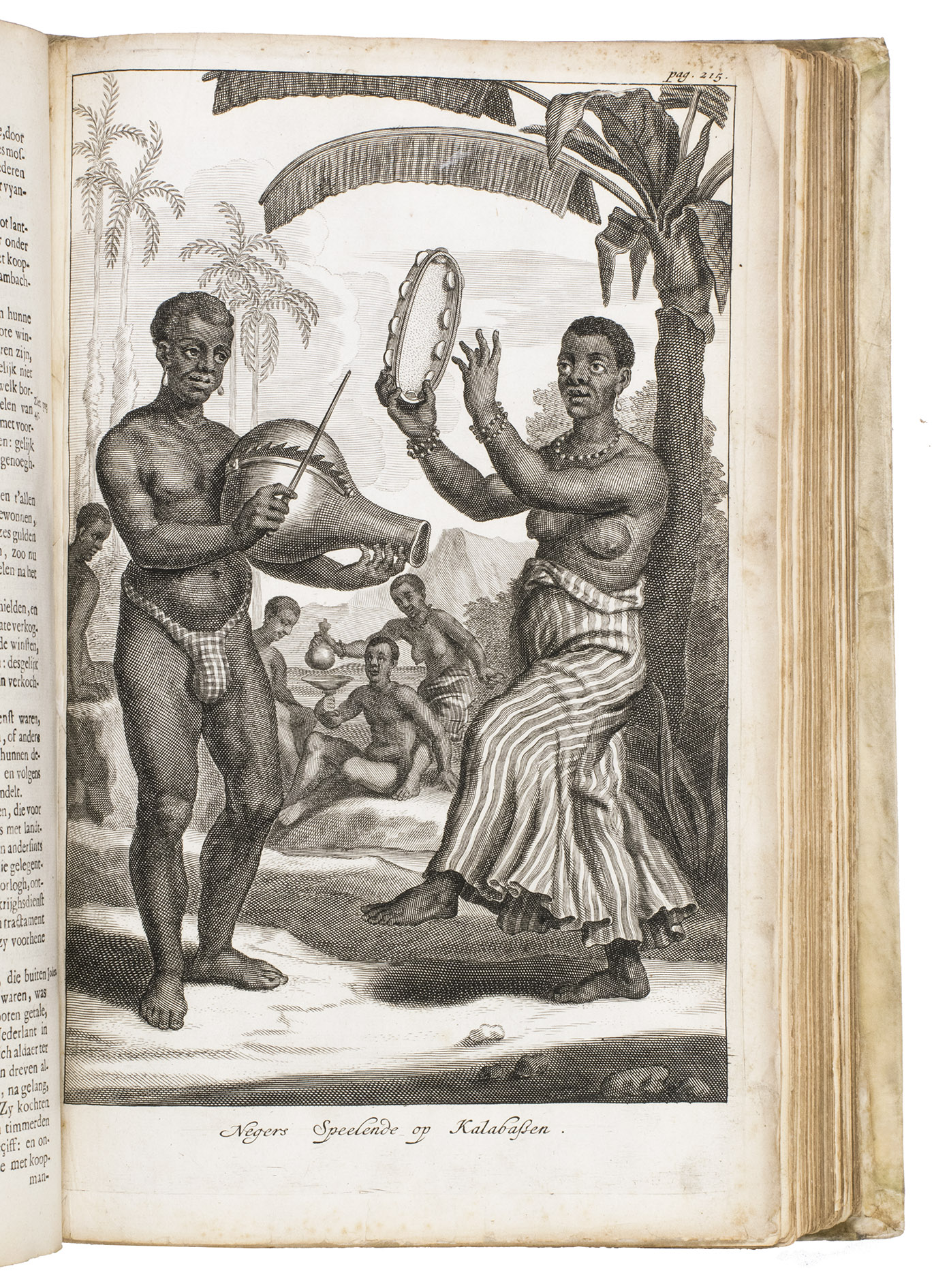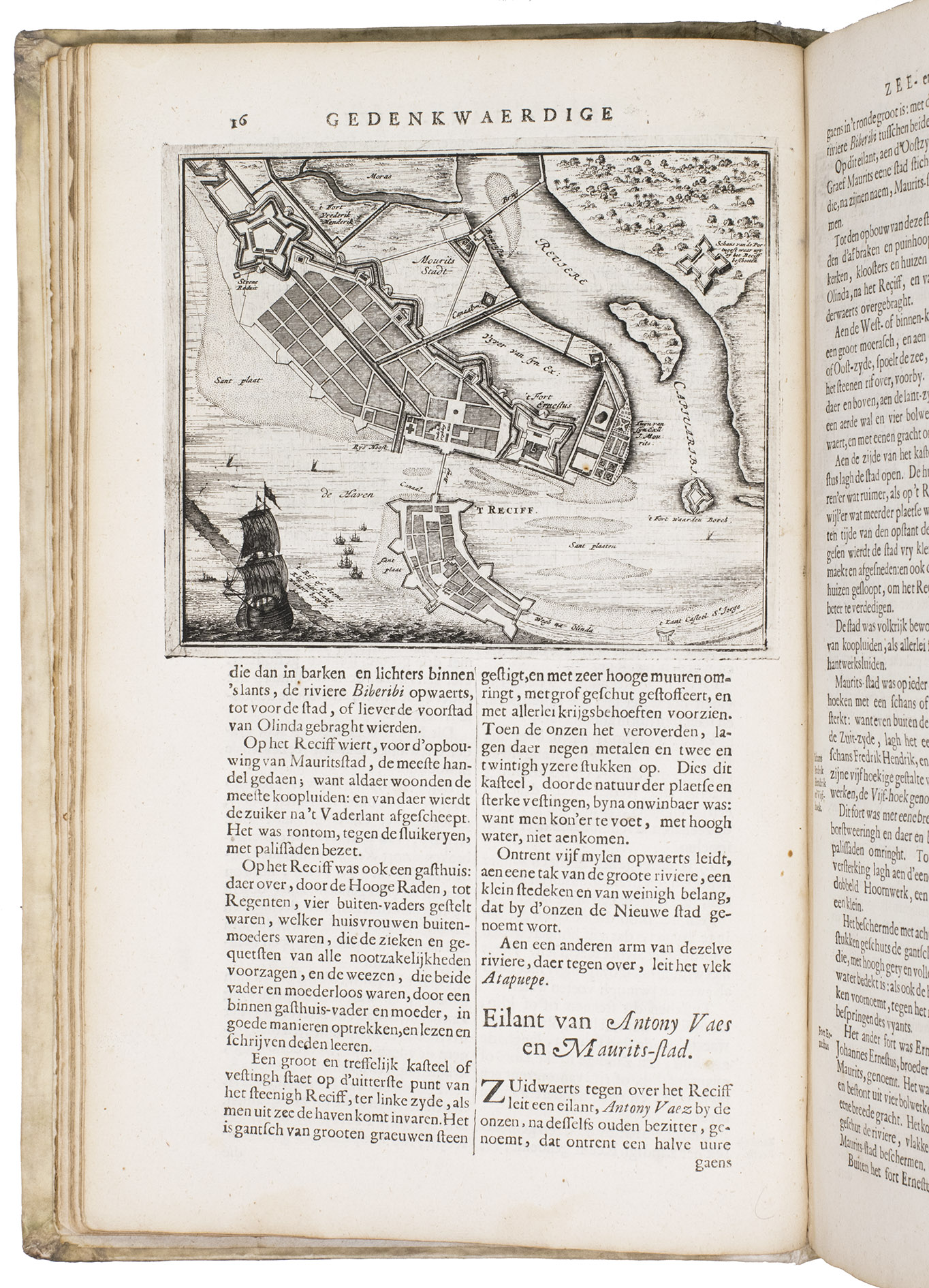 The binding has been professionally restored, the vellum is creased and somewhat stained, the edges of the boards are very slightly scuffed. The leaves are slightly browned around the edges, the full-page illustration on page 145 of volume 2 comes from another copy and has been added later, the full-page illustration on page 219 has a different title than what it should have according to the "aanwijzing voor den boekbinder" and shows 2 Bougis men, instead of a man and a woman. Otherwise in good condition. Ad 1: Alden & Landis 682/126; Borba de Moraes p. 614 (gives publication year as 1681); Boxer, Dutch in Brazil, pp. 294-295; Brasilien Bibl. Robert Bosch, 145; JCB, p. 104; Lipperheide 1627; Rodrigues 1770; STCN 843094494; USTC 1818211; Ad 2: Alden & Landis 682/124; JCB, p. 105; Landwehr VOC 282; Lipperheide 1472; STCN 8430946356; USTC 1818210; cf. both works together: Nissen, ZBI 2975; Sabin 55278; STCN 843094311; Tiele, Bibl. 799; USTC 1818212; for Nieuhof: NNBW VIII, cols. 1216-1217.