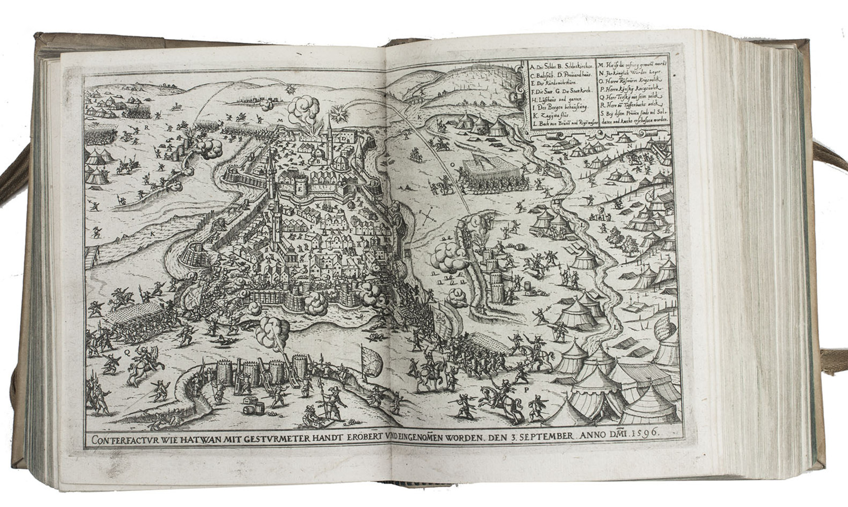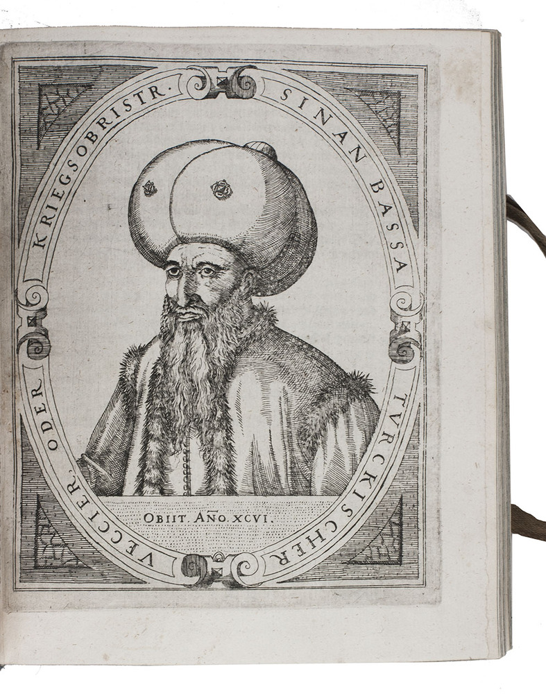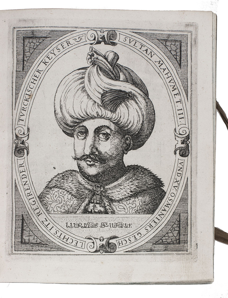 The 30 double-page plates show a.o. the sieges and the fortifications of the following cities: Vienna, Zolnoch, Tocaky, Guyla, Zigeth, Sysegk, Palotta, Villeck, Raab, Comorra, Gran, Vizzegrad, Tergovist, Temeswar, Hatwan, Petrina, Tottis, Papa, Waitzen, Budapest (Ofen & Pest 2x), Tolna, Stulweisenburg, Canisha, the execution of count Hardeck and an execution at Canisha. The cities were either besieged by the Turkss or the Turkish cities by the Christians. The 26 full-page portraits show the Turkish sultans and the Hungarian military commanders and rulers. Ad 1:ADB 24, pp. 445-6; Bircher C 3719; VD17 12:189286H; cf. Apponyi 747 (Dutch translation); Atabey 882 (first edition); BLC German (17th cent.); O-45 (idem); ad 2: Bircher D797; ad 4: cf. Rill, Kaiser Matthias. Bruderzwist und Glaubenskampf (1999).