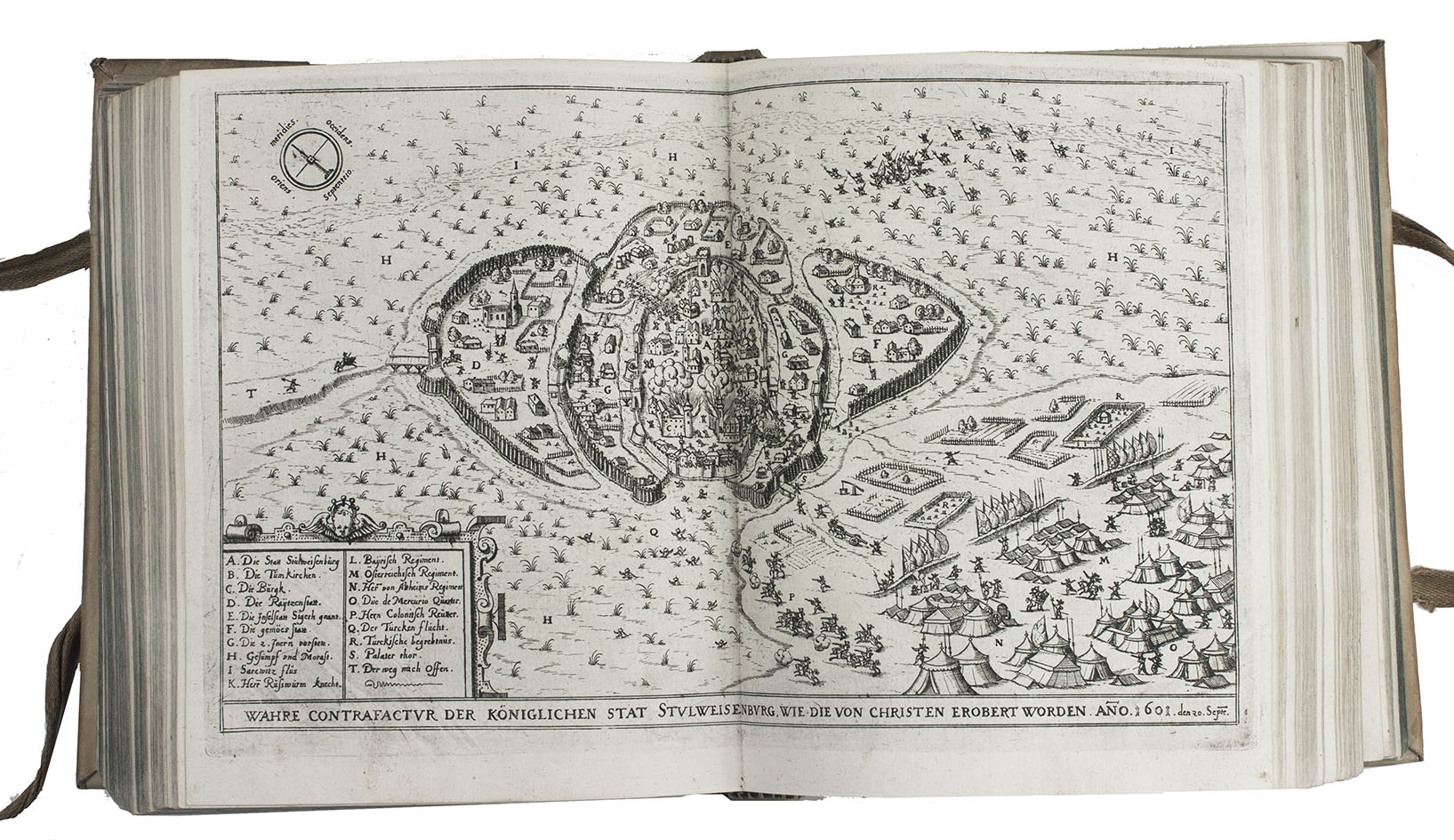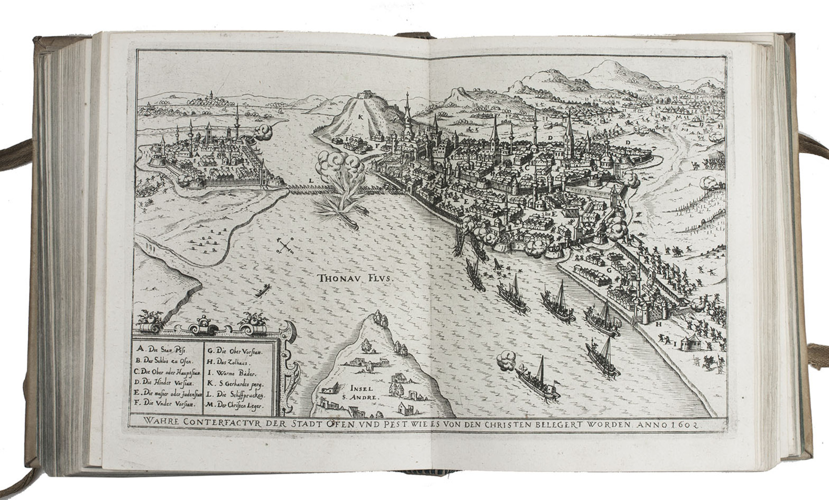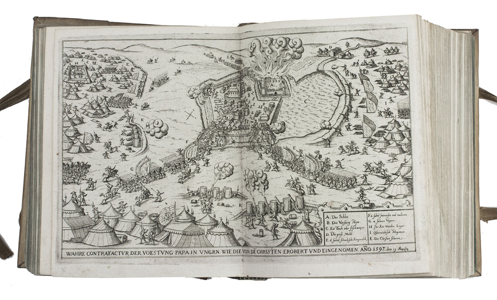 The 30 double-page plates show a.o. the sieges and the fortifications of the following cities: Vienna, Zolnoch, Tocaky, Guyla, Zigeth, Sysegk, Palotta, Villeck, Raab, Comorra, Gran, Vizzegrad, Tergovist, Temeswar, Hatwan, Petrina, Tottis, Papa, Waitzen, Budapest (Ofen & Pest 2x), Tolna, Stulweisenburg, Canisha, the execution of count Hardeck and an execution at Canisha. The cities were either besieged by the Turkss or the Turkish cities by the Christians. The 26 full-page portraits show the Turkish sultans and the Hungarian military commanders and rulers. Ad 1:ADB 24, pp. 445-6; Bircher C 3719; VD17 12:189286H; cf. Apponyi 747 (Dutch translation); Atabey 882 (first edition); BLC German (17th cent.); O-45 (idem); ad 2: Bircher D797; ad 4: cf. Rill, Kaiser Matthias. Bruderzwist und Glaubenskampf (1999).