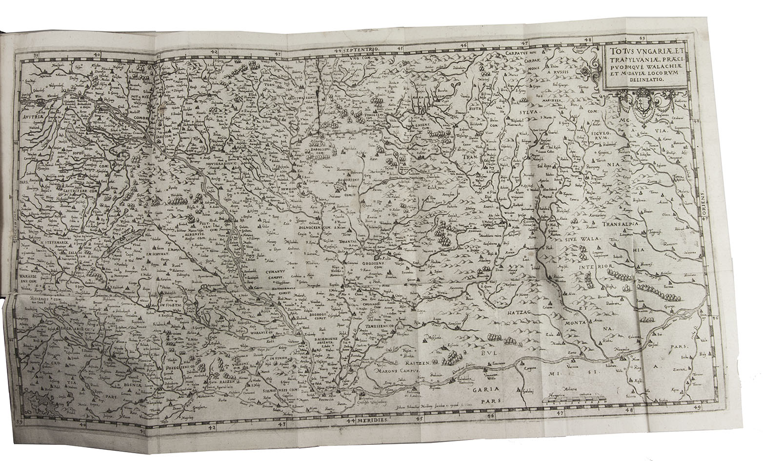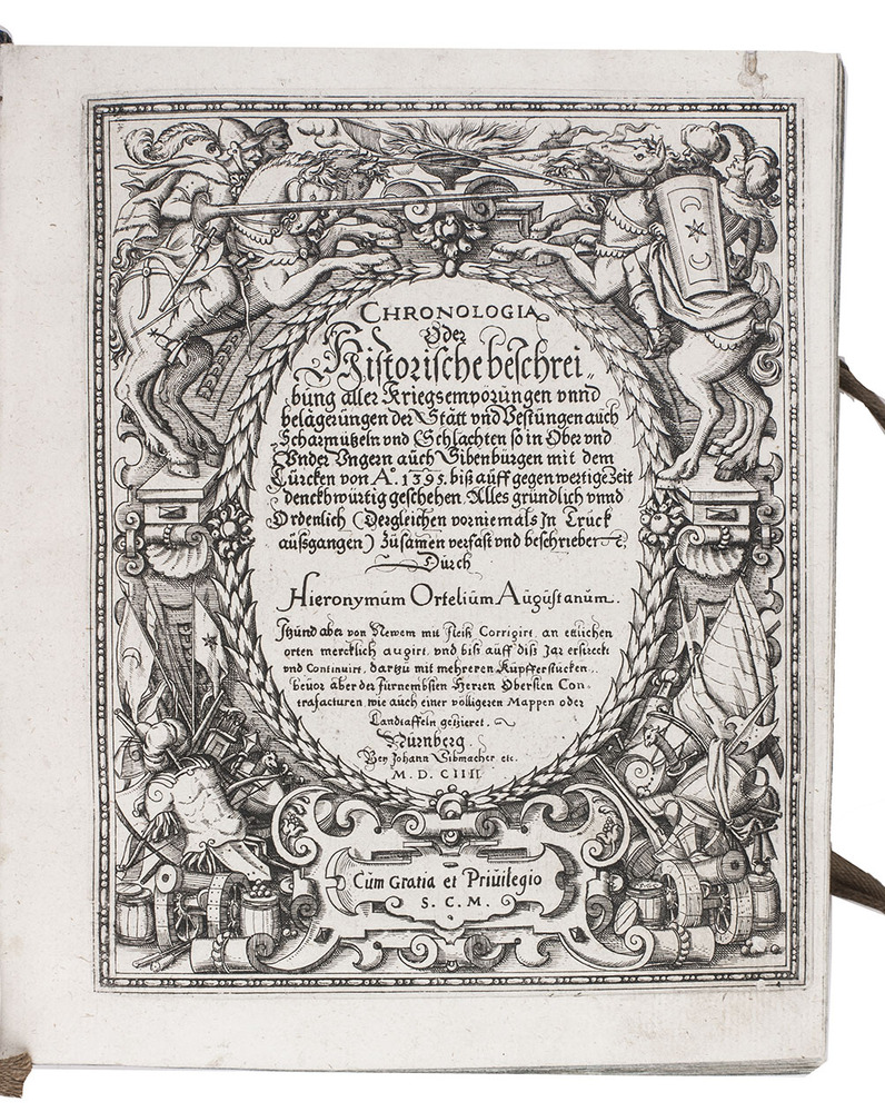 Complete text of a highly important historical work in 4 separately published volumes - here bound together - on the military history of the Austro-Hungarian region, including Transylvania, during the years 1395 -1612, describing all the wars, sieges of cities and fortresses, battles with the Turks and other noteworthy events in Hungary, written and assiduously recorded by Hieronymus Ortelius or Oertel (1543-1614). Nothing like this was ever printed before. Especially the period 1592-1612 is treated in great detail since the author included eyewitness reports on the Turkish invasions in the region. The author, a notary at the imperial court, was encouraged to write the work by his brother-in-law, Johann Sibmacher, a Nuremberg engraver and publisher, who was also responsible for the engraved plates in the first volume which includes a large engraved folding map of Hungary, Transylvania, and Moldavia (28×51 cm).