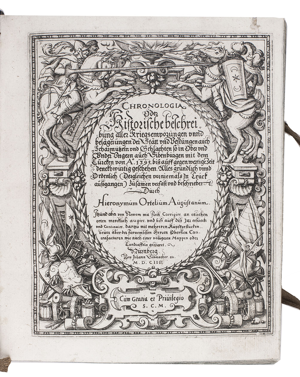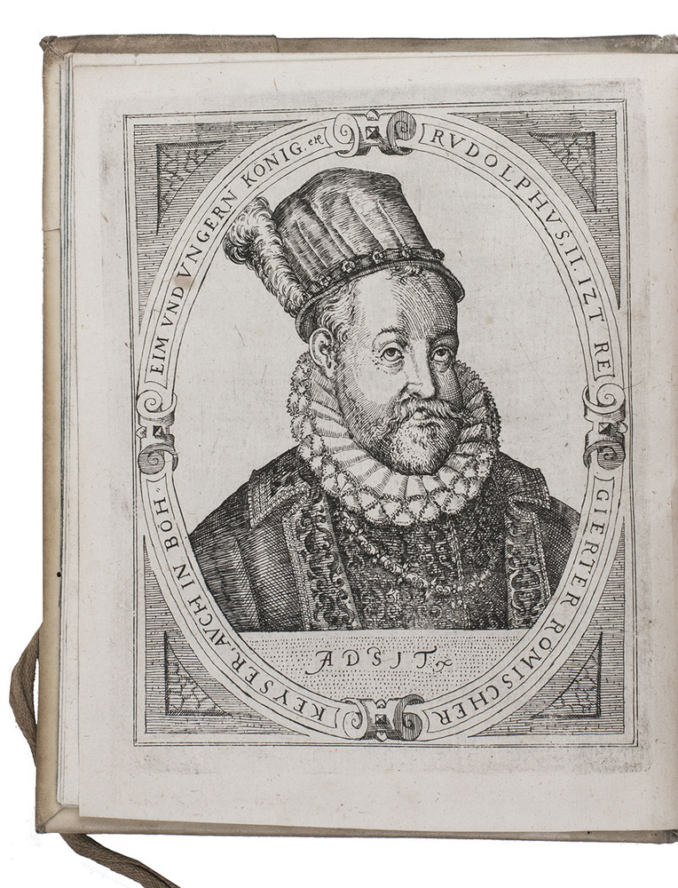 Nuremberg, Christoff Lochner for Johann Sibmacher, 1604. With engraved title in elaborately decorated border with cavalry, arms and armour, large engraved folding map (28×51 cm), 30 double-page engraved views, 26 full-page engraved portraits, woodcut initials and head- and tailpieces.