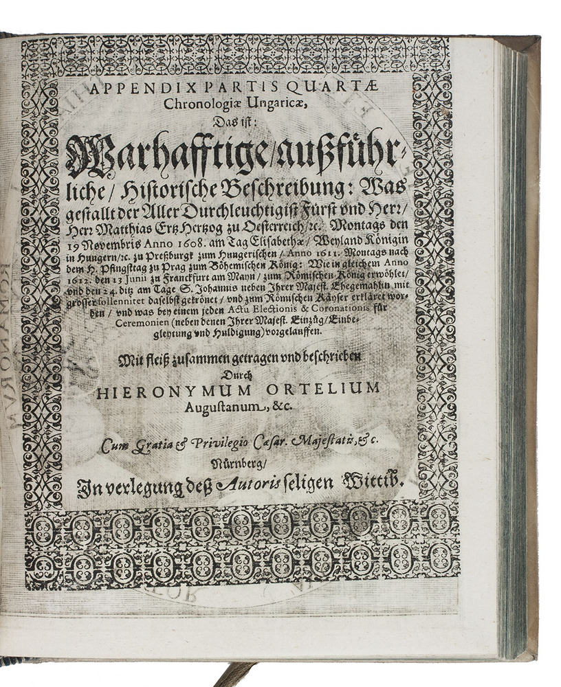 (4) OERTEL, Hieronymus. Appendix partis quartae Chronologiae Ungaricae, das ist; warhafftige ausführliche historische Beschreibung: was gestallt der aller durchleuchtigist Fürst und Herr herr Matthias Ertz Herzog zu Oesterreich, etc. Montags den 19 Novembris anno 1608 . . . und zum Römischen Kayser erkäret worden (ist; 1612) . . .