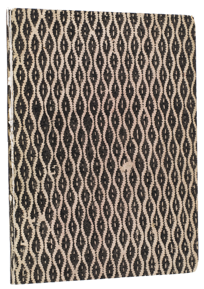 Verona, Paolo Ravagnano, 1560. 4to. With Ravagnanos woodcut emblematic device on the title-page (a hand emerging from a cloud and holding a stalk with three lilies, the whole in an oval in a rectangular scrollwork cartouche, with the motto, "candidio animus"), a folding plate (oblong long folio: 15.5 x 41.5 cm) containing 2 woodcuts (12.5 x 22 cm & 12 cm diameter with the 4.5 cm gnomen making it 14 x 13 cm) designed to be cut up to make the authors "horoscopio" in the form of a volvelle and the sundial-lunar dial, 3 decorated woodcut initials (pictorial), planetary and zodiac signs, and numerous tables of numerical data. 19th-century(?) boards, covered with block-printed decorated paper (black on white). [46], [2 blank] pp.