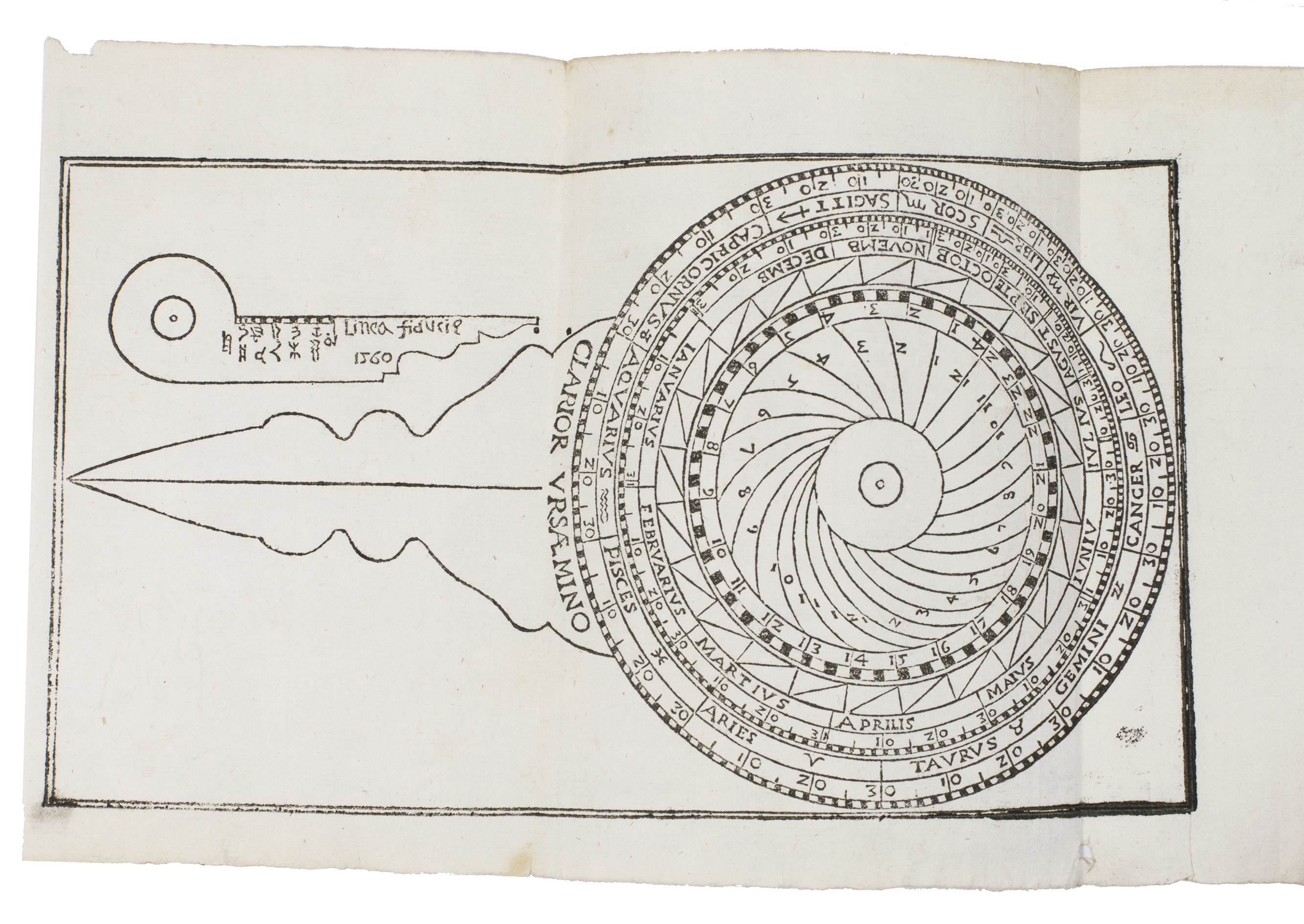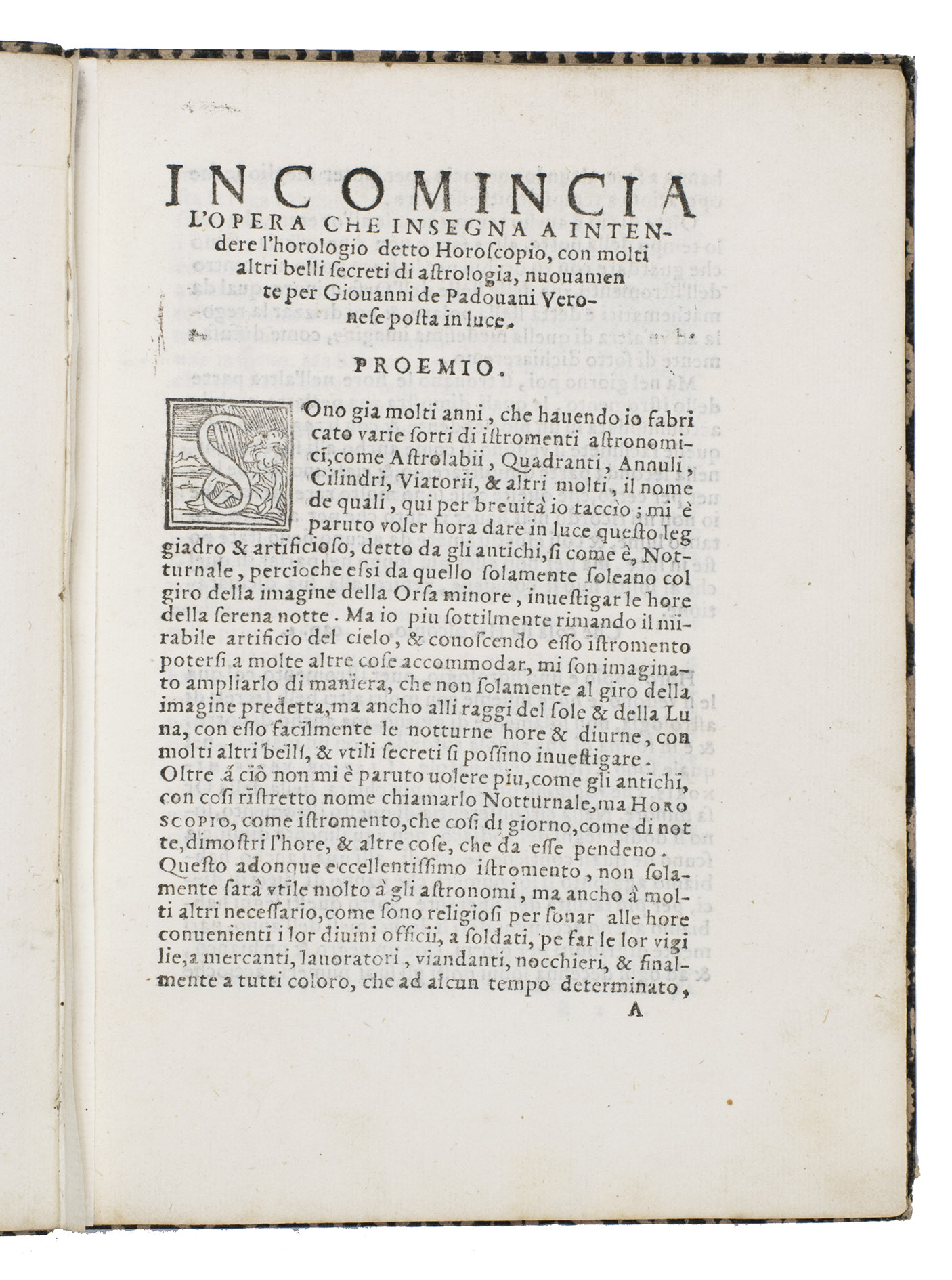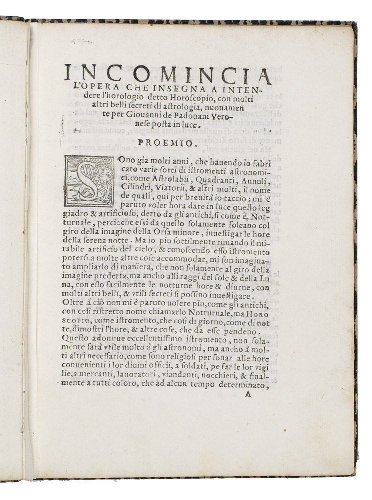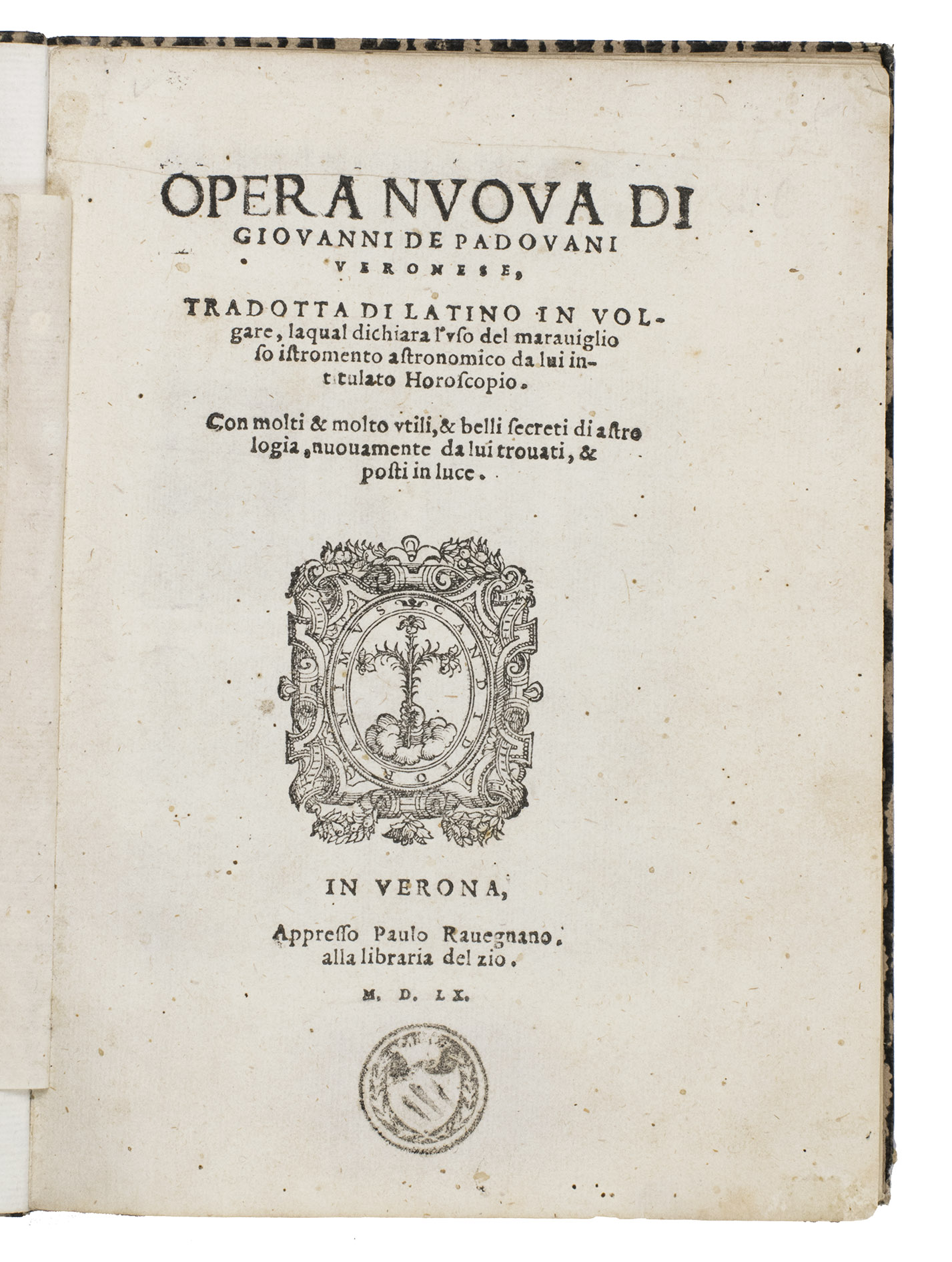 The rare first significant publication (extremely rare with the folding woodcut plate) by the Veronese astronomer Giovanni Padovani (ca. 1512-ca. 1590), explaining the use of his "horoscopio", also known as a nocturnal or a horologium nocturnum, which he presents as his new invention. The folding plate contains two woodcuts for the owner to cut out and assemble (they could be pasted on paperboard or thin wood) to make two astronomical instruments that allow one to determine time by the sun, moon or stars. The plate may have been an option for those who could afford it, but many owners no doubt removed it in order to use it, as intended. The entire plate is lacking in nearly all copies, including those of the British Library and the Biblioteca Nazionale Naples, viewable on the Internet. Giuliari refers to "la figura incisa sul legno", but we have seen only one clear reference to a copy that includes the plate, at the Biblioteca Nacional in Madrid: "[1] h. de grab. pleg." (the Bibliothèque Nationale in Paris refers less clearly to "pièces limin.", and the Cat. del. Servizio Bibl. Nazionale notes "ill." but gives a link to the Naples copy without the plate). Neither Honeyman nor Houzeau & Lancaster mention the plate and Riccardi apparently knew it only from Giuliaris reference.