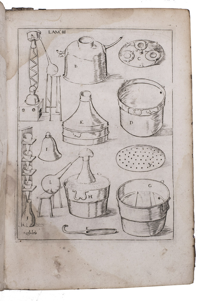 Rare fifth(?) edition, published in the year of the authors death, of a work on pharmaceutical chemistry written by the Spanish apothecary Félix Palacios (1677-1737). When the Palestra pharmaceutica appeared in 1706, it was the first work on the subject written in the Spanish language. Even though it became widely accepted and used in Spain, Palacios met strong resistance from his colleagues because he rejected the galenic, or plant based, medicines in favour of chemical medicines. With this he rejected the ideas of Galen, Mesue and Dioscorides, which were still the standard in most parts of Europe and the Middle East. The work starts with a preliminary text, followed by a chapter on the general principles of pharmacology and chemistry in the form of questions and answers. The other four chapters deal with the ingredients and making of the medicines. It discusses distillation and calcination methods with the engraved plates showing various tools and instruments: pots, furnaces, alambics etc.