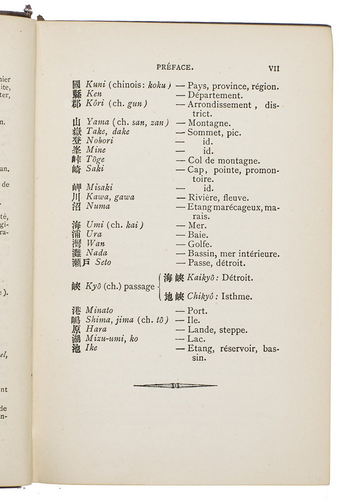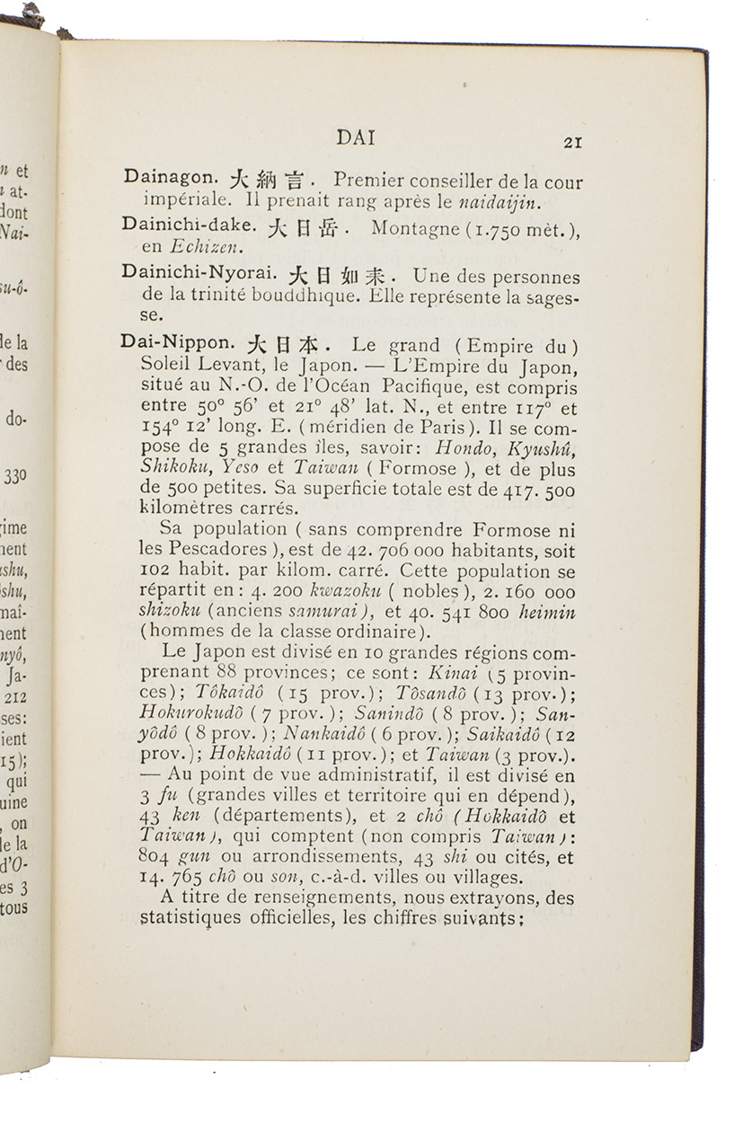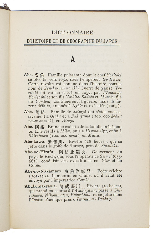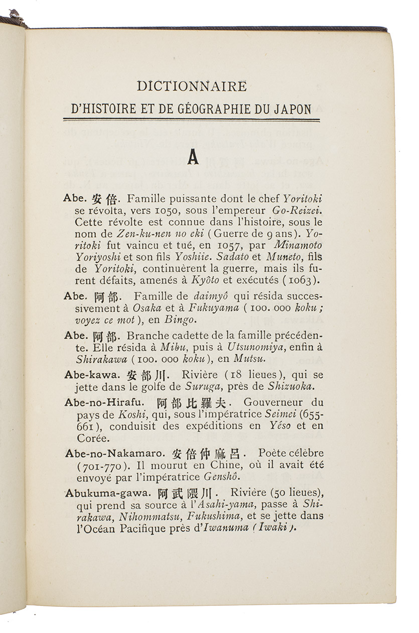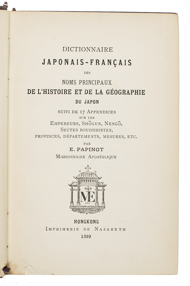 First edition of a French-Japanese dictionary written by Edmond Papinot (b. 1860), an apostolic missionary. The goal of Papinot's work was to give summary information on the principal names that can be found in the history and geography of Japan. He includes the names and genealogy of all the emperors and empresses of Japan, the nengo, the names of the mountains higher than 2000 meters, the most important rivers and cities of more than 20,000 inhabitants, but also a list of the shogun, a genealogy of the Taira, Minamoto, Ashikaga, Tokugawa, a tabel of buddhist sectes, a list of the provinces and departments, the signs and elements of the zodiac, and a table of the months and seasons.