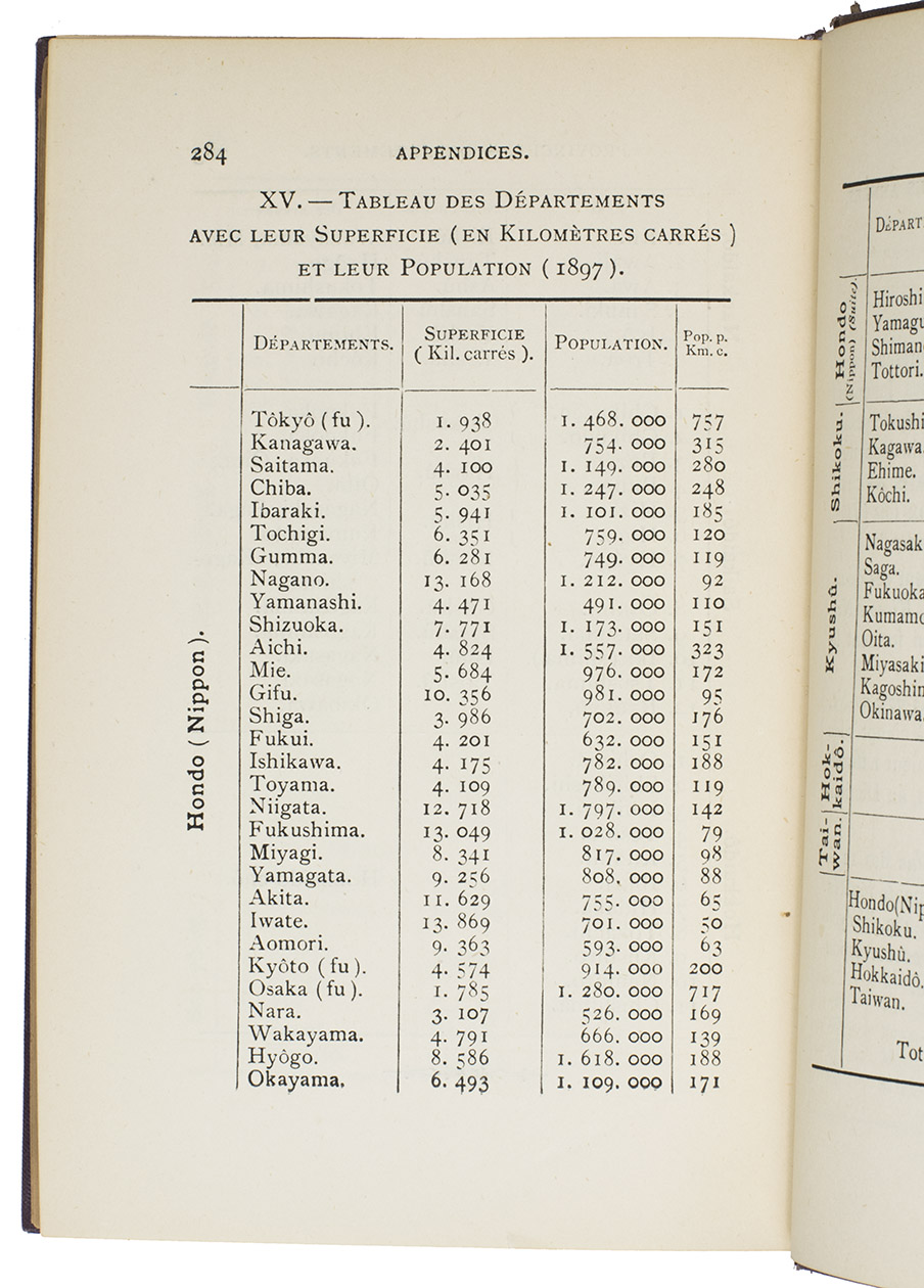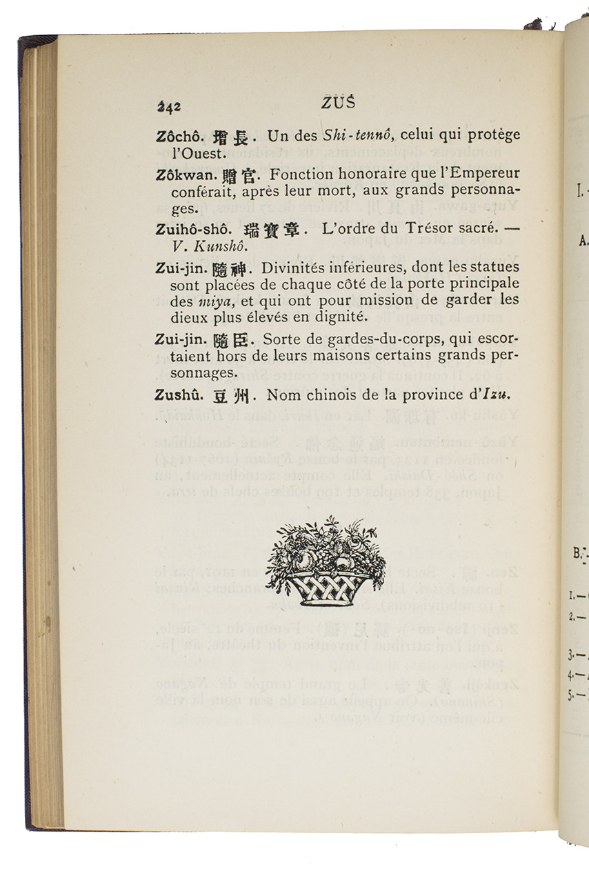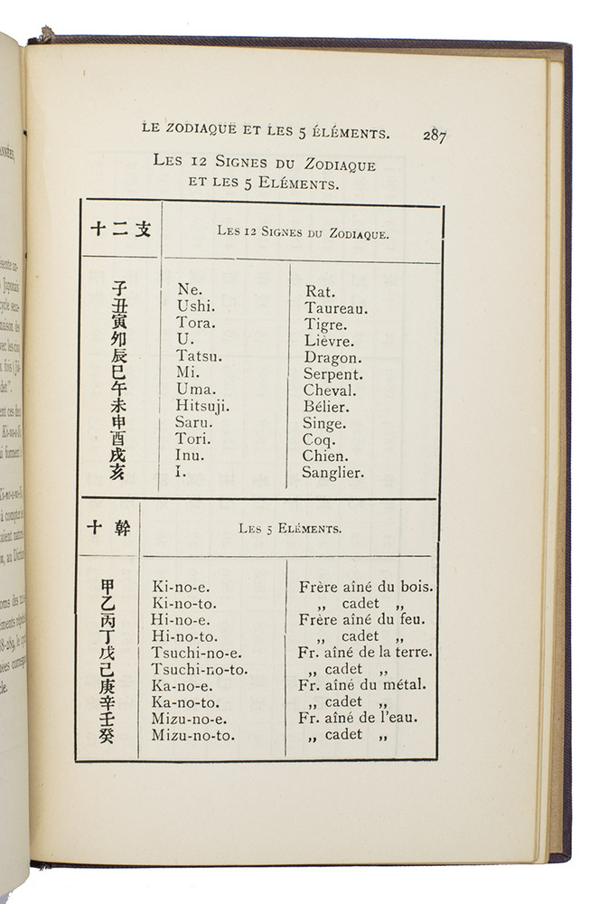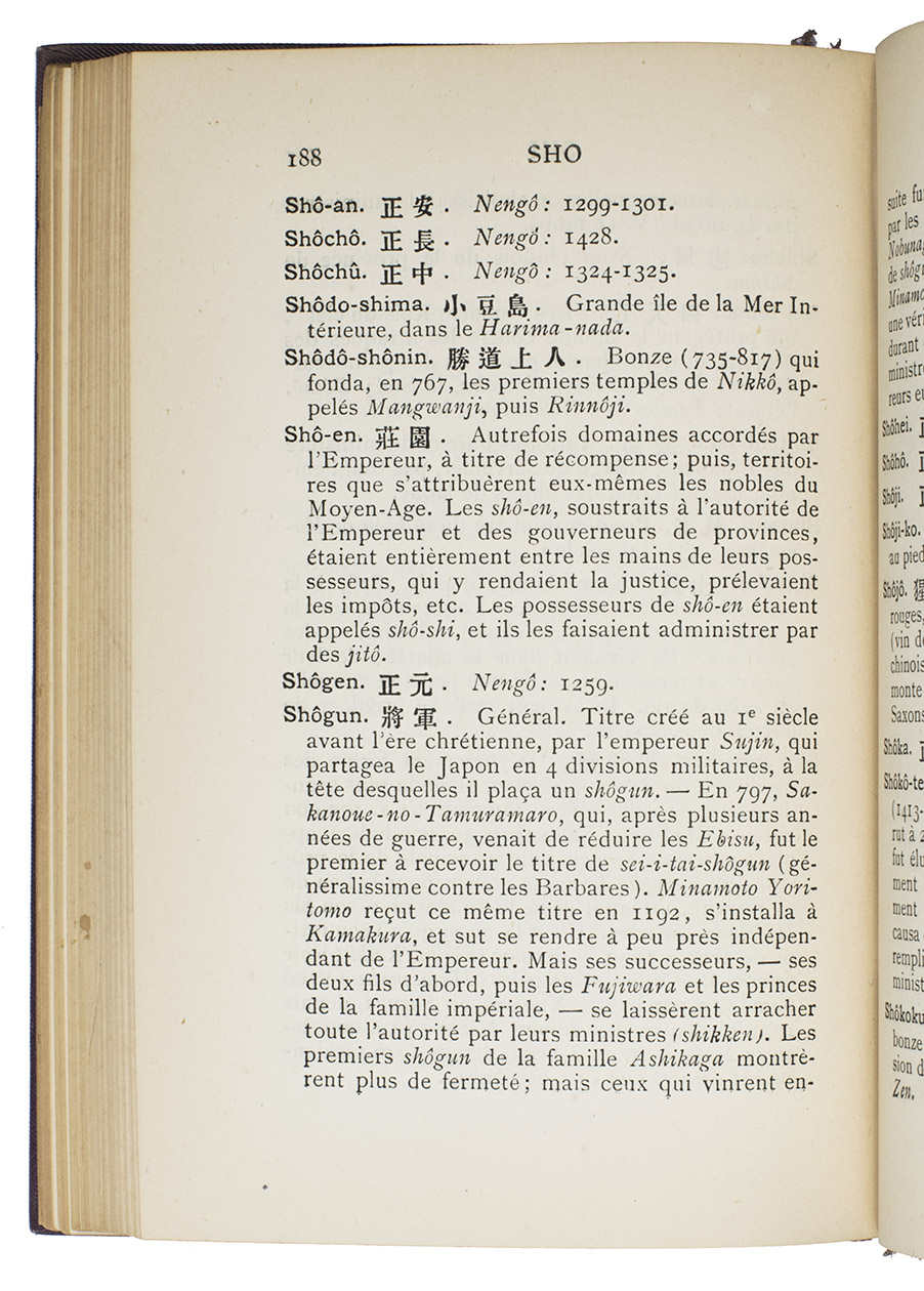 First edition of a French-Japanese dictionary written by Edmond Papinot (b. 1860), an apostolic missionary. The goal of Papinot's work was to give summary information on the principal names that can be found in the history and geography of Japan. He includes the names and genealogy of all the emperors and empresses of Japan, the nengo, the names of the mountains higher than 2000 meters, the most important rivers and cities of more than 20,000 inhabitants, but also a list of the shogun, a genealogy of the Taira, Minamoto, Ashikaga, Tokugawa, a tabel of buddhist sectes, a list of the provinces and departments, the signs and elements of the zodiac, and a table of the months and seasons.