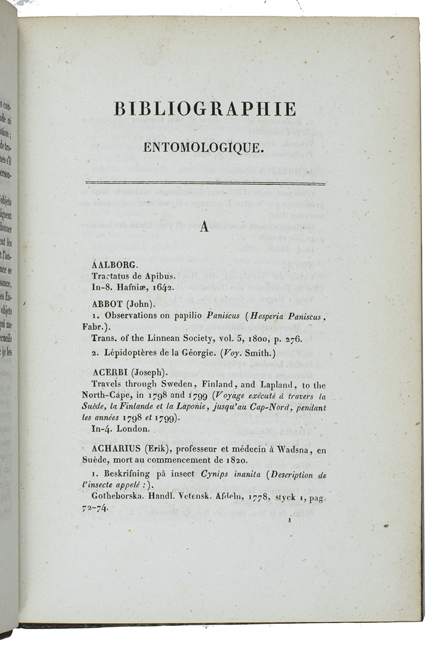 Bibliographie Entomologique, comprenant l'indication par ordre alphabétique 1. Des ouvrages entomologiques publiés en France et à l'étranger, depuis les temps les plus réculés jusques et y compris l'année 1834; 2. Des monographies et mémoires contenus dans les recueils, journaux et collections académiques françaises et étrangères.