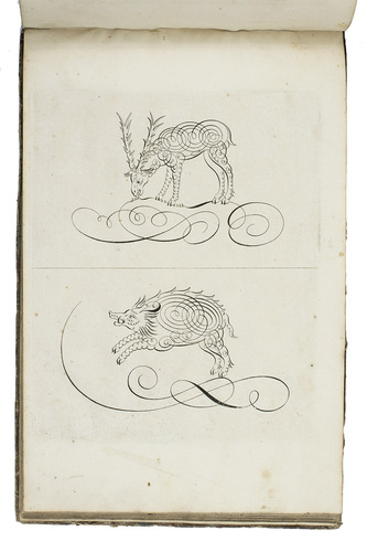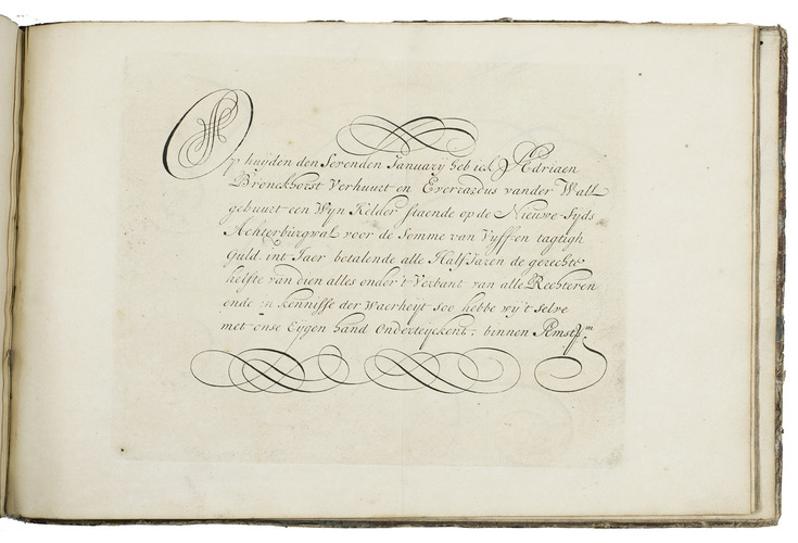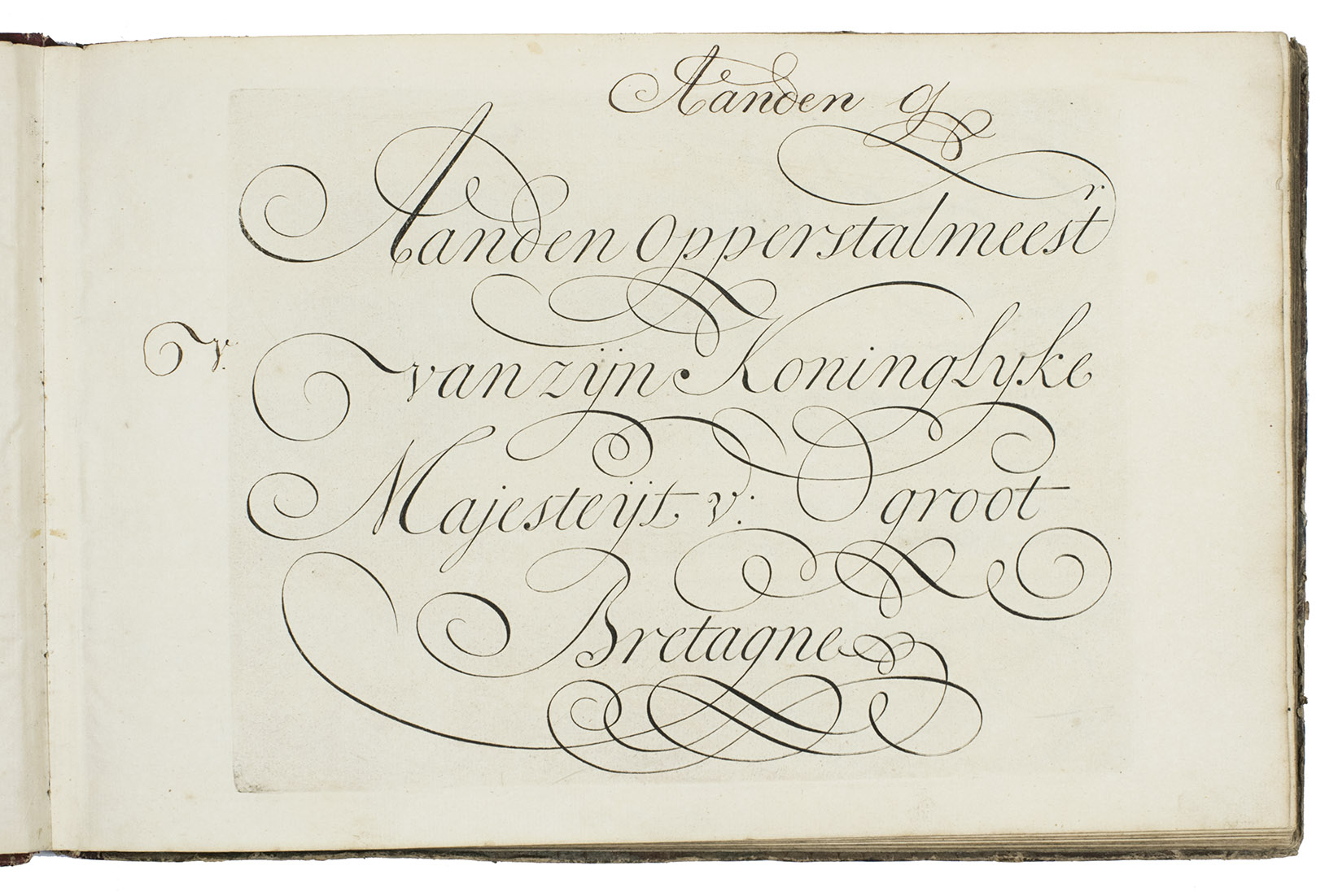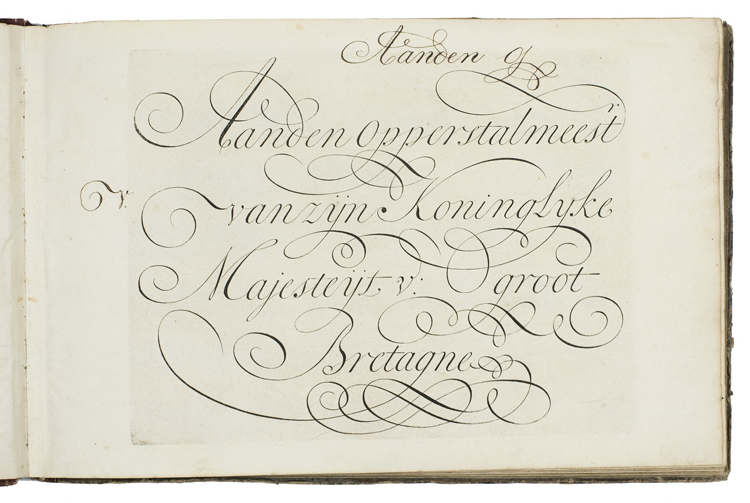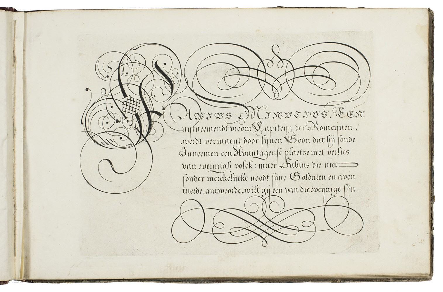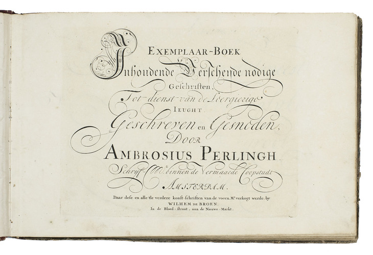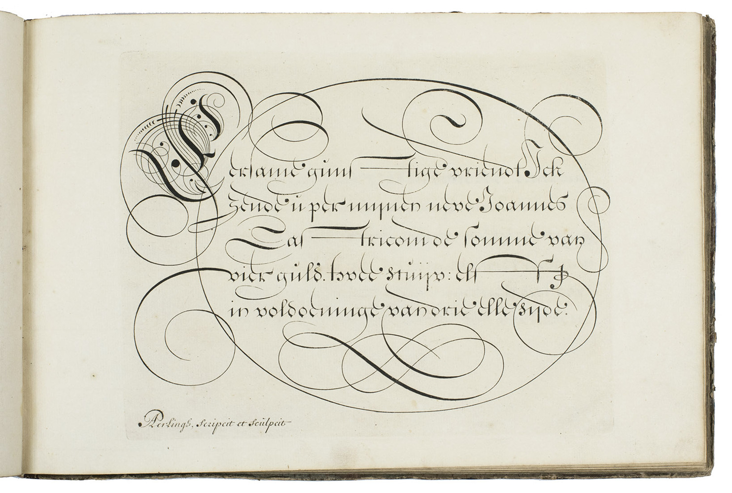 Second edition of a calligraphic model book by the best penman of the Dutch Republic, Ambrosius Perling(h) (1657-1718). Perling had the first edition published at his own expense in 1679. The De Broen family in Amsterdam published the present second edition and a third edition of ca. 1740. They had also brokered the rights to sell all the other works by Perling. For the present second edition Wilhem de Broen added 4 extra calligraphic models depicting animal grotesques, which are certainly highlights of the work.