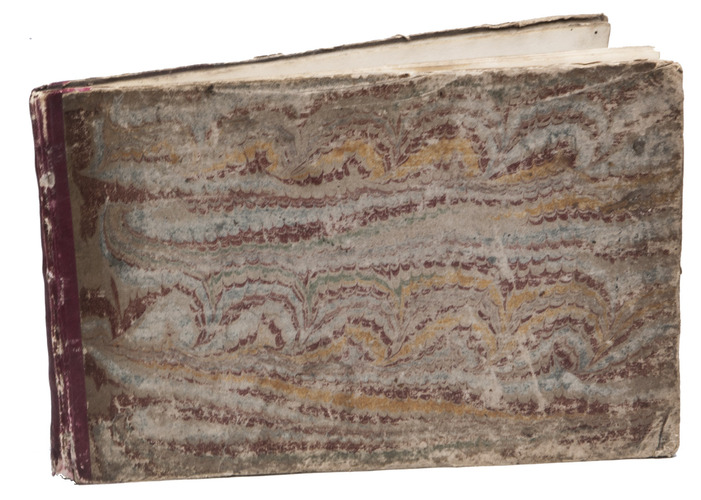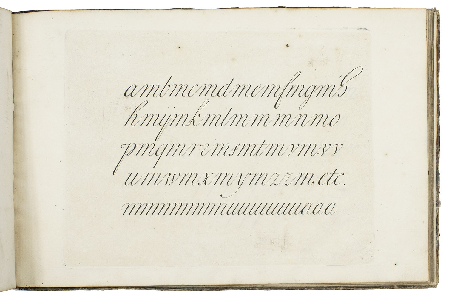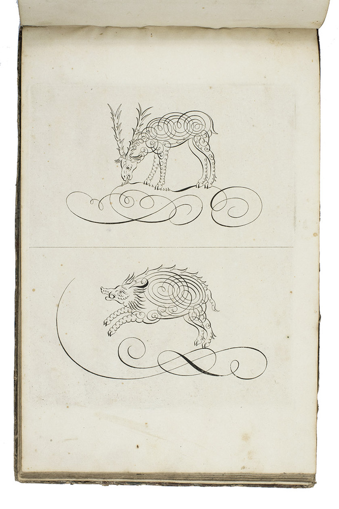 Amsterdam, Wilhem de Broen, [1721 or later]. Oblong folio (20 x 30 cm). With 51 plates drawn and engraved by the author. With a loose transparent paper sheet with a calligraphic drawing in ink. Contemporary red roan (sheepskin), marbled sides. [51] ll.