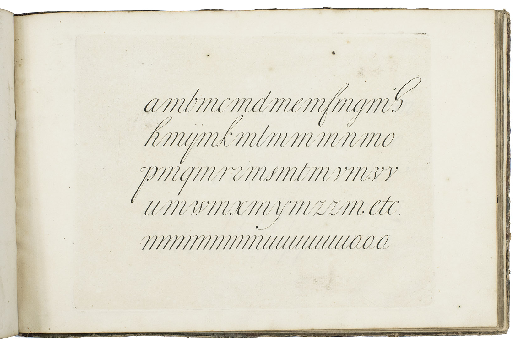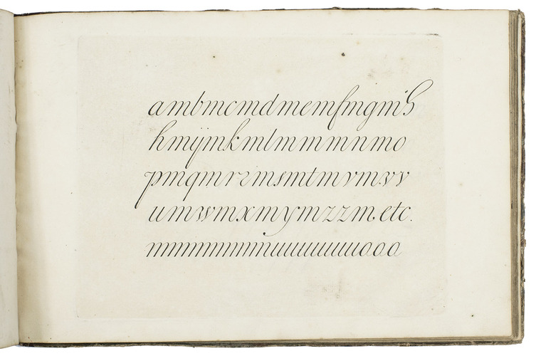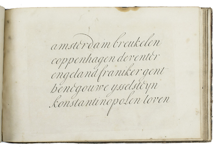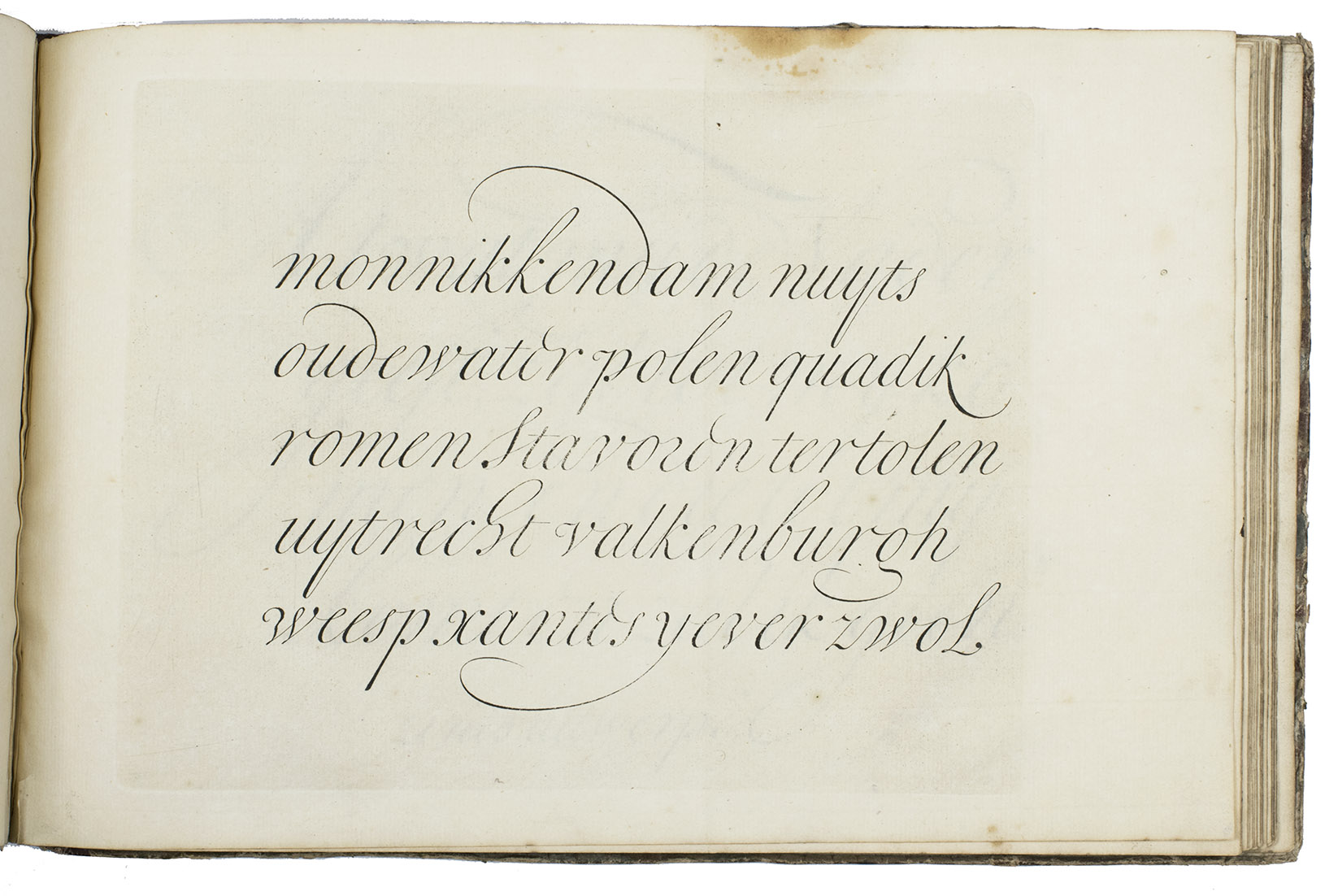 With some manuscript calligraphic inscriptions in ink. Minor spotting to the leaves, a small stain in the top margin of 12 leaves in the middle of the book. Binding rubbed, foot of spine worn. Otherwise in good condition. Ton Croiset van Unchelen "The writing master Ambrosius Perling", in: Quaerendo, 26, pp. 167-197); Ton Croiset van Uchelen, Van pen tot laser, IIa; STCN 283572957 (4 complete copies).