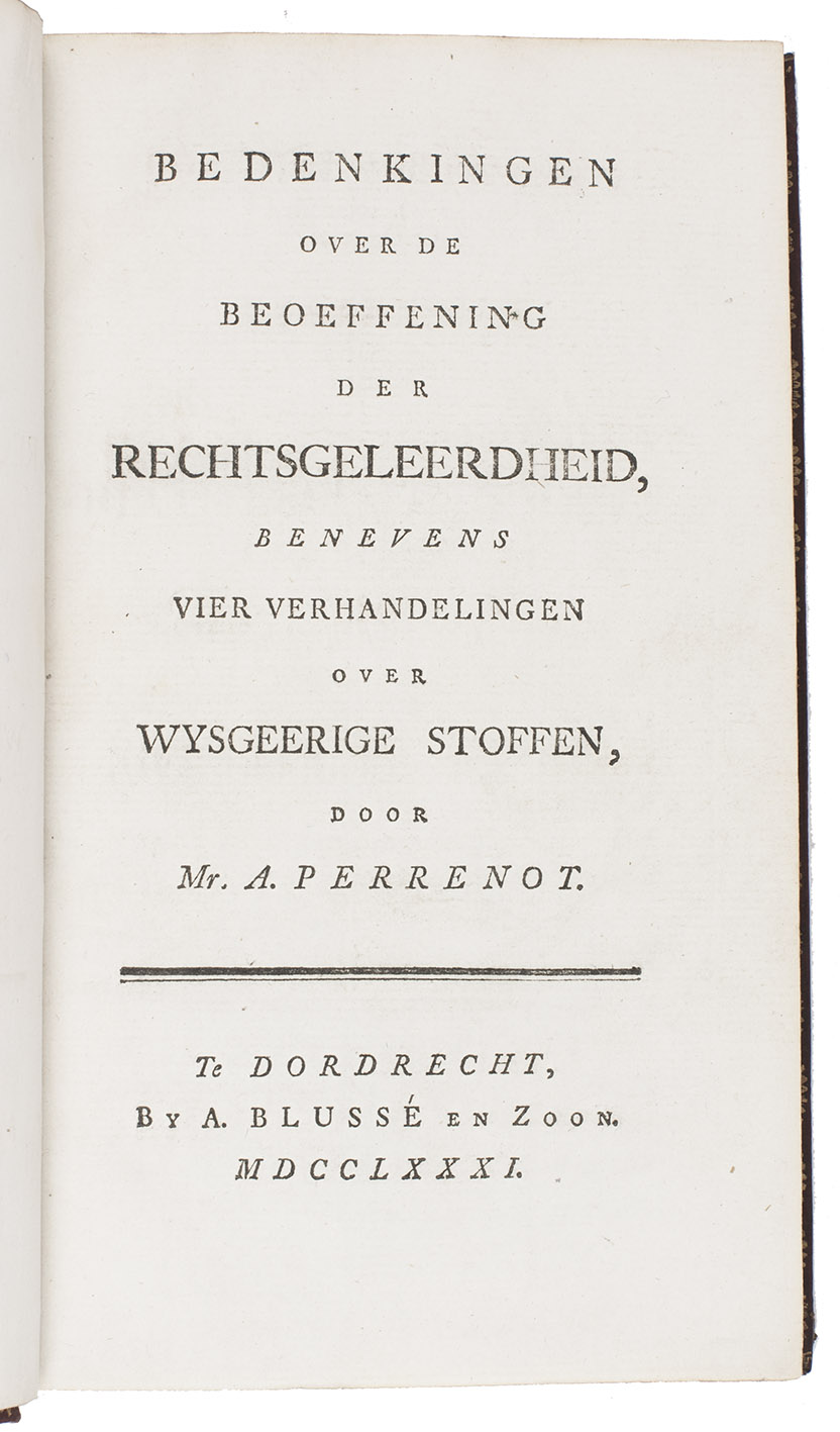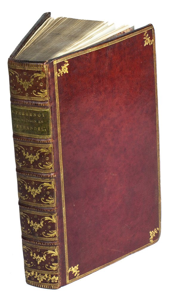 With the bookplate of Thomas Otho Travers (1785-1844), friend of Stamford Raffles. With some minor waterstain at the foot of the French treatise and the corners slightly bumped, otherwise in very good condition and well bound. Dekkers, Bibl. Belg. juridica, p. 133, no. 5; STCN (4 copies); WorldCat (6 copies, incl. 3 the same); ad 2: cf. Dekkers, p. 133, no. 4 (1779 ed.); Quérard VII, p. 63 (1775 ed.); for Perrenot: V.d. Aa XV, p. 205; for the binder: J. Storm van Leeuwen, "1725-1830 Bookbinding" on www.bibliopolis.nl.