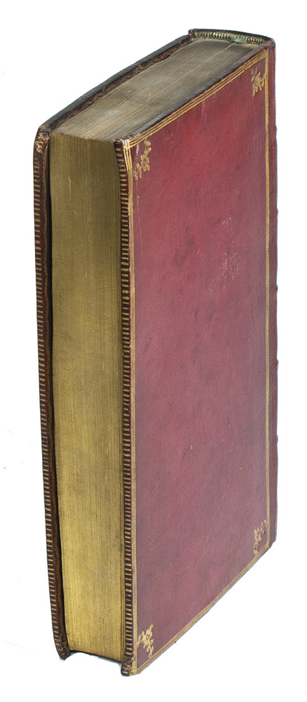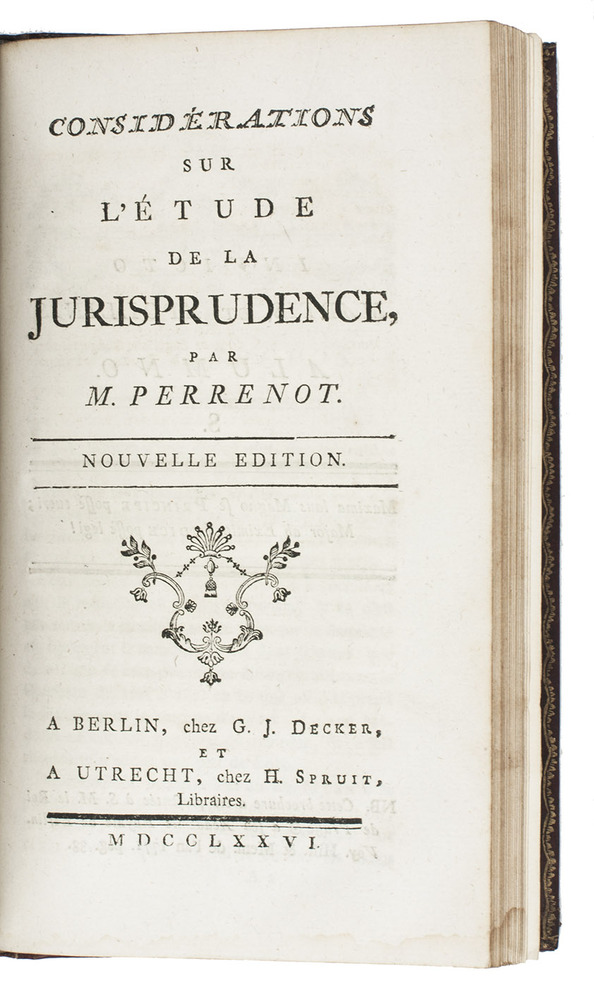 With: (2) PERRENOT, Abraham. Considérations sur l'étude de la jurisprudence, ... Nouvelle edition. Berlin, G.J. Decker; Utrecht, Henrikus Spruit, 1776. 2 works in 1 volume. 8vo. Contemporary red morocco, richly gold-tooled spine, gold-tooled boards (triple fillets, with floral ornaments in each corner), board edges and turn-ins, gilt edges. Bound by the Dutch court bookbinder Abraham van Rossum (active in Amsterdam 1812-1854), one of the "major binders" (Storm van Leeuwen) of that period, with his letterpress ticket on paste-down ("A.v. Rossum | hof-boekbinder"). 5, [1], 339, 5; 68 pp.