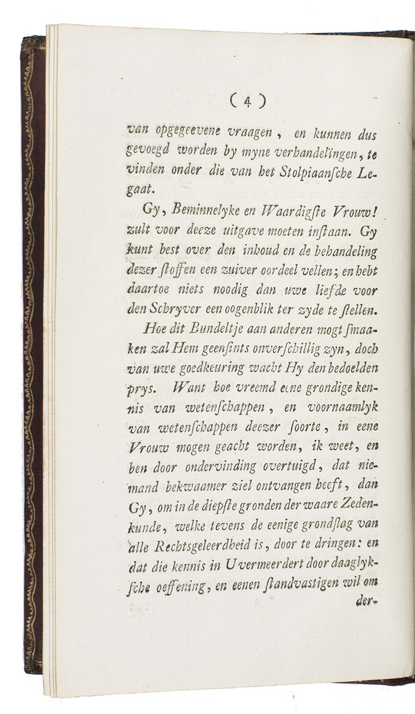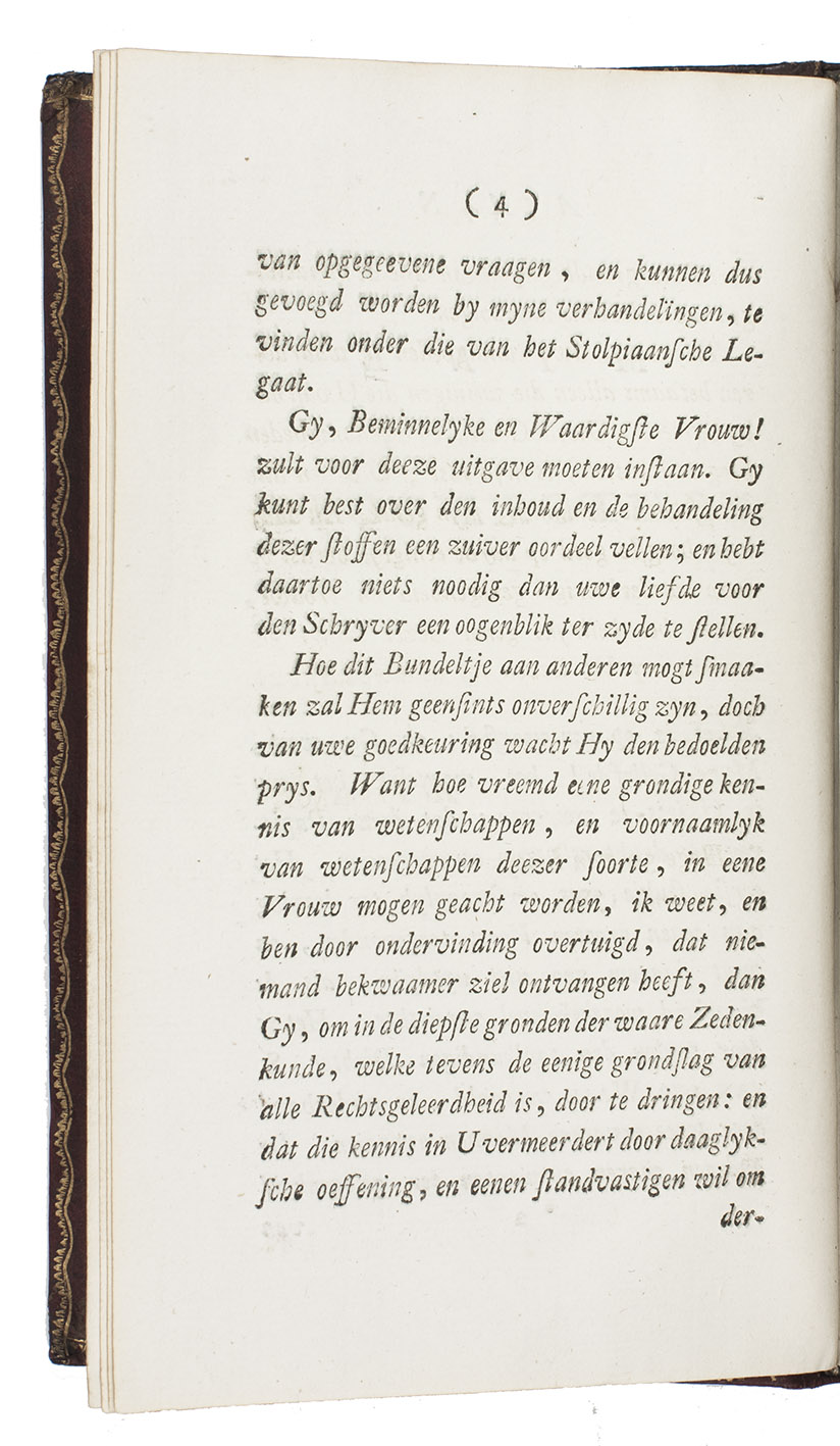 Rare first and only edition of the much expanded Dutch translation of a philosophical treatise for law students, on natural morality as the basis for all law, together with the second edition of the same treatise in the original French. The Monthly review (vol. LII, 1775, p. 596) praises the author's "penetration, wit, and erudition" but on the other hand the original treatise "is one of those productions, which even an attentive reader totally forgets the very moment he has done perusing it". The Dutch translation is followed by four other philosophical treatises by the author, also concerning natural law, discussing the problems of divine law, moral obligations, moral sense, and the question whether the existence of God can be proved by reason.